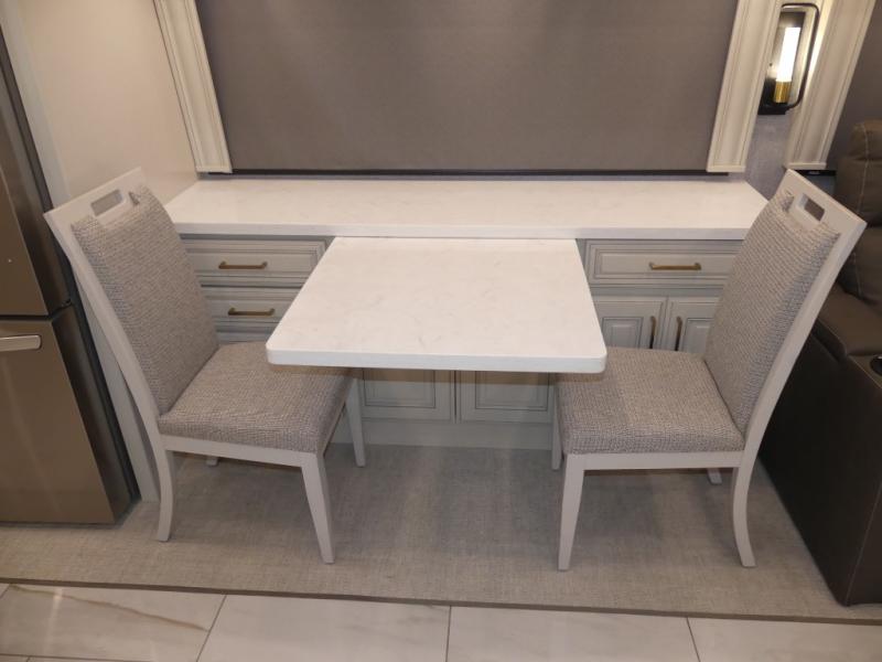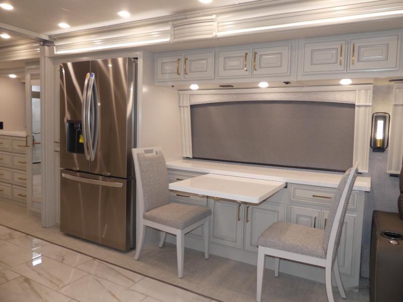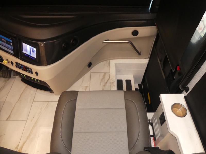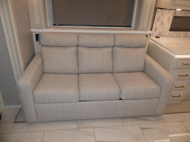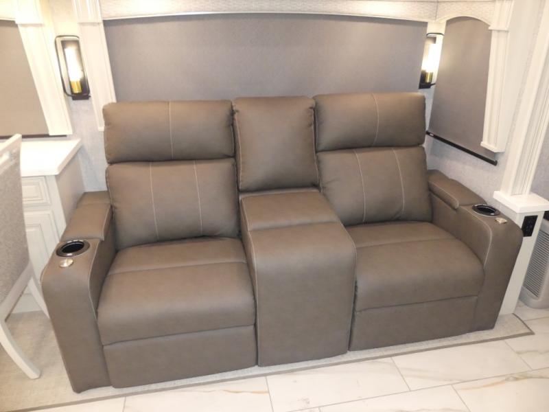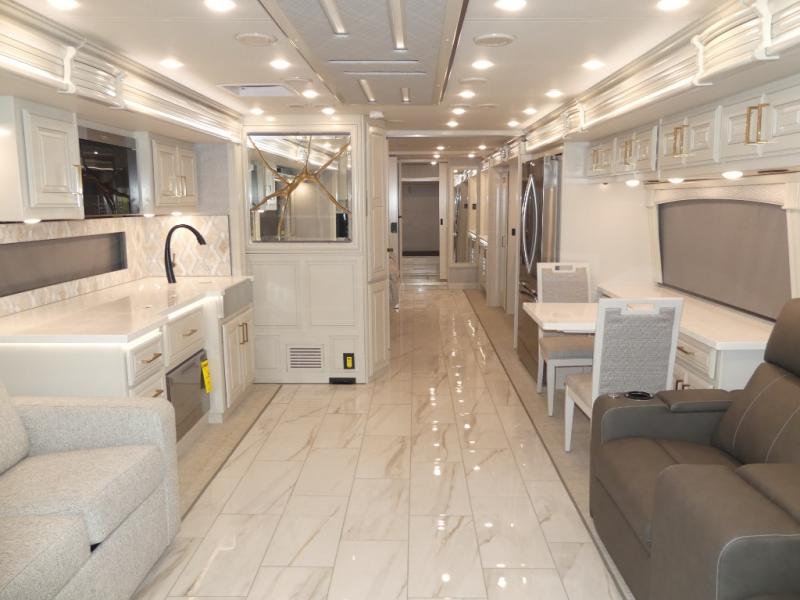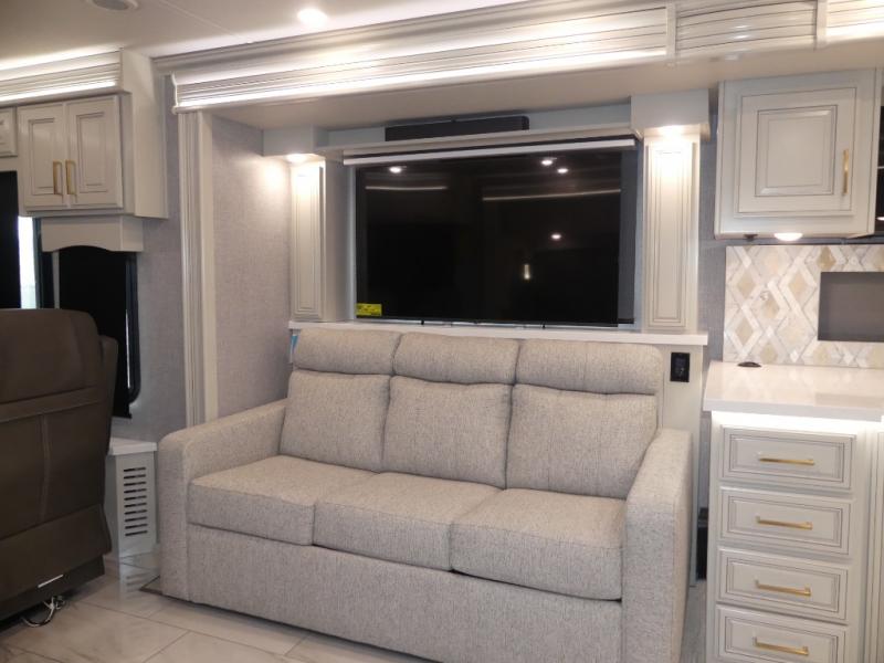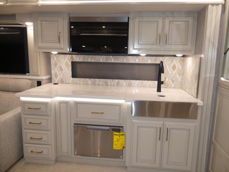 Head across the country or state in this spacious coach! The motion power lounge provides a comfy place to relax, and the sleeper sofa with a full-size mattress will be perfect for guests. The full kitchen includes a two burner induction cooktop and stainless steel over-the-range convection microwave to cook meals, plus a dishwasher for easy clean-up and a residential refrigerator for food storage. You will love having a king bed slide out to sleep on, along with dual bedroom wardrobes and a dresser to keep your clothes tidy. The mid-coach half bath is easily accessible for everyone to use, and the full rear master bath is sure to be a big bonus. Here, you'll find dual bath sinks, a spacious shower, and a walk-in closet with tons of storage and a stackable washer and dryer. This coach also includes LED TVs to keep you entertained, including an exterior entertainment center with a Bluetooth soundbar!