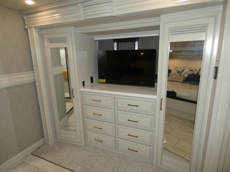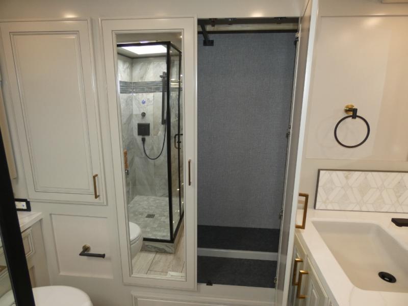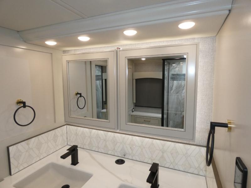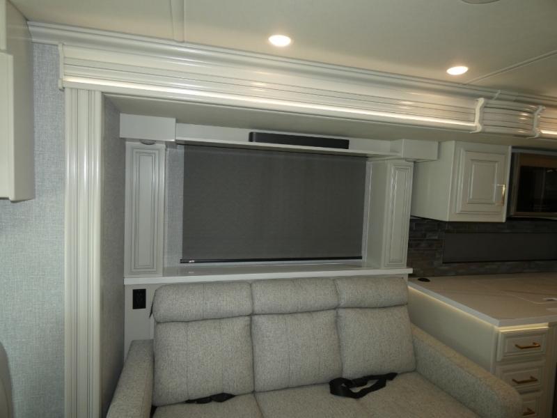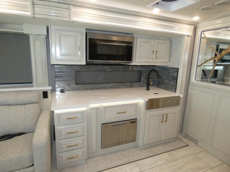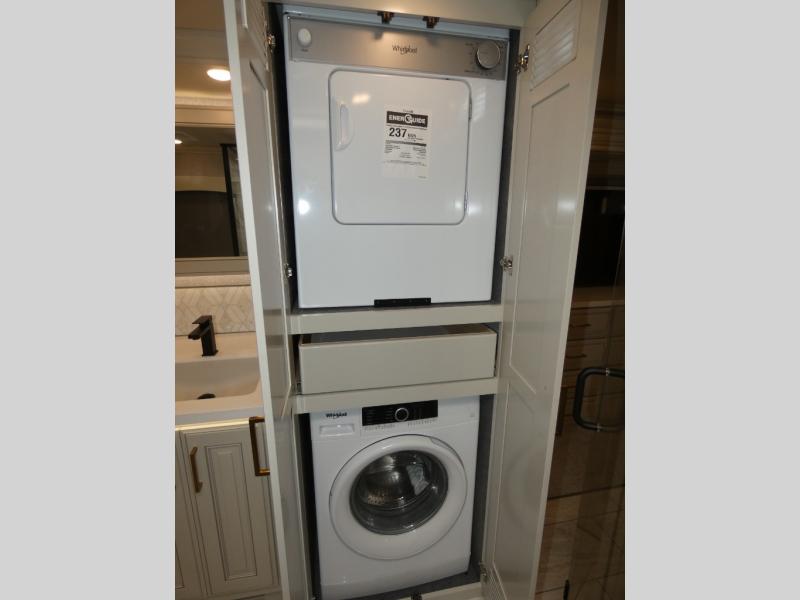 Head across the country or state in this spacious coach! The motion power lounge provides a comfy place to relax, and the sleeper sofa with a full-size mattress will be perfect for guests. The full kitchen includes a two burner induction cooktop and stainless steel over-the-range convection microwave to cook meals, plus a dishwasher for easy clean-up and a residential refrigerator for food storage. You will love having a king bed slide out to sleep on, along with dual bedroom wardrobes and a dresser to keep your clothes tidy. The mid-coach half bath is easily accessible for everyone to use, and the full rear master bath is sure to be a big bonus. Here, you'll find dual bath sinks, a spacious shower, storage space, and a stackable washer and dryer. This coach also includes LED TVs to keep you entertained, including an exterior entertainment center with a Bluetooth soundbar!