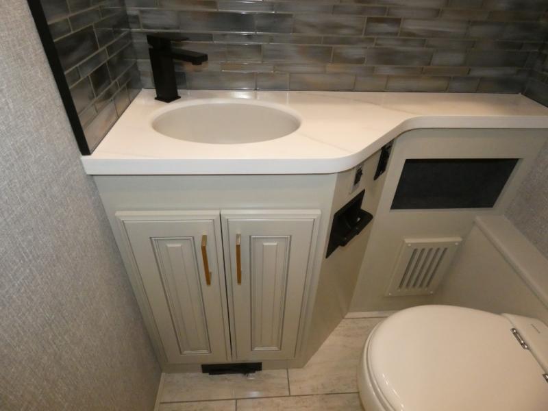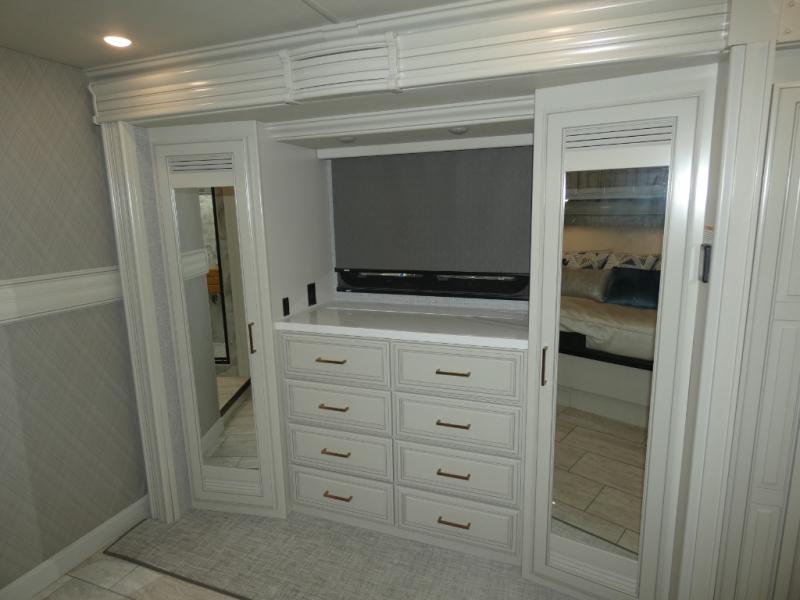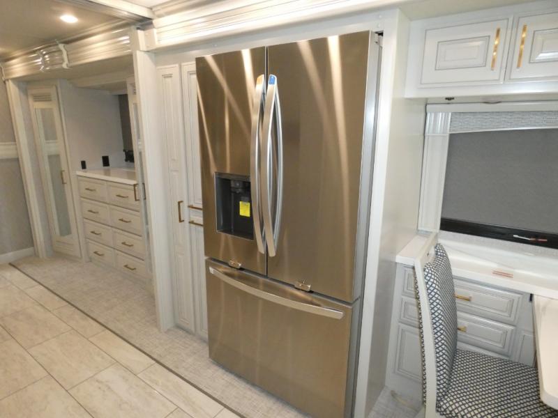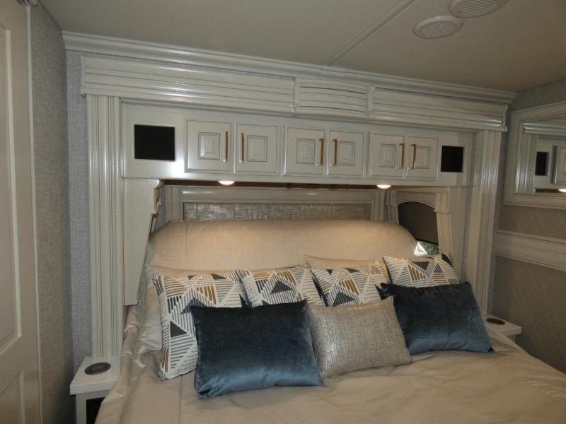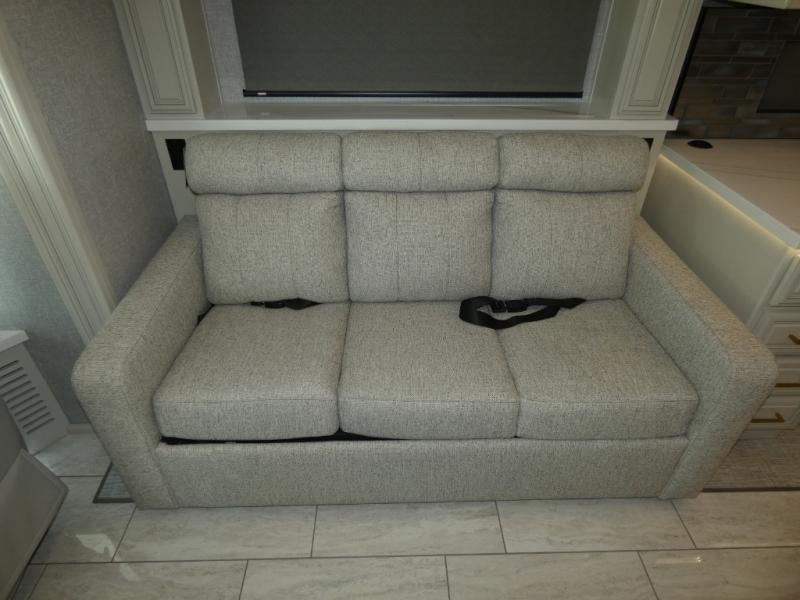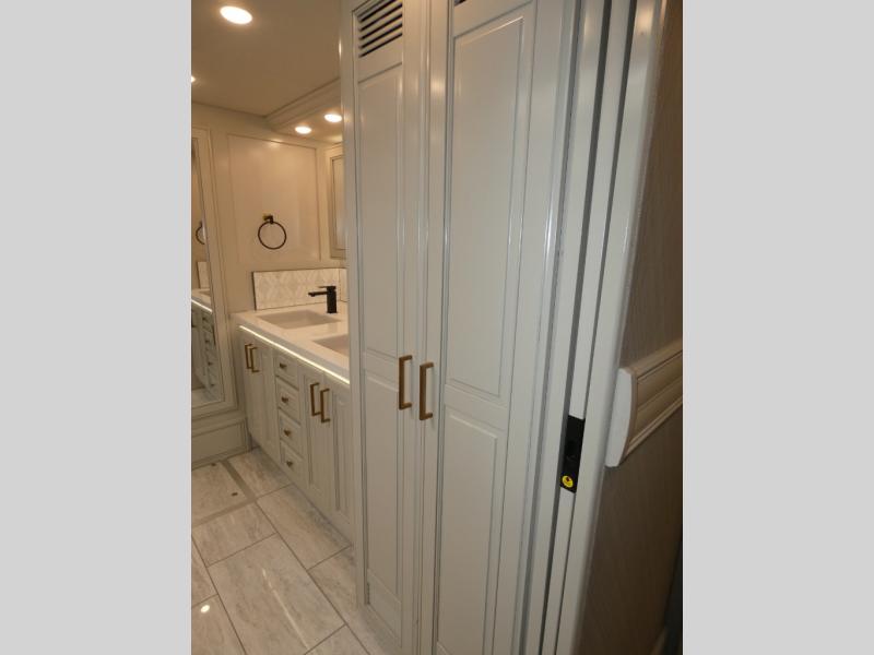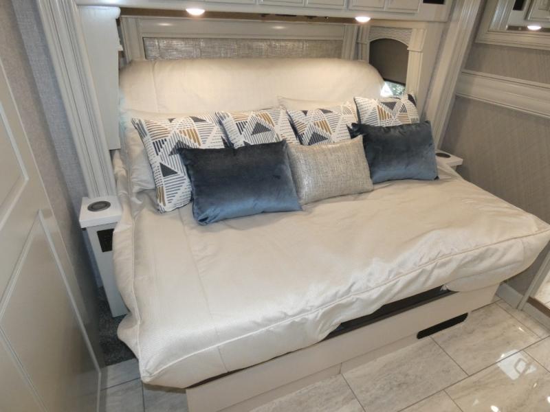 Head across the country or state in this spacious coach! The motion power lounge provides a comfy place to relax, and the sleeper sofa with a full-size mattress will be perfect for guests. The full kitchen includes a two burner induction cooktop and stainless steel over-the-range convection microwave to cook meals, plus a dishwasher for easy clean-up and a residential refrigerator for food storage. You will love having a king bed slide out to sleep on, along with dual bedroom wardrobes and a dresser to keep your clothes tidy. The mid-coach half bath is easily accessible for everyone to use, and the full rear master bath is sure to be a big bonus. Here, you'll find dual bath sinks, a spacious shower, storage space, and a stackable washer and dryer. This coach also includes LED TVs to keep you entertained, including an exterior entertainment center with a Bluetooth soundbar!