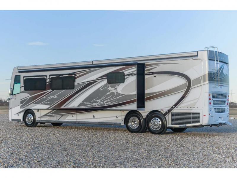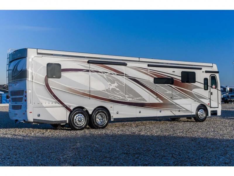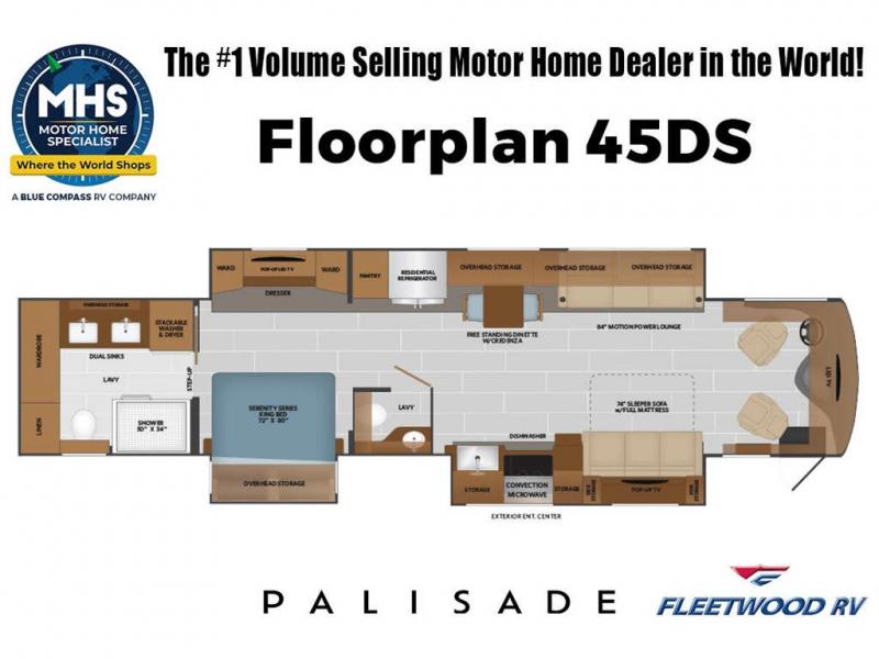 MSRP $709,856. All New 2025 Fleetwood Palisade 45DS Bath & 1/2 for sale at Motor Home Specialist; the #1 Volume Selling Motor Home Dealership in the World. This RV is approximately 44 feet 8 inch in length featuring 3 slides with a full wall slide and features all-new exterior graphics and paint colors, stackable washer/dryer, king bed, residential refrigerator, a large living area, Vacu-Bonded floors, walls and ceilings, the Exclusive Freedom Bridge® w/Freightliner® Custom Chassis XCM, tire pressure monitoring system, heated fresh water and holding tank compartments, Molded-Fiberglass one-piece roof, fiberglass rear cap, slideout awning toppers above all slideouts, automatic hydraulic leveling jacks, automatic entrance steps, 7-way round tow connection, front and rear mud flaps, automotive one piece bonded windshield, floor heat, porcelain tile flooring, 2800W pure sine inverter, whole coach water filtration system, Aqua-hot 450D, auto gen start, central vacuum system, full extension drawer guides, and keyless entry. This well appointed RV also features the optional brushed bronze hardware, roof mounted patio awning, drop down bunk, technology package, exterior freezer, heated tile floor, blind spot detection, full bay slide, window awning package and booth dinette. For additional details on this unit and our entire inventory including brochures, window sticker, videos, photos, reviews & testimonials as well as additional information about Motor Home Specialist and our manufacturers please visit us at MHSRV.com or call 800-335-6054. At Motor Home Specialist, we DO NOT charge any prep or orientation fees like you will find at other dealerships. All sale prices include a 200-point inspection, interior & exterior wash, detail service and a fully automated high-pressure rain booth test and coach wash that is a standout service unlike that of any other in the industry. You will also receive a thorough coach orientation with an MHSRV technician, a night stay in our delivery park featuring landscaped and covered pads with full hook-ups and much more! Read Thousands upon Thousands of 5-Star Reviews at MHSRV.com and See What They Had to Say About Their Experience at Motor Home Specialist. WHY PAY MORE? WHY SETTLE FOR LESS?