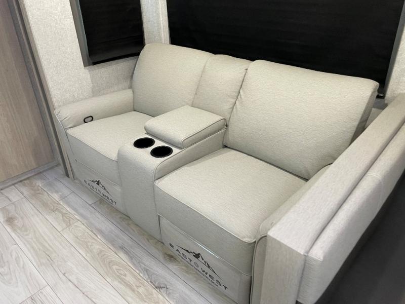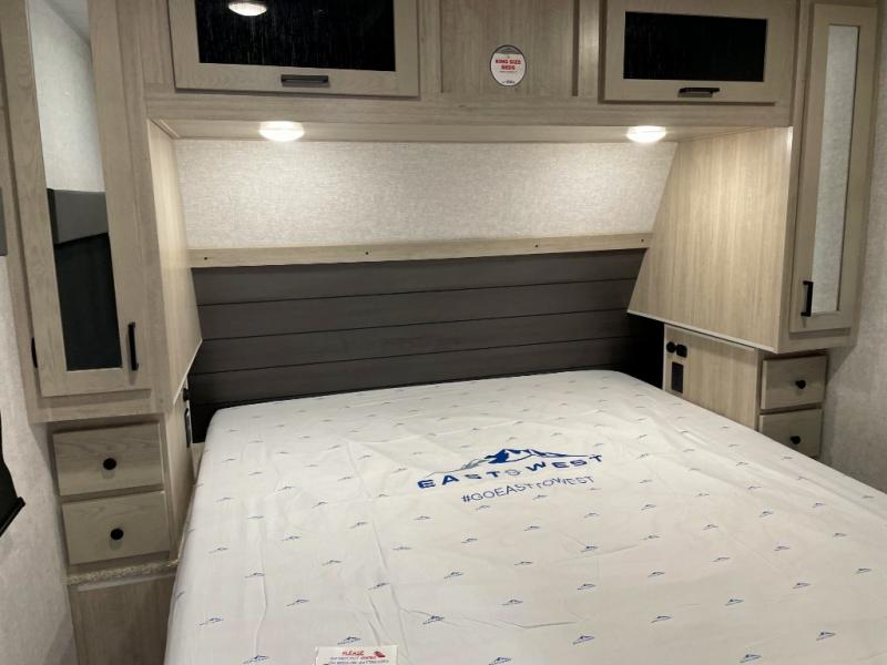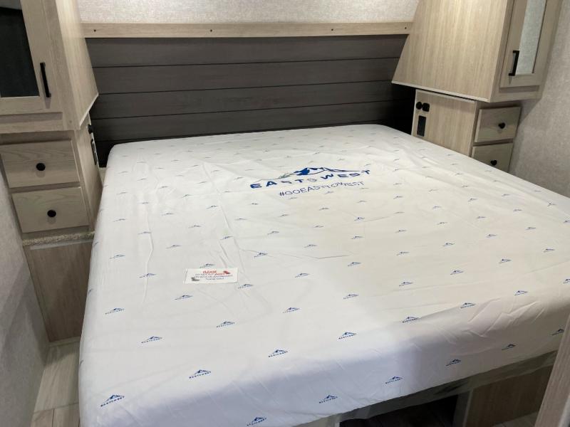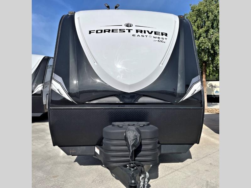 Each Alta travel trailer or toy hauler by EAST TO WEST is constructed with a 5" vacuum bonded roof, an enclosed and heated underbelly, and diamond plate front rock guard for added protection. Outside, you'll find marine-grade exterior speakers, a universal docking station, and back-up camera prep that can be added to make maneuvering in and out of campgrounds easier than ever. Inside, there are 4k interior LED lights, solid pressed membrane countertops, black roller shades, and many more interior comforts you are sure to love.