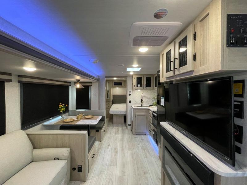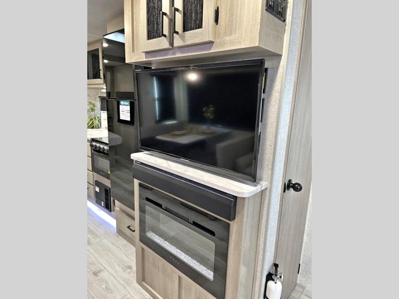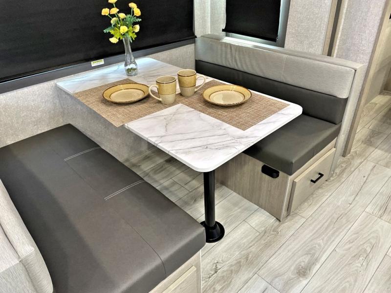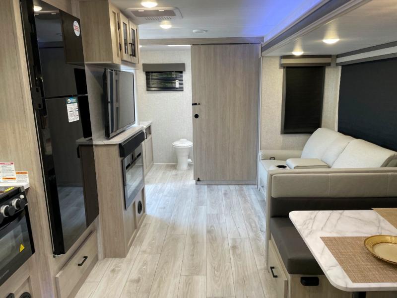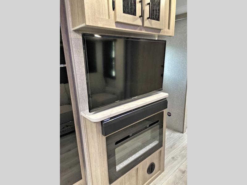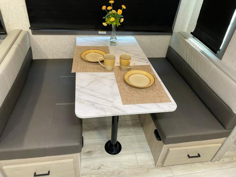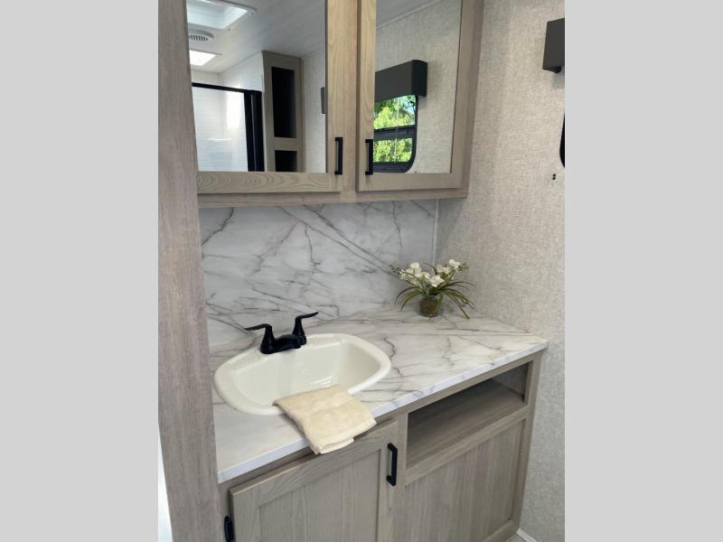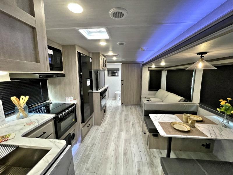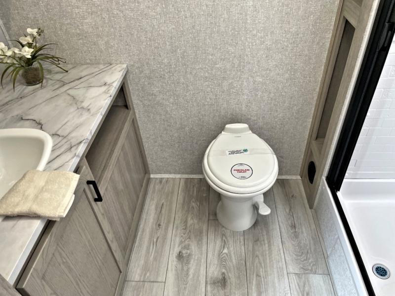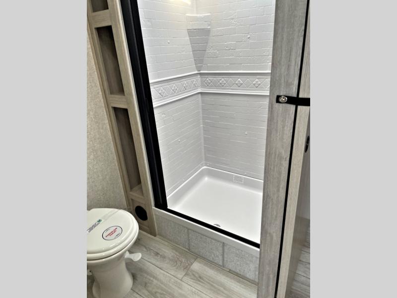 Wow! Check out the spacious full rear bath in this travel trailer for five! You'll appreciate a linen closet here and a shower skylight to let natural light in. Your crew can get comfortable on the tri-fold sofa that sits directly across from the fireplace for a more cozy feel. There is also a booth dinette here with storage space underneath for board games. Head to the kitchen to prepare dinner on the three burner cooktop, and use the countertop extension to cut fresh fruits and vegetables. A front private bedroom with a king bed and dual wardrobes will have you feeling right at home. Start camping today!