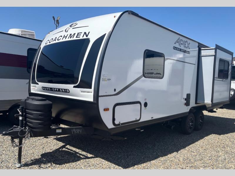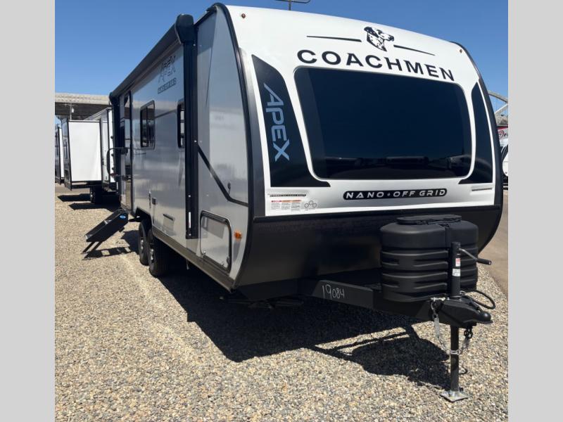You will find comfort, convenience, and a sturdy construction with each of these Coachmen RV Apex Nano travel trailers! They are held together with an aluma-cage construction, an I-beam chassis, plus vacuum-bonded laminated dual Azdel fiberglass walls for double the protection against the elements. The 200-watt solar panel with a 30 amp control charger is included within the Off-Grid Package, along with two 20 lb. LP tanks, a high velocity power roof vent, plus 12V outlets to keep you powered up. More exterior feature include a hot/cold shower, four stabilizer jacks, a power awning with LED lighting, and magnetic baggage door catches to easily pack and unload your gear. You will love the interior of your Apex Nano with Congoleum residential flooring, one-piece seamless edge countertops, matte black hardware in the galley, and a hand-crafted wood medicine cabinet in the bath.