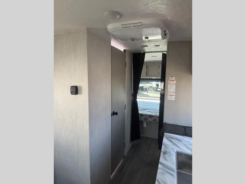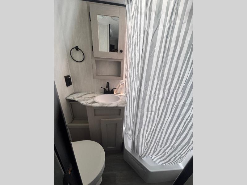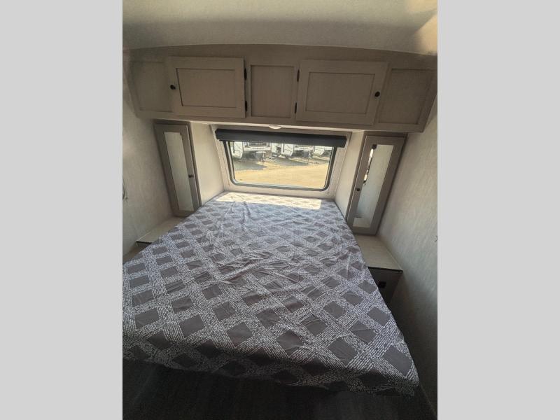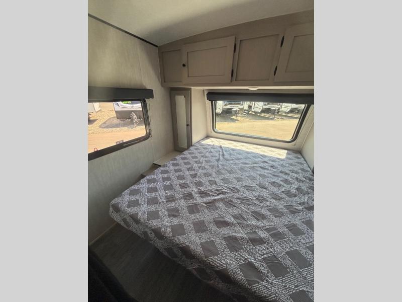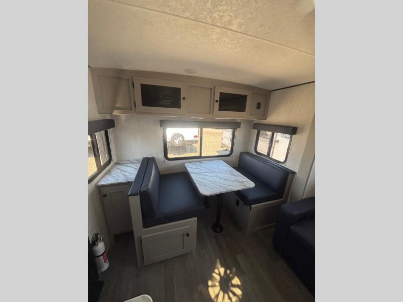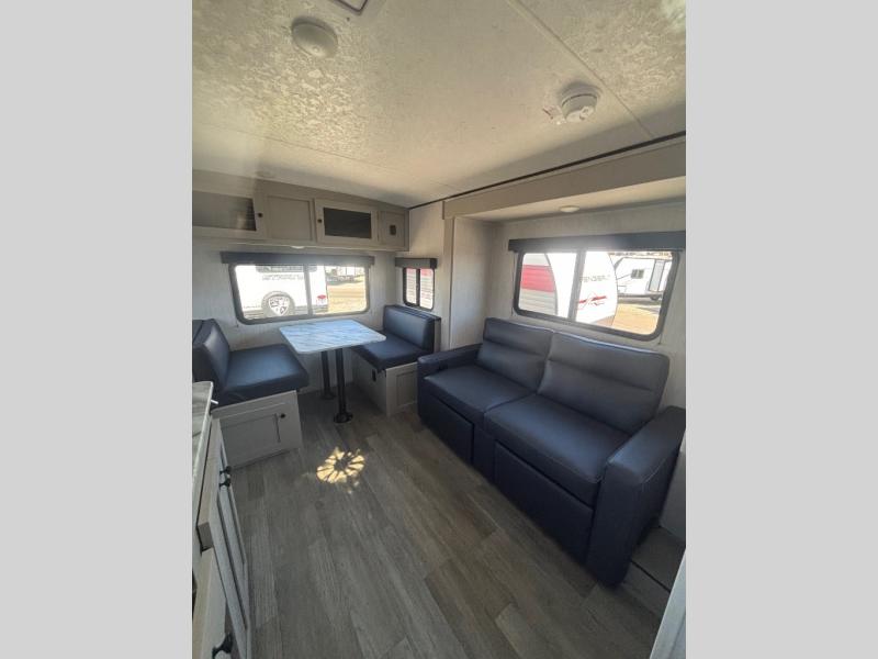 Escape the hustle and bustle of everyday life with this travel trailer! You will start each morning feeling recharged after sleeping on the front queen bed with wardrobes on either side to keep your clothes looking nice. The full bathroom has a neo-angled shower for you to freshen up and a medicine cabinet to store your toiletries. The sofa slide is across from the entertainment center for a comfortable movie night if you add your own TV, or you can play some card games at the rear booth dinette with an end table on one side.