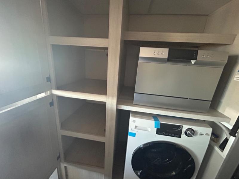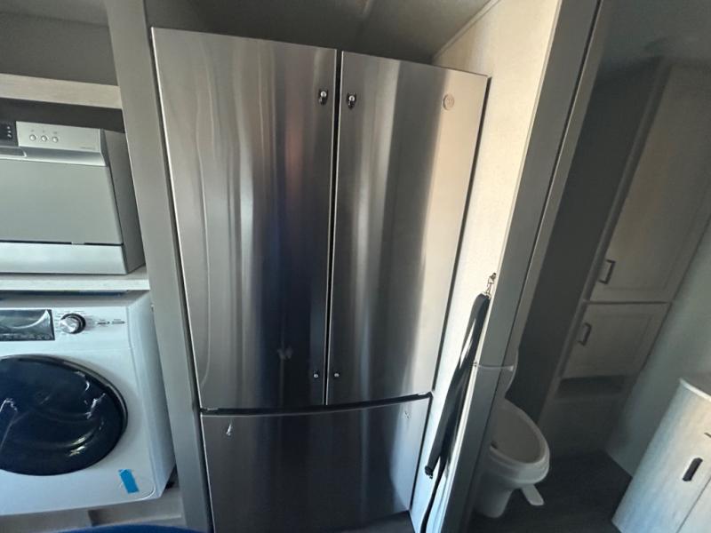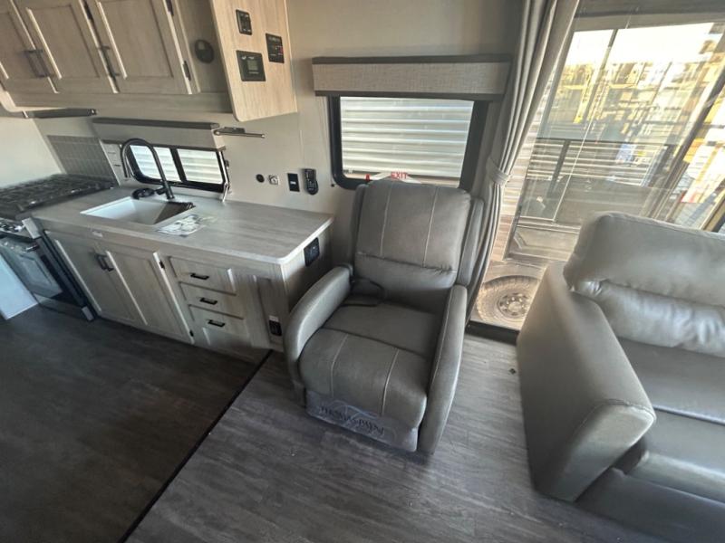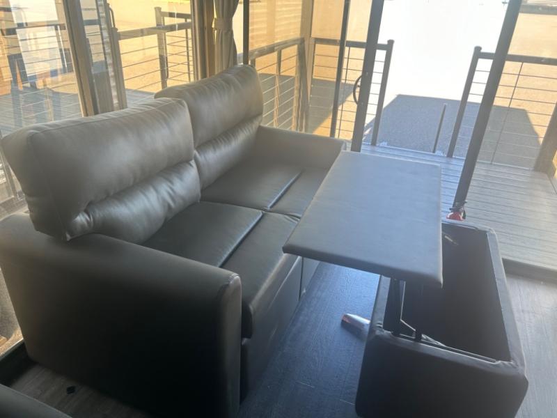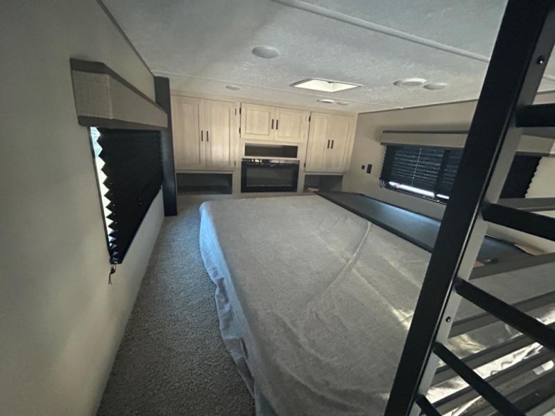 This destination trailer will make extended stays easier than ever. The rear deck will be a favorite place to relax each day, and there is a patio door that will lead into the main living area. Here, you'll enjoy a tri-fold sofa plus a lift top table and an ottoman. There is a lounge recliner where you can catch up on some reading, and the storage closet can hold games, extra blankets, and more. The main floor of this unit includes the kitchen with plenty of counter space, a pantry, and a residential refrigerator to keep cold items stocked. Your crew can get cleaned up each day in the front bath that features a spacious shower with a seat, a wardrobe closet, plus a linen closet for clean towels. The main loft steps that lead up to it, along with a king-size bed, storage closets, plus a fireplace! There is even a second loft above the rear deck with a queen-size bunk mattress, a removable ladder and a railing!