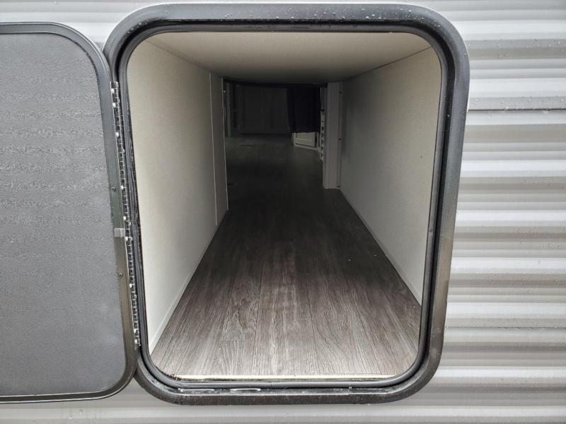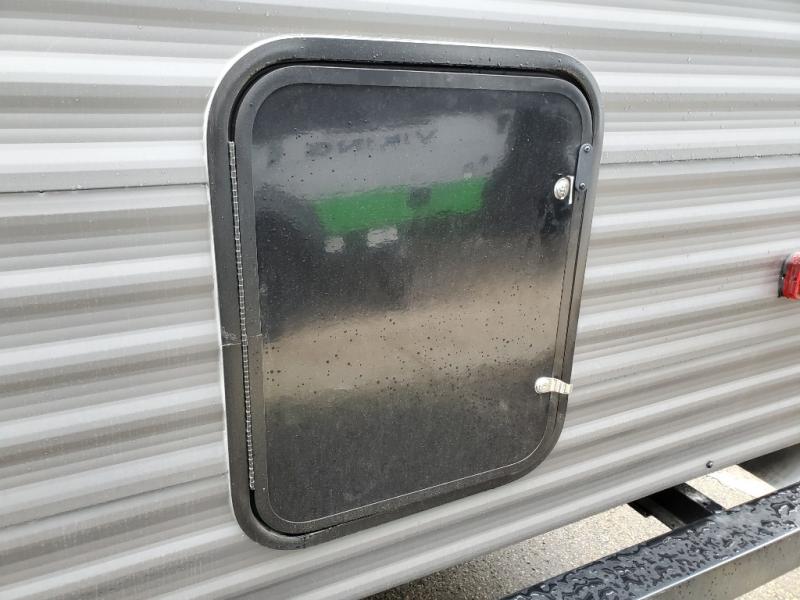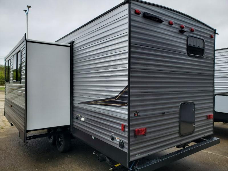 Everyone will have a comfortable time camping in this travel trailer! It features a set of double sized bunk beds for the kids or guests to sleep on and are conveniently next to the rear corner bathroom which has a tub/shower with a skylight above for added natural lighting. The booth dinette and sofa slide opens up the kitchen area so you have more space to prepare your best meals with the three burner cooktop. When you're ready to wind down your nights, grab a snack from the large pantry, a beverage from the 10.7 cu. ft. refrigerator, and place your drink in the cupholder/arm rest of the sofa while you watch a movie at the entertainment center!