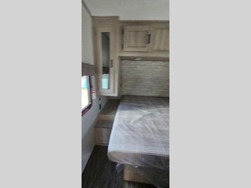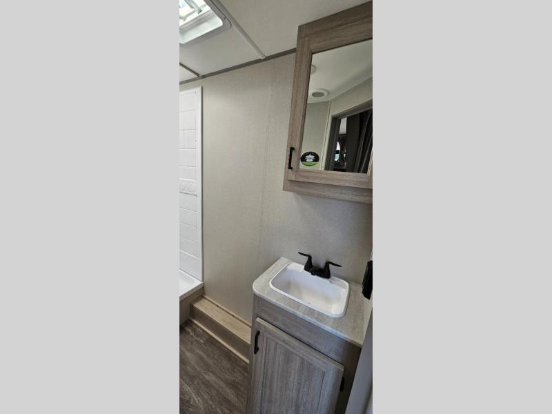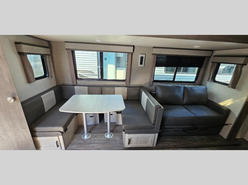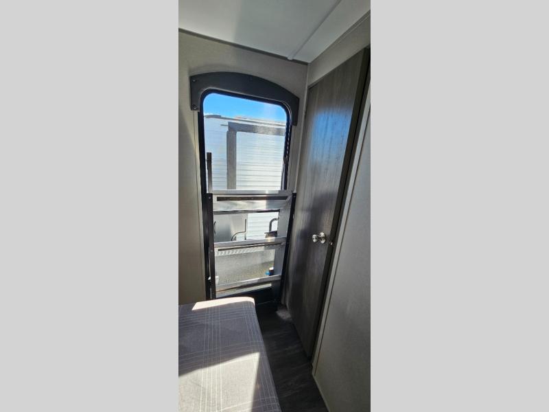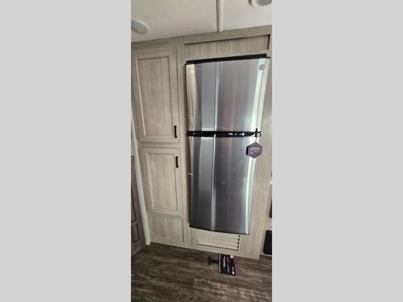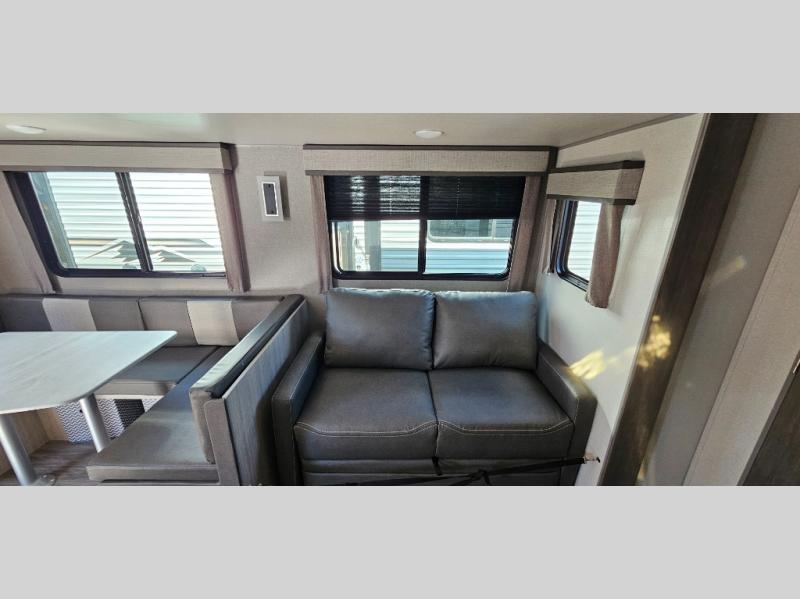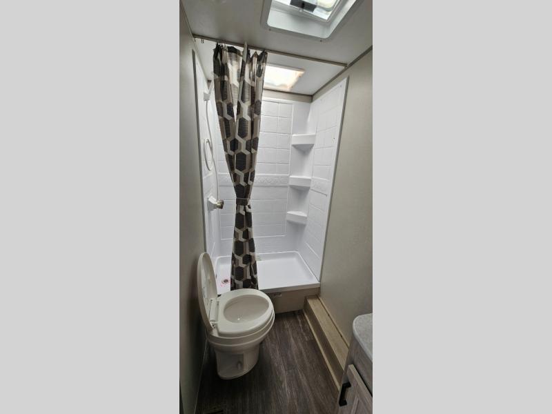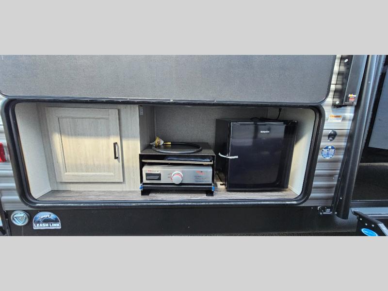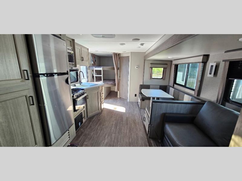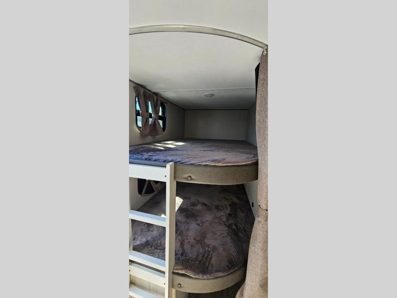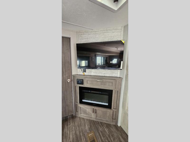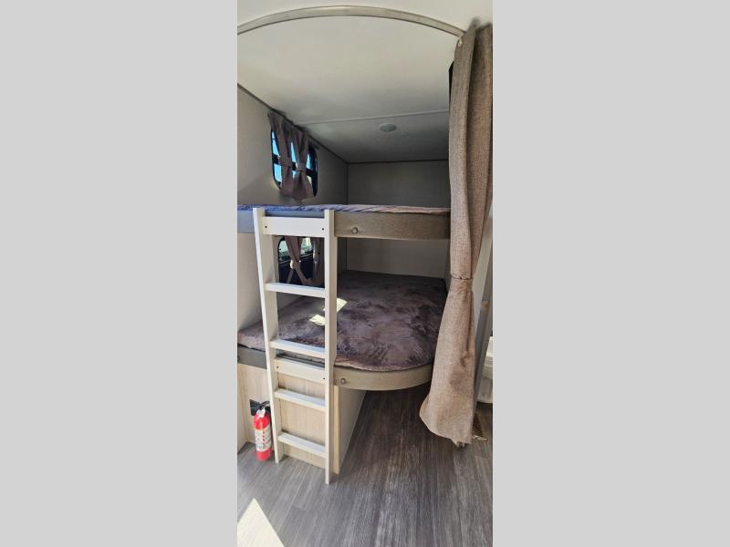 Life is easier in this travel trailer with dual entry doors! One of the entrances leads directly into the front private bedroom which has a 60" x 74" queen bed with wardrobes on either side to hang your clothes and a coat closet. The second entrance is right by the double-size bunks and rear corner bathroom that has a tub/shower with skylight above for a shower with a view when you look up. The living area has everything you need for a cozy evening indoors between the 68" sofa with an arm rest/cupholder to set your drink while you enjoy the optional fireplace at the entertainment center or you can play a few card games at the U-shaped dinette. Cook a sunrise breakfast at the outside camper kitchen with the pull out griddle, a cabinet for storage, and a refrigerator for cold orange juice!