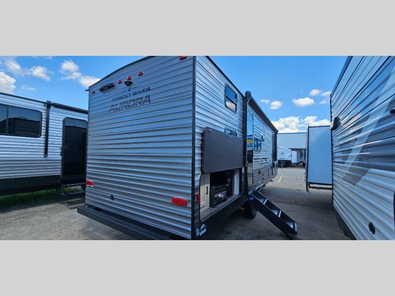 Comfortability, usability, and quality is what you will find in each one of these Forest River Aurora travel trailers, toy haulers or destination trailers! They are designed with a superior build and packed full with industry leading, functional, and distinctive standard features. SolidStep entrance steps and a Safe-T rail door assist on main entry door to help you safely enter and exit the unit. The diamond plate rock guard will protect your unit from road debris and the nitrogen filled radial tires, which keep their pressure longer, offer better fuel economy. You will also find upgraded JBL Elite exterior speakers outside, an electric awning with multicolor lights and remote, plus flush mount baggage doors for easy packing. The interiors are beautifully designed with a deep undermount farm style sink, stainless steel appliances, and linoleum flooring in the slide outs which will be easy to clean. Come find your favorite model today!