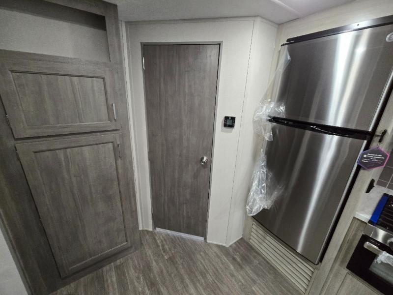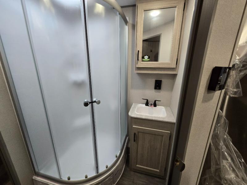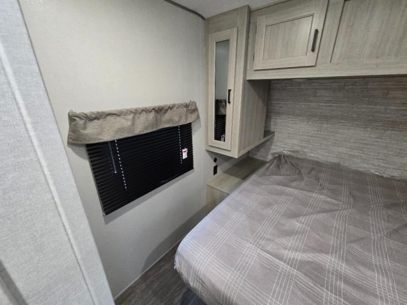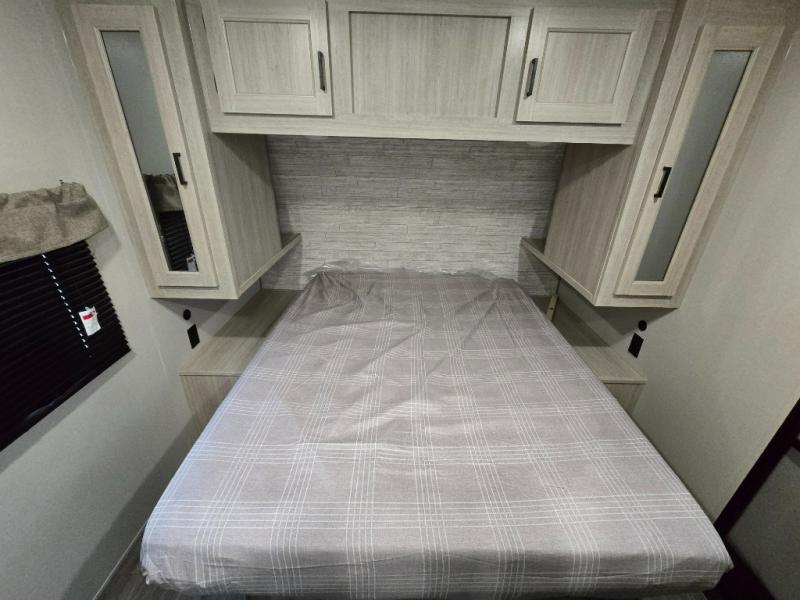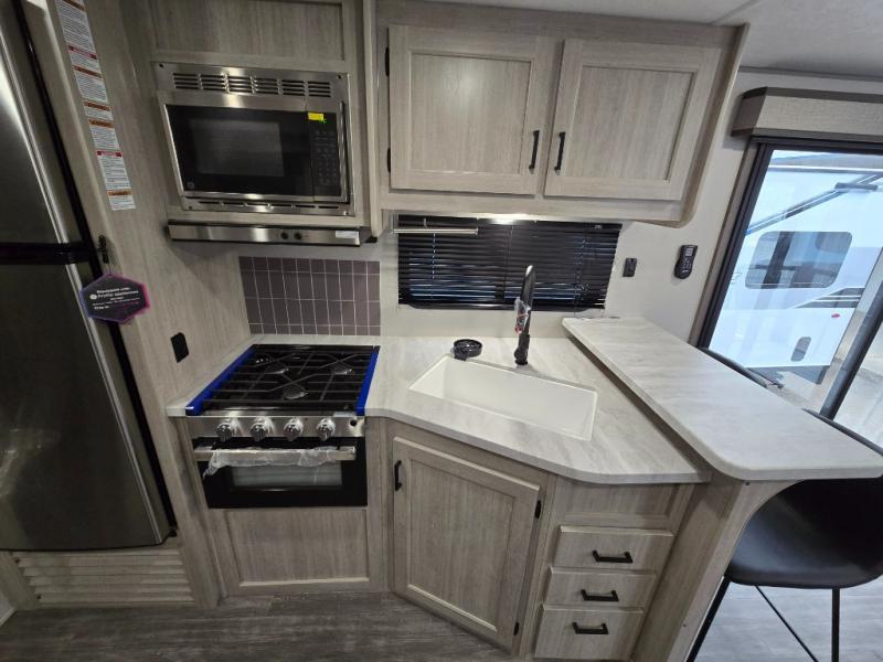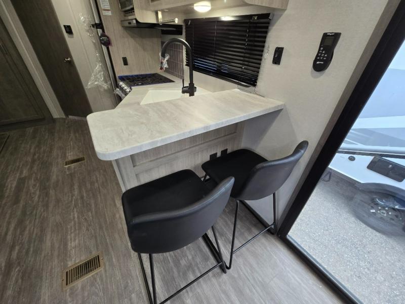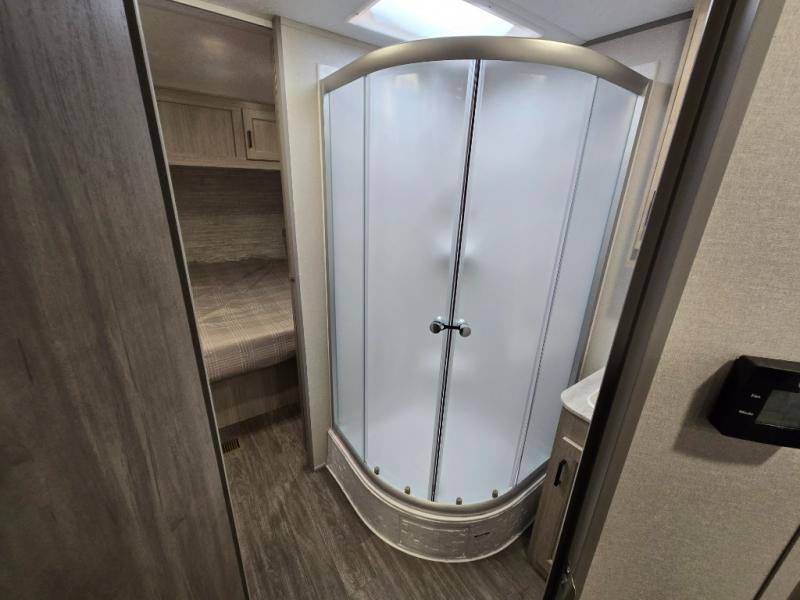 If you are looking for comfort this travel trailer is the one for you due to the amazing front bedroom. Have a relaxing time on the queen bed, which has dual bedside wardrobes and an overhead shelf perfect for storing all your belongings. Moving to the living room, you can take a rest on the 60" sofa jack knife or if you prefer, have a drink or two on the bar top for those hot days. Also for days where the temperature rises, take a refreshing shower in the full bathroom. Finally, this model has an optional 38" dinette, ideal to share your everyday meals with your loved ones.