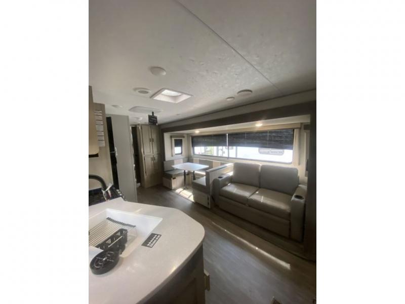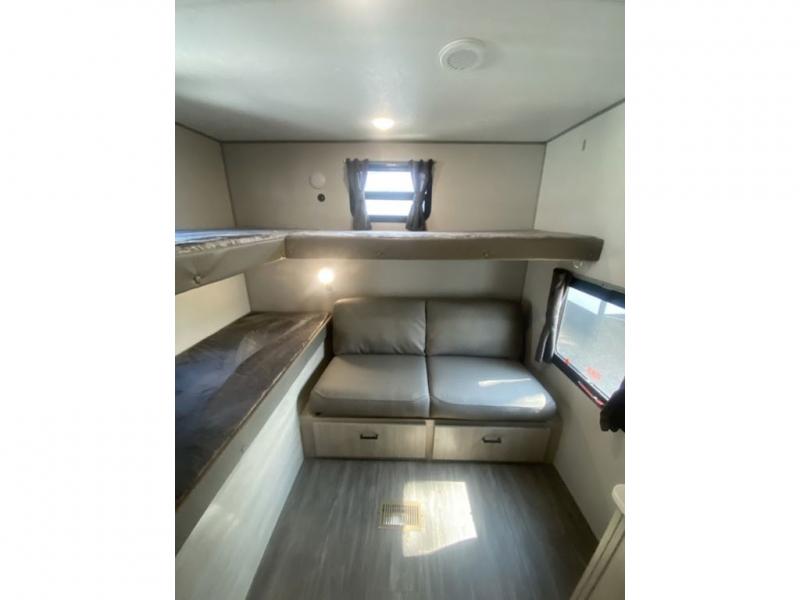 The rear private bunkhouse in this travel trailer is perfect for the kids or guests! It has a set of bunk beds, an upper bunk above a jackknife sofa, a TV cabinet, and a wardrobe to keep their clothes out of the way. The full bathroom is just outside the bunkhouse and has a tub/shower with a skylight above for natural lighting as you get ready. The chef can prepare their best meals with the three burner cooktop and everyone can enjoy them at the U-shaped dinette. The 68" sofa is conveniently near the optional fireplace and entertainment center. The front private bedroom has a 60" x 74" queen bed to lay your head on at night and wardrobes on either side of it to keep your clothes out of the way and looking their best!