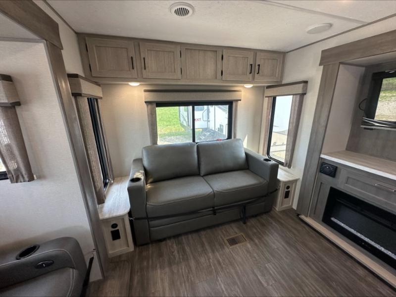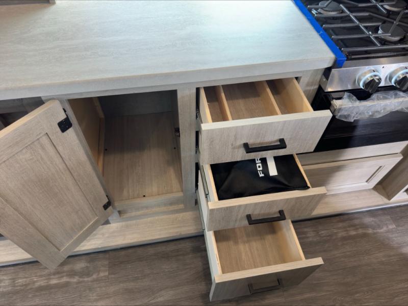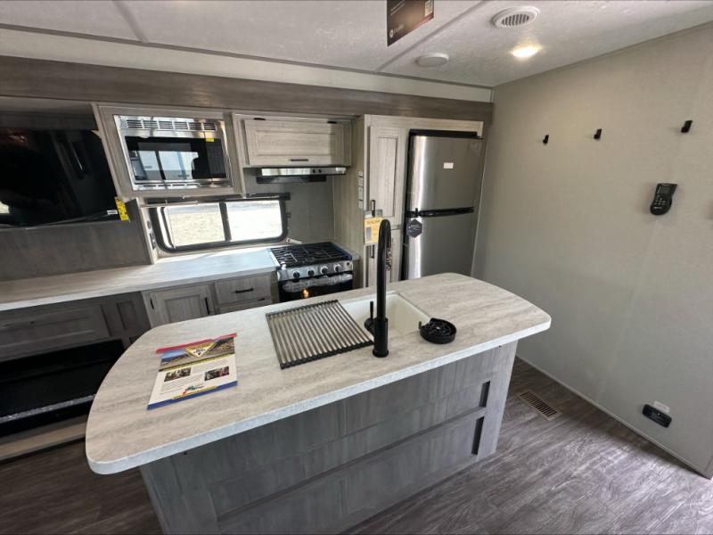 This travel trailer will feel a little more like home with its front private bedroom that includes a 60" x 74" queen bed, plus two closets for storage. And one of the closets includes washer and dryer prep if you choose that option. The rear living area will be a favorite hangout spot with its 68" sofa, theater seating, and entertainment center, plus there is a booth dinette for dining or game night. A kitchen island comes standard, along with a 12V 10.7 cu. ft. refrigerator, a three burner cooktop, plus a microwave oven; everything you need to make home-cooked meals!