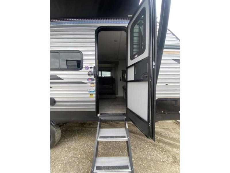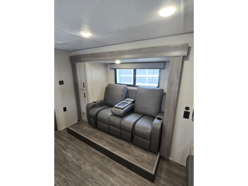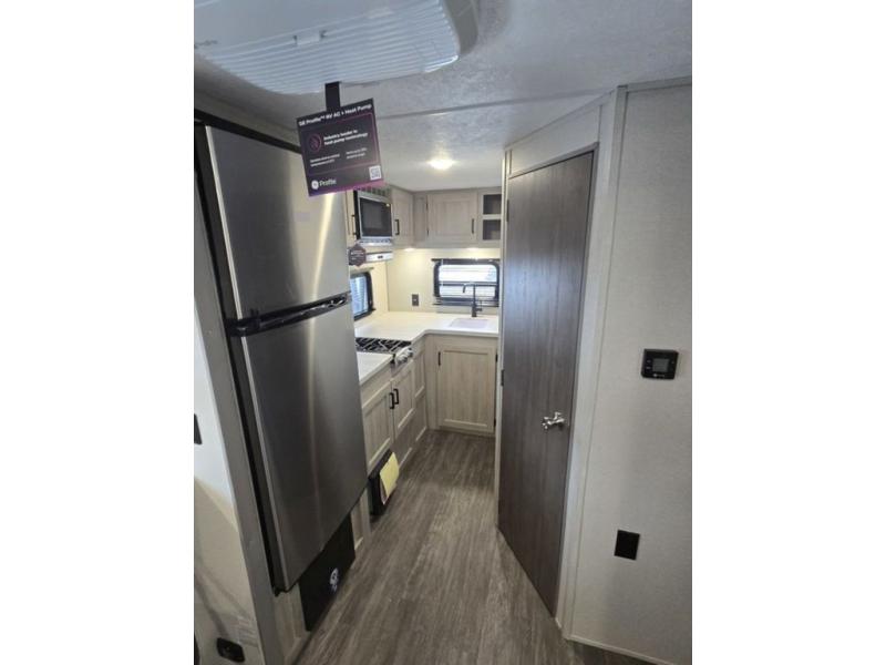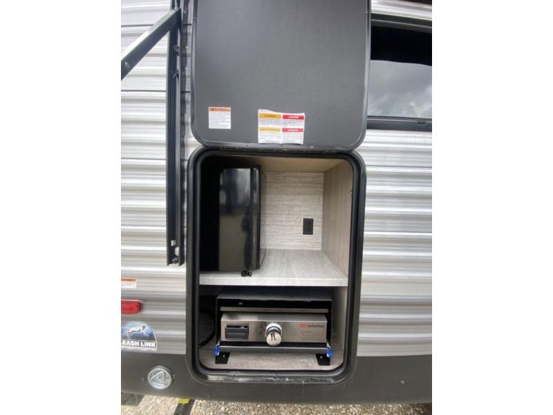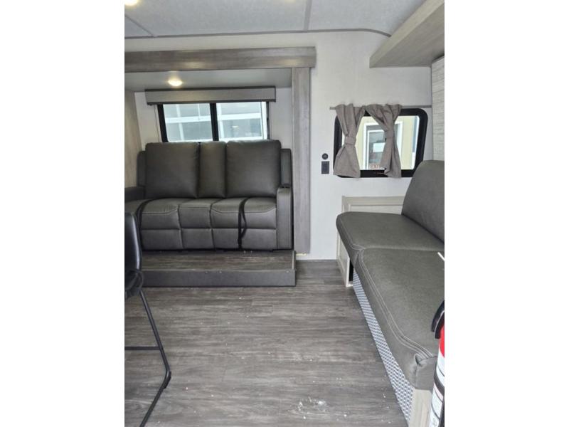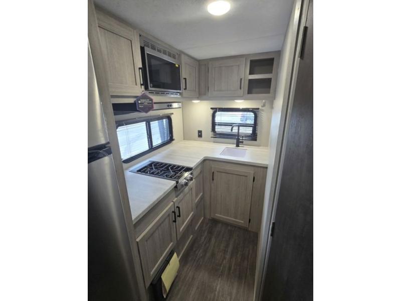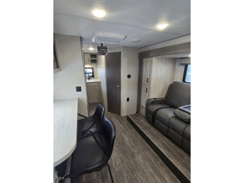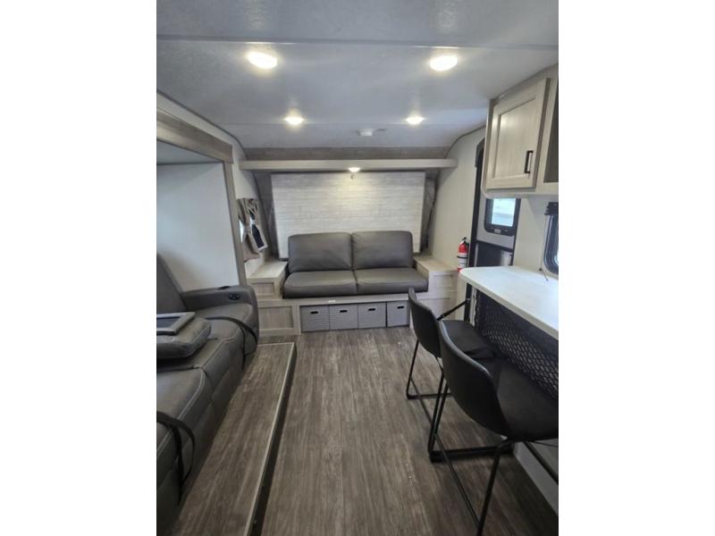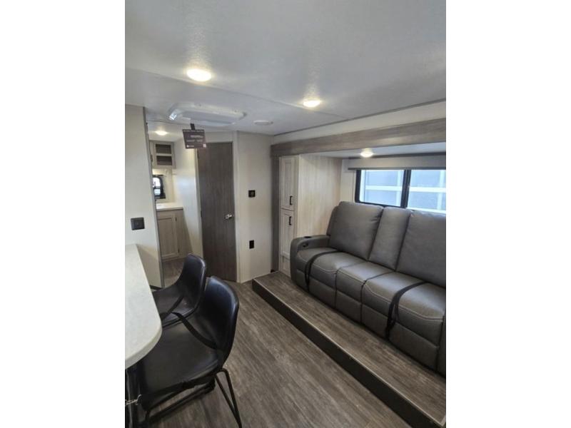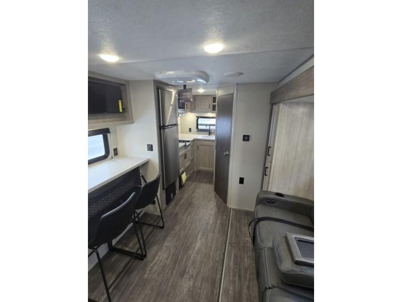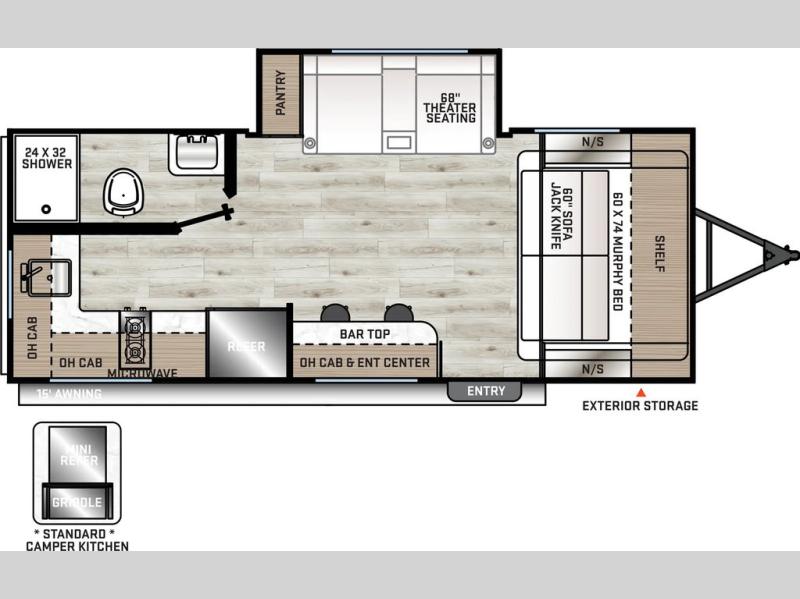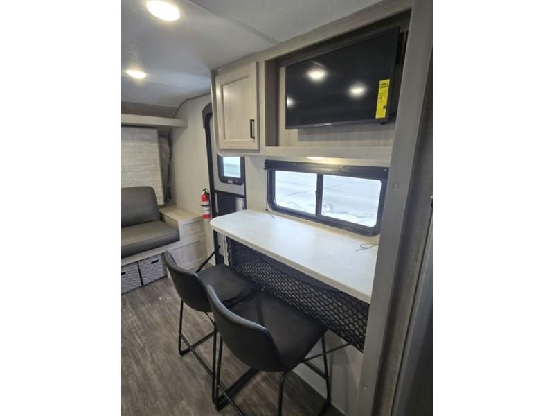 Each camping trip will be one to remember in this single slide out travel trailer! When the Murphy bed is folded away, you can relax on the 60" jack knife sofa, and you'll find dual nightstands and an overhead cabinet to keep this space tidy. A bar top with storage and two stools provides a place to enjoy meals together, and the theater seating has dual end tables to set your drinks on when you're relaxing. This model features a rear corner kitchen with generous counter space to prep meals and a 10.7 cu. ft. 12V refrigerator for food storage. If the weather is nice, you may just find yourselves outside at the camper kitchen with a griddle and mini refrigerator!