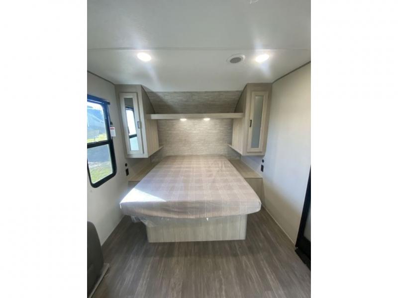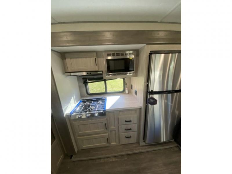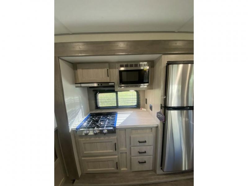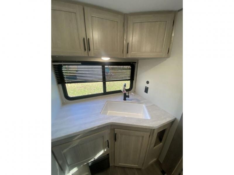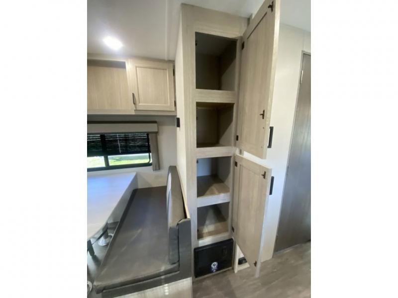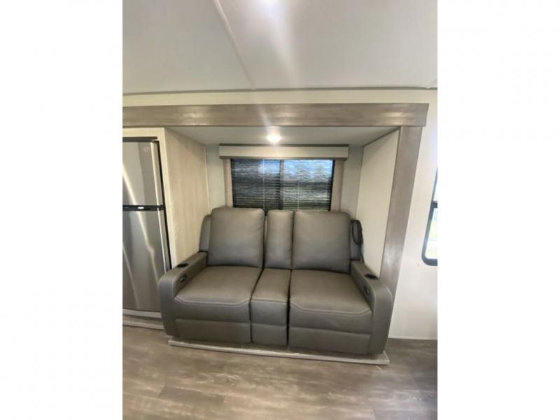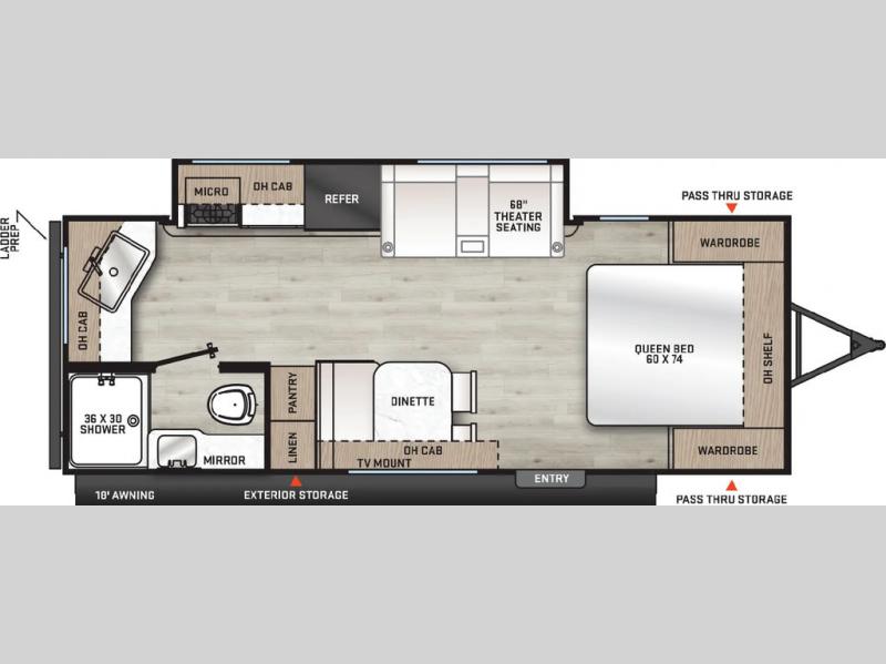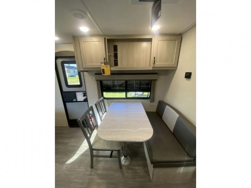 The chef will love cooking in the rear corner kitchen of this travel trailer! You will feel right at home in the front private bedroom with a 60" x 74" RV queen bed with dual bedside wardrobes and an overhead shelf for your personal items. There is a dinette with one bench seat and two chairs just to the left of the entry door for dining, and there is a TV mount above plus overhead cabinets for storage. Opposite, a slide out featuring a 68" theater seat, plus the kitchen appliances. Stay clean and fresh with the rear corner bath including a 36" x 30" shower featuring a skylight above for natural lighting as you get ready each morning. The electric awning has multicolor lights for you to choose your favorite color as you enjoy an evening outside beneath it with family and friends. A nice pass-through storage compartment will hold your camp chairs and outdoor games, plus more.