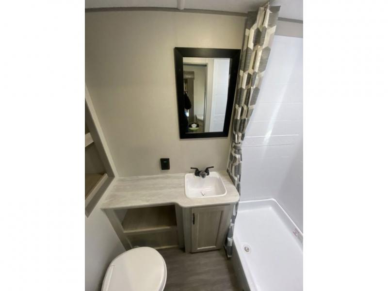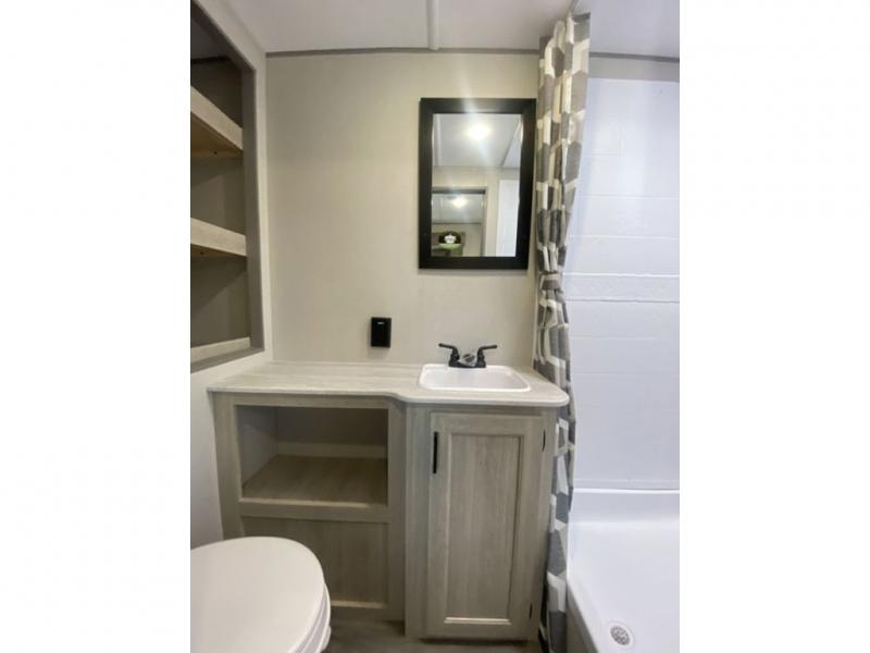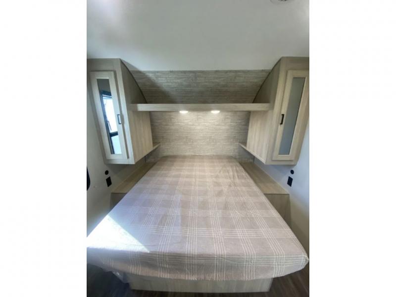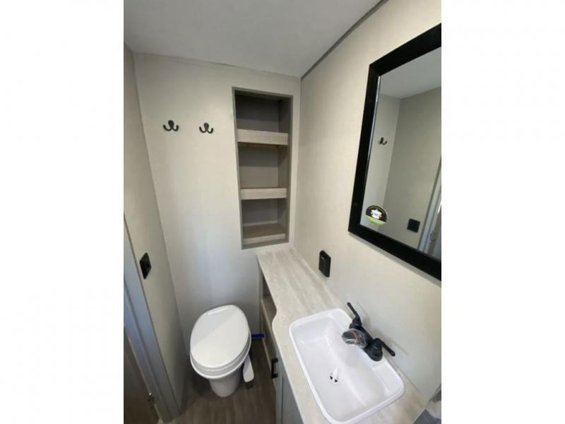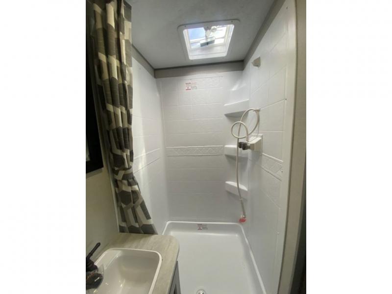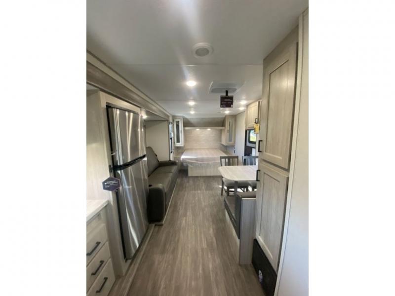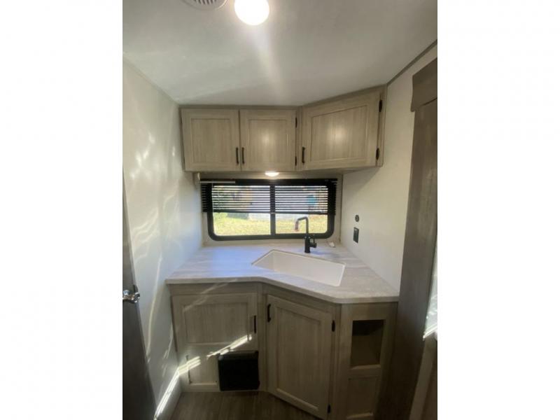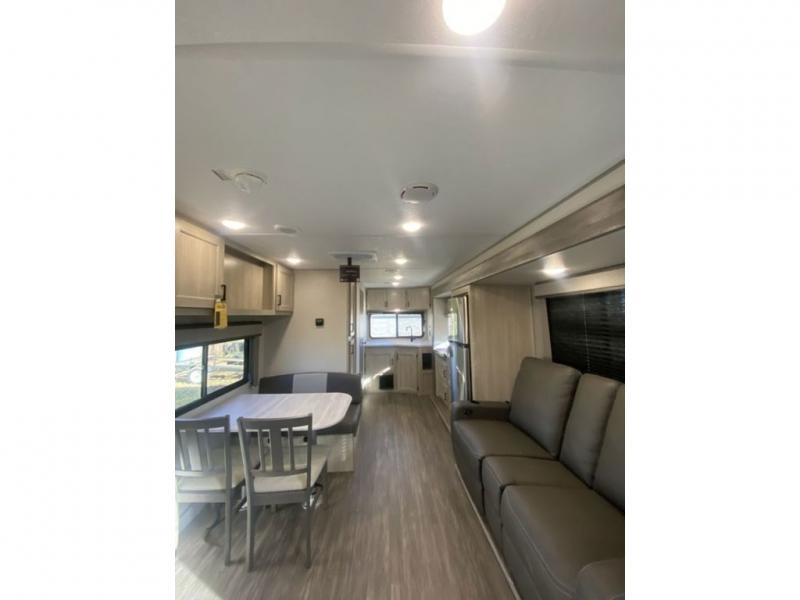 The chef will love cooking in the rear corner kitchen of this travel trailer! You will feel right at home in the front private bedroom with a 60" x 74" RV queen bed with dual bedside wardrobes and an overhead shelf for your personal items. There is a dinette with one bench seat and two chairs just to the left of the entry door for dining, and there is a TV mount above plus overhead cabinets for storage. Opposite, a slide out featuring a 68" theater seat, plus the kitchen appliances. Stay clean and fresh with the rear corner bath including a 36" x 30" shower featuring a skylight above for natural lighting as you get ready each morning. The electric awning has multicolor lights for you to choose your favorite color as you enjoy an evening outside beneath it with family and friends. A nice pass-through storage compartment will hold your camp chairs and outdoor games, plus more.