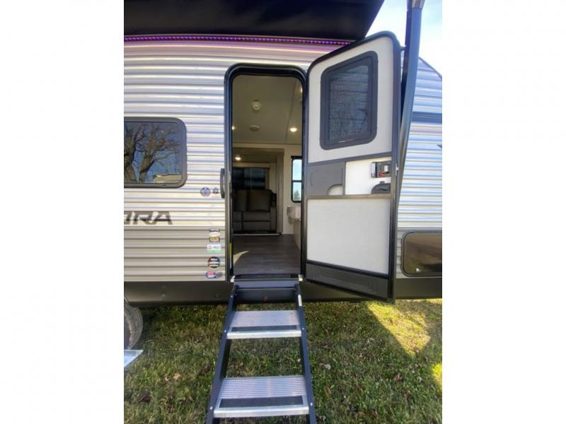 Comfortability, usability, and quality is what you will find in each one of these Forest River Aurora Light travel trailers! They are designed with a superior build and packed full with industry leading, functional, and distinctive standard features. The diamond plate rock guard will protect your unit from road debris and the nitrogen filled radial tires, which keep their pressure longer, offer better fuel economy. You will also find upgraded JBL Elite exterior speaker outside, an electric awning with multicolor lights and remote, plus flush mount baggage doors for easy packing. The interiors are beautifully designed with matte black kitchen and bath faucets, black nightshades in the living room, and GE kitchen appliances!