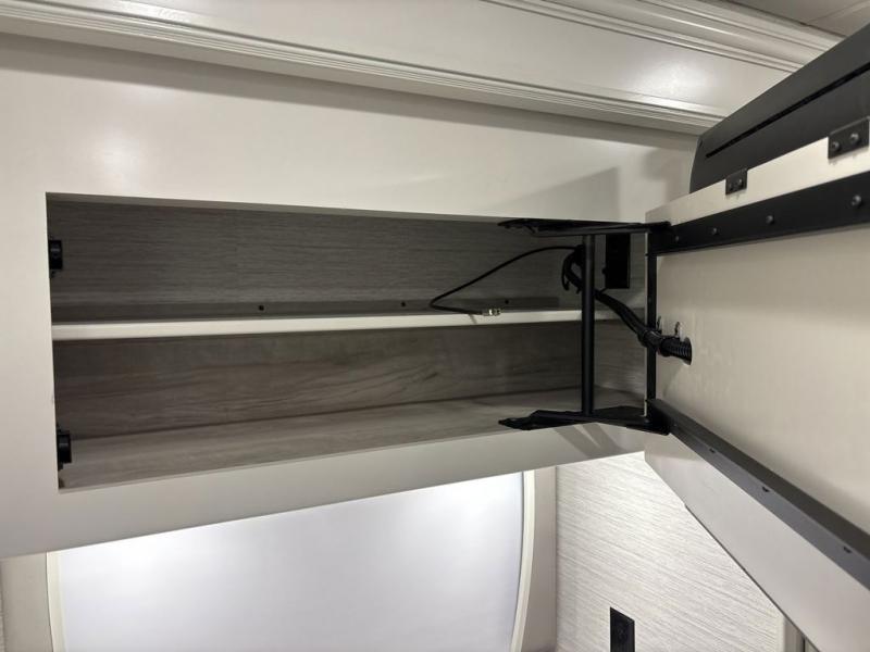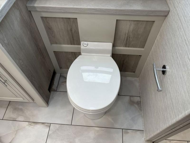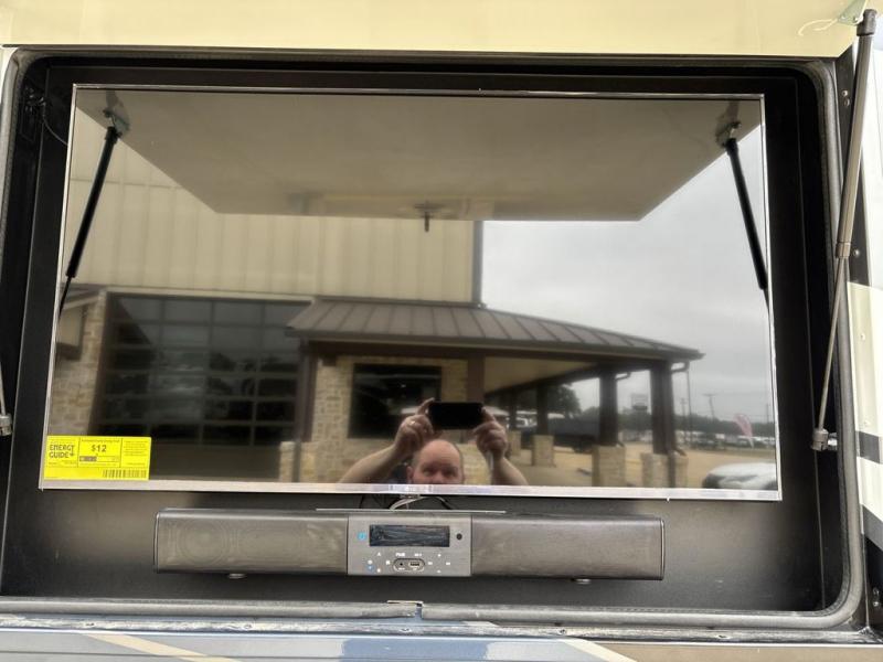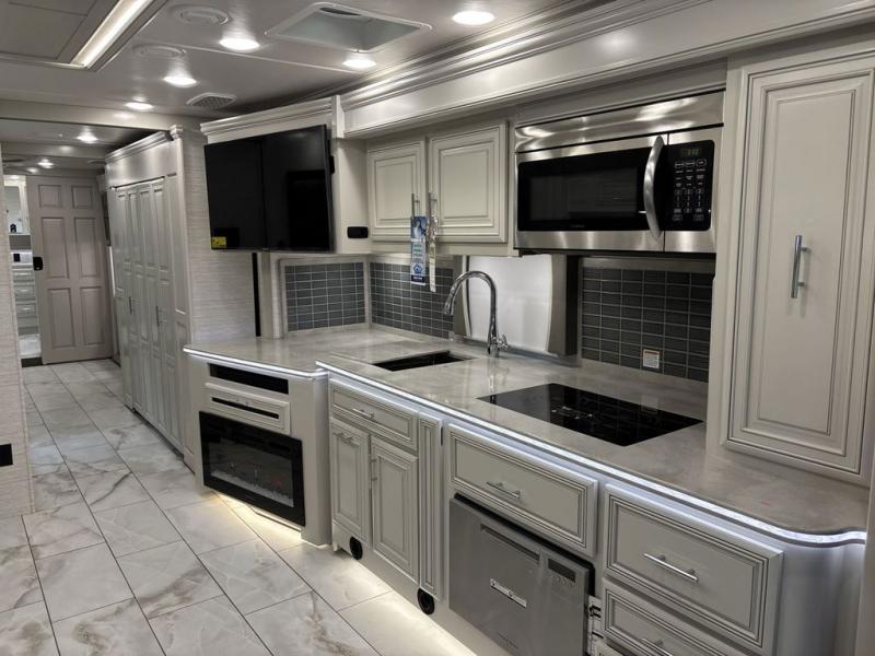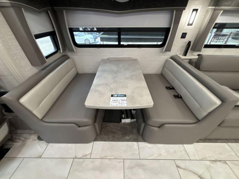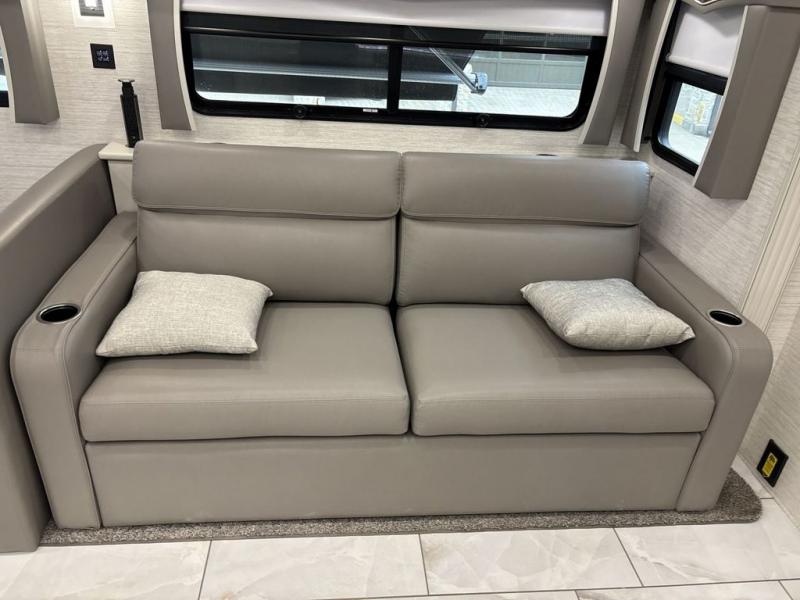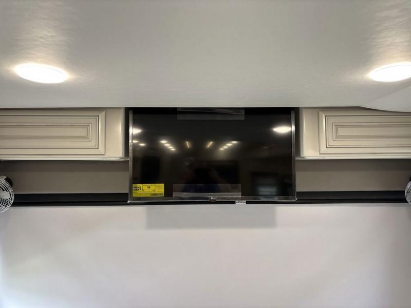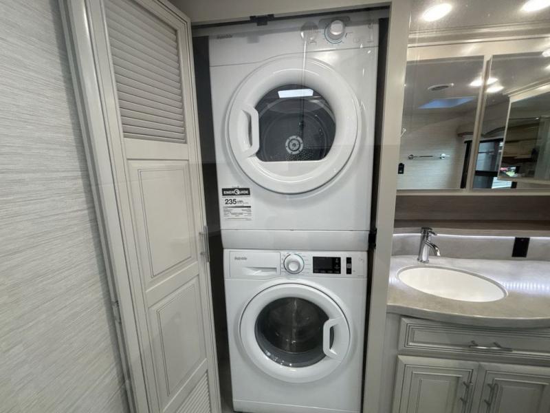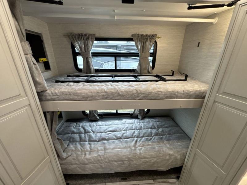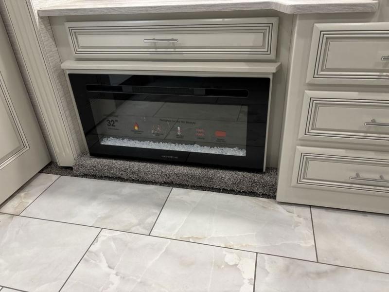 It will be easy for everyone to get ready in this motorhome with two full bathrooms! The full rear bathroom has a dual sink vanity for two to get ready at once, a linen closet with drawers, a shower, and a stackable washer and dryer for clean clothes on an extended vacation. The master suite has access to the rear bathroom, a tilt-a-view king bed slide, and a dresser with a 43" LED TV for your entertainment. Across from the second bathroom is a wardrobe that can become a set of 30" x 73" bunk beds with two 22" LED TV's with HDMI jacks. Prepare your best meals with the two burner electric induction cooktop and even the 30" over the range convection microwave then enjoy them at the booth dinette or you can switch it out for the optional free standing dinette. The Villa Ultrafab hide-a-bed sofa offers a comfortable place to relax while you watch your favorite movie on the 43" LED TV and enjoy the fireplace!