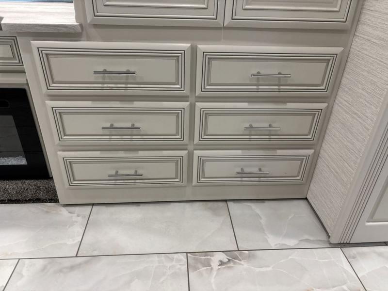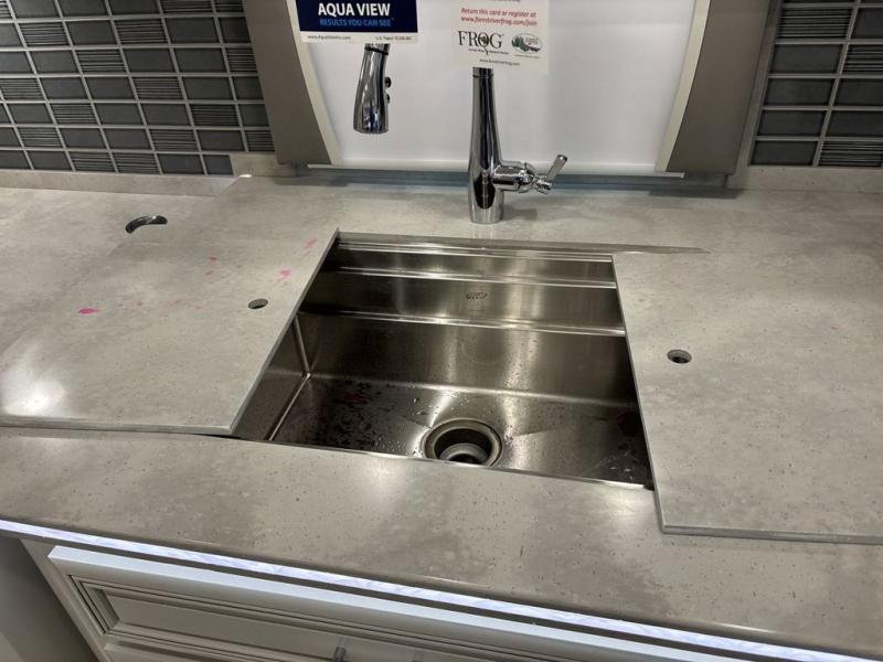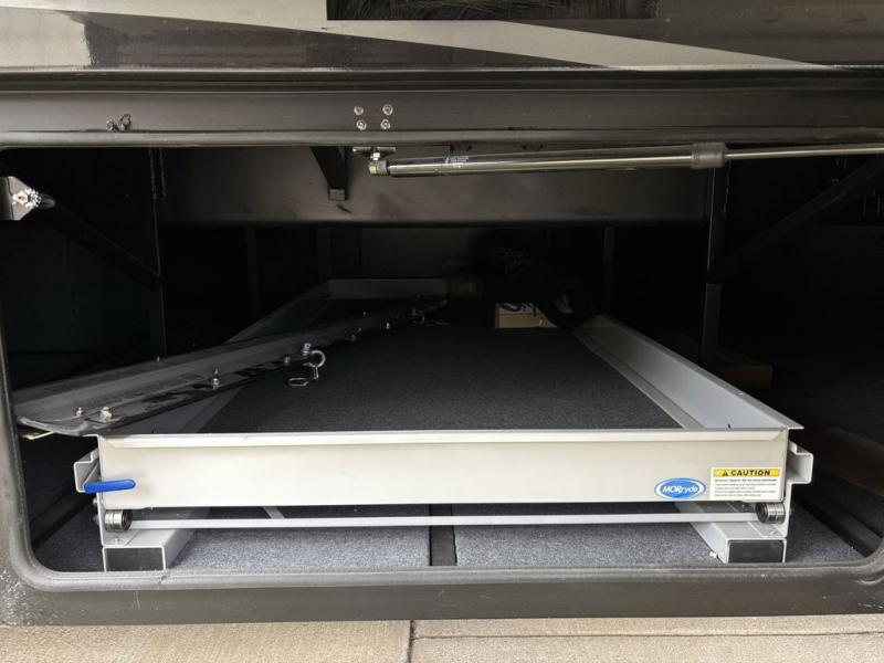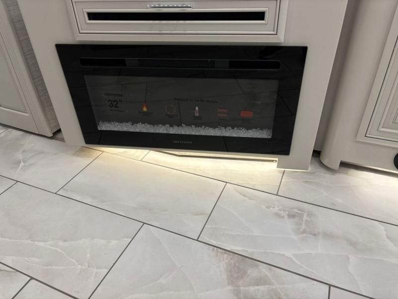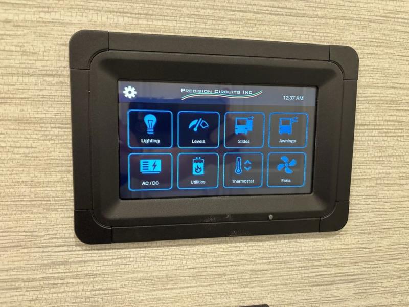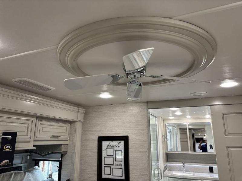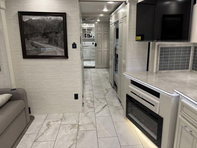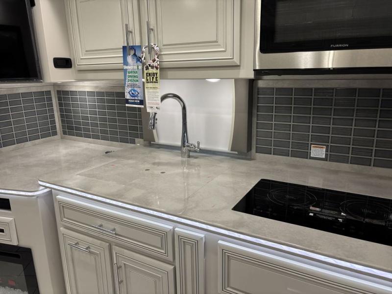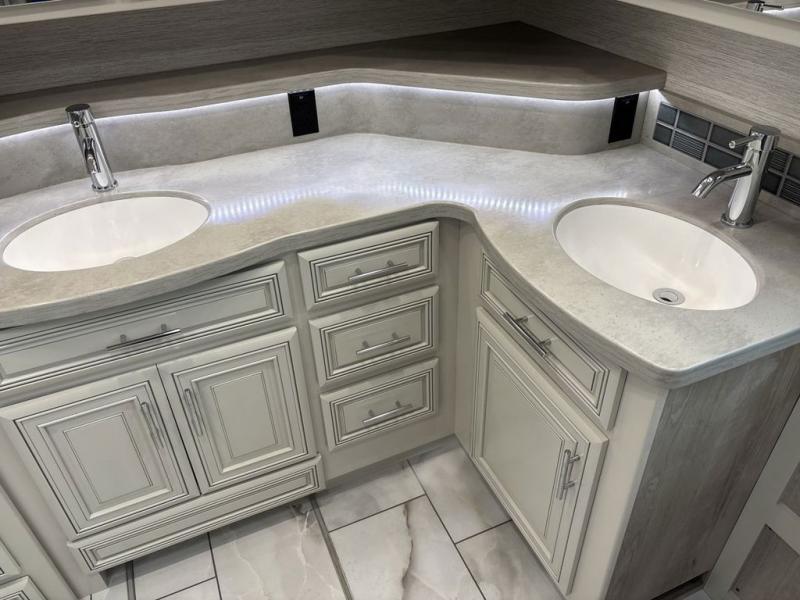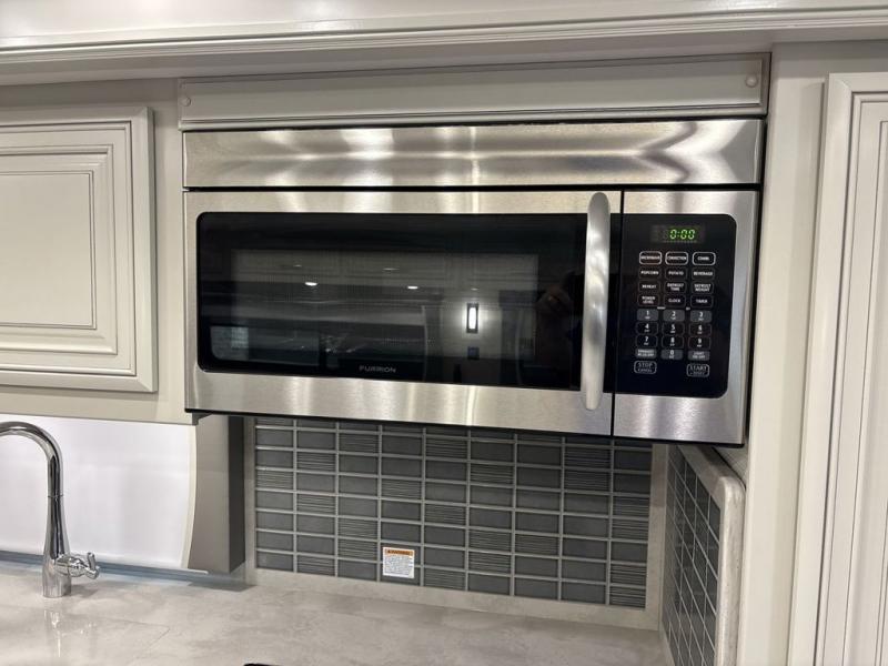 It will be easy for everyone to get ready in this motorhome with two full bathrooms! The full rear bathroom has a dual sink vanity for two to get ready at once, a linen closet with drawers, a shower, and a stackable washer and dryer for clean clothes on an extended vacation. The master suite has access to the rear bathroom, a tilt-a-view king bed slide, and a dresser with a 43" LED TV for your entertainment. Across from the second bathroom is a wardrobe that can become a set of 30" x 73" bunk beds with two 22" LED TV's with HDMI jacks. Prepare your best meals with the two burner electric induction cooktop and even the 30" over the range convection microwave then enjoy them at the booth dinette or you can switch it out for the optional free standing dinette. The Villa Ultrafab hide-a-bed sofa offers a comfortable place to relax while you watch your favorite movie on the 43" LED TV and enjoy the fireplace!