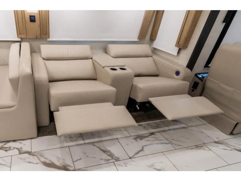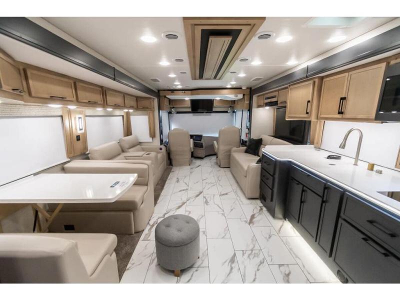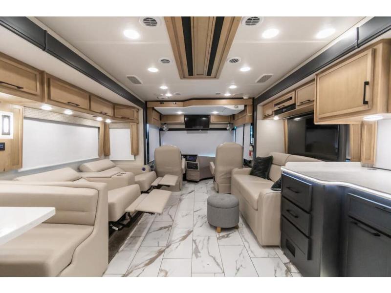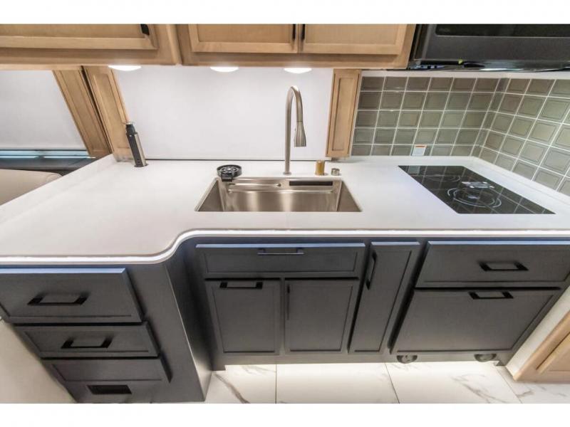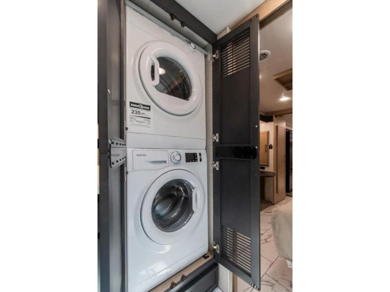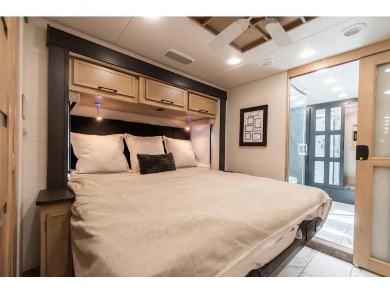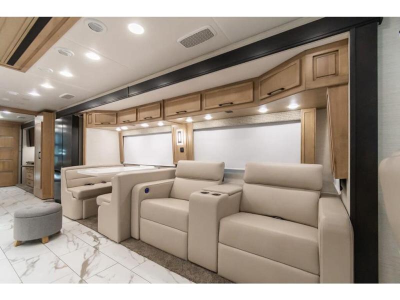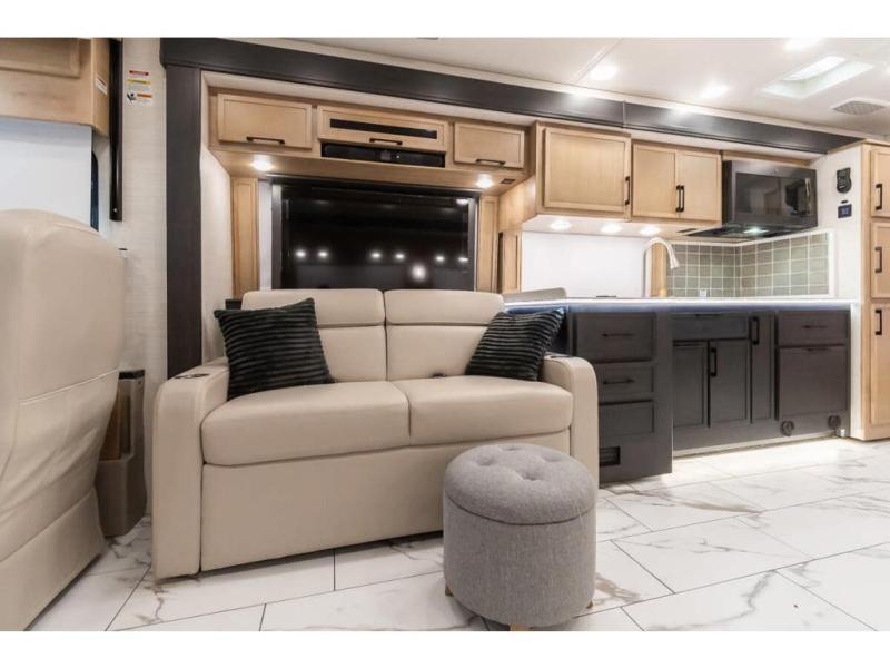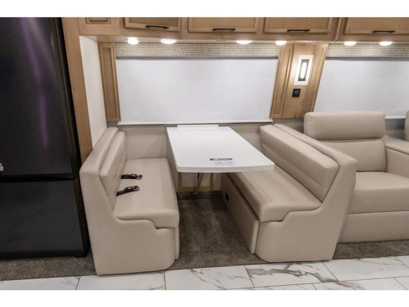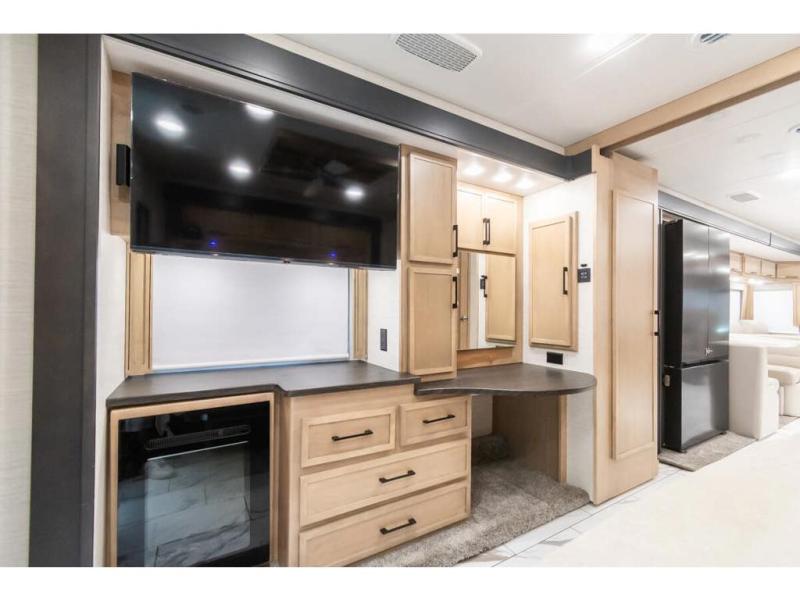 Travel has never been easier thanks to all the amenities that this unit offers. Starting with a full rear bathroom that boasts, an ample wardrobe, linen closet, washer and dryer prep, medicine cabinet, shelves, and dual sink to have great comfort in every way, this unit also has a half bathroom which will be the perfect addition to provide comfort to guests. Privacy is given by our private bedroom that features a 43” LED TV, fireplace, tilt-a-view king bed, dresser, mirror, vanity/desk, and many overhead cabinets to keep your belongings organized. Cooking will be a pleasure since this kitchen has everything needed to perform culinary duties, boasting a pantry, fridge, appliance garage and pantry, convection microwave, countertop extension, and dinette excellent for taking breaks each morning. And for the rest of the family or extra guests, more spaces to rest can be found in the amazing living with the hide-a-bed sofa, sofa/bed, and a bunk-over cab making room to sleep for a total of 6 people!