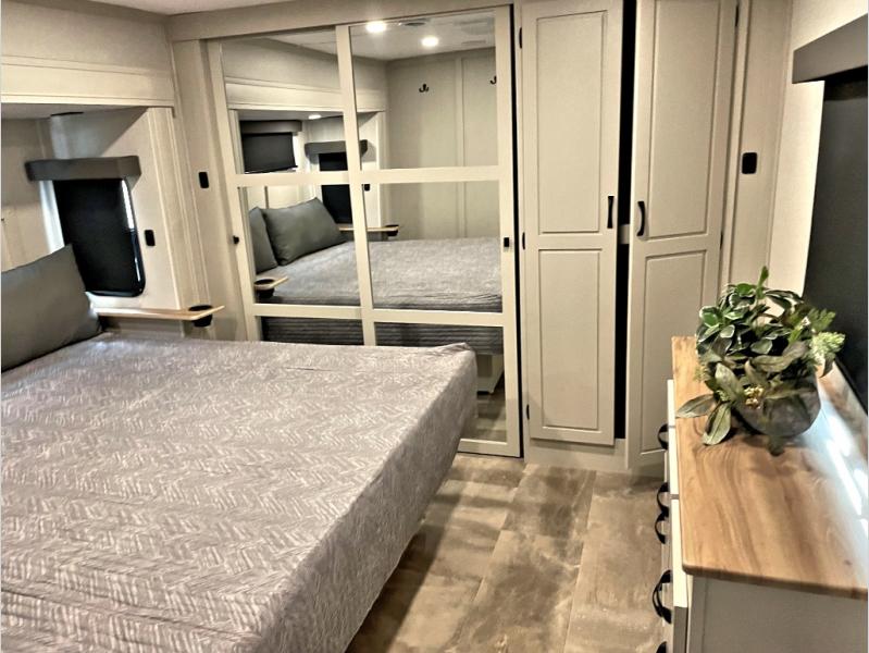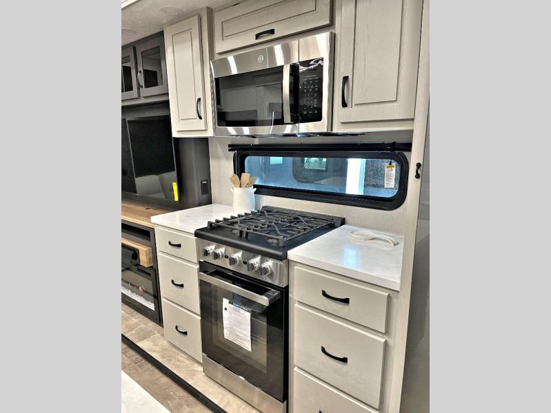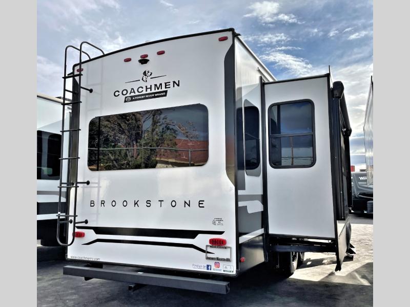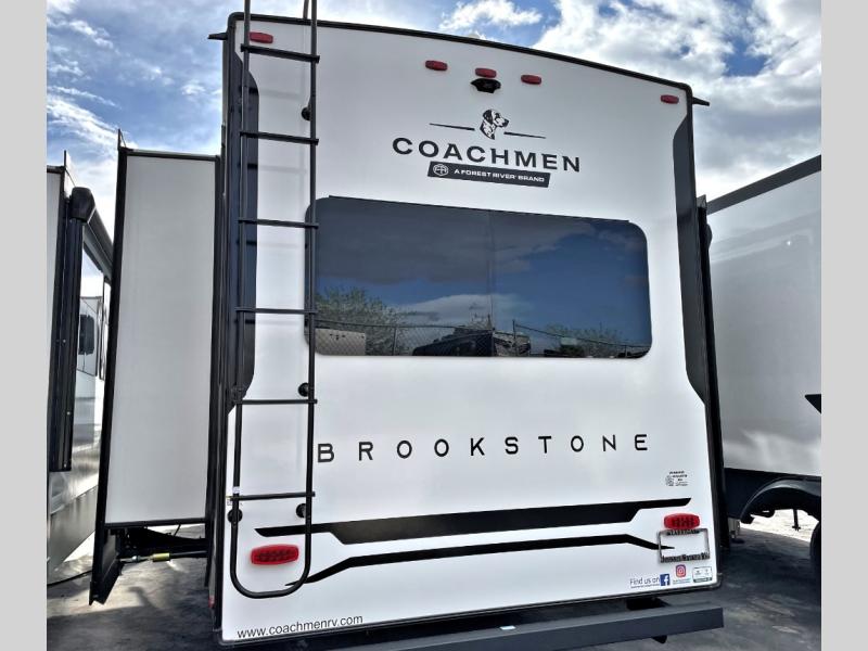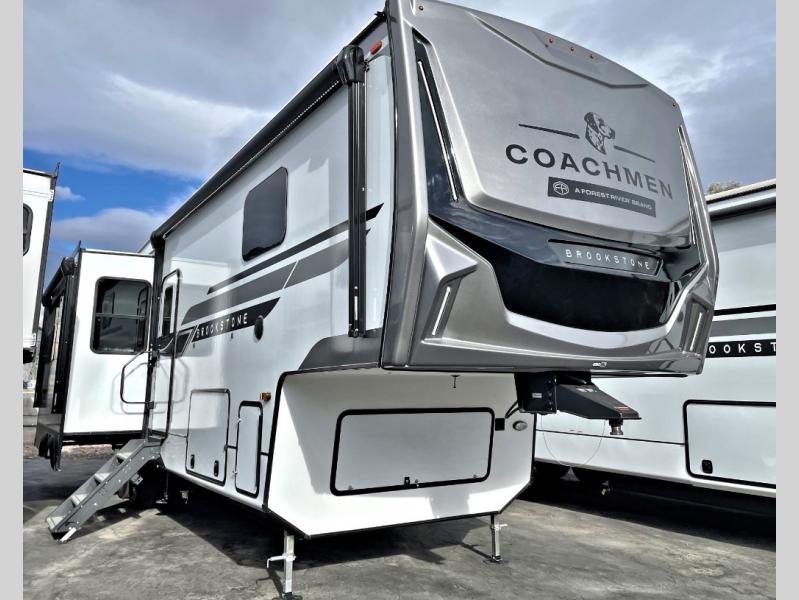 The Brookstone fifth wheels by Coachmen are coming to you with wide-body comfort, home-like amenities, and unique designs for a truly luxurious RV. The Weather Shield+ consists of a 6X double Azdel aluminum cage sidewall system, a Radiant Pro weather barrier system, and more that will help you extend your camping season or go full-time. Head inside to find solid surface countertops in the kitchen, an XL HD LED TV in the living room, slow rise roller night shades, and the list of comforts goes on! The Brookstone also includes 6-point electric auto-leveling, four Solid Step entry steps, an electric awning with LED lights, and many more exterior conveniences!