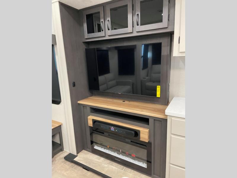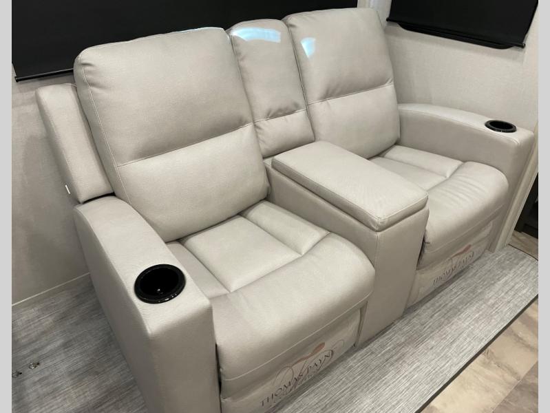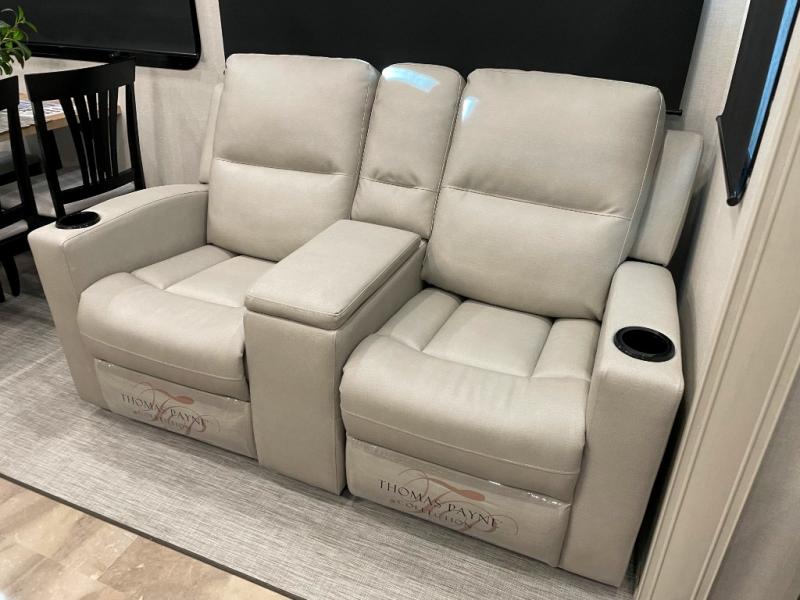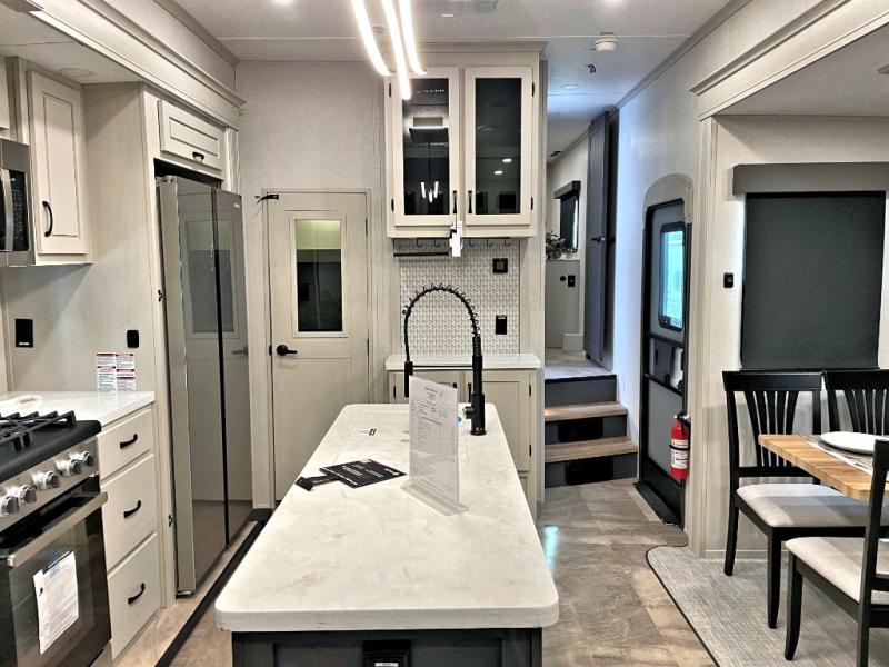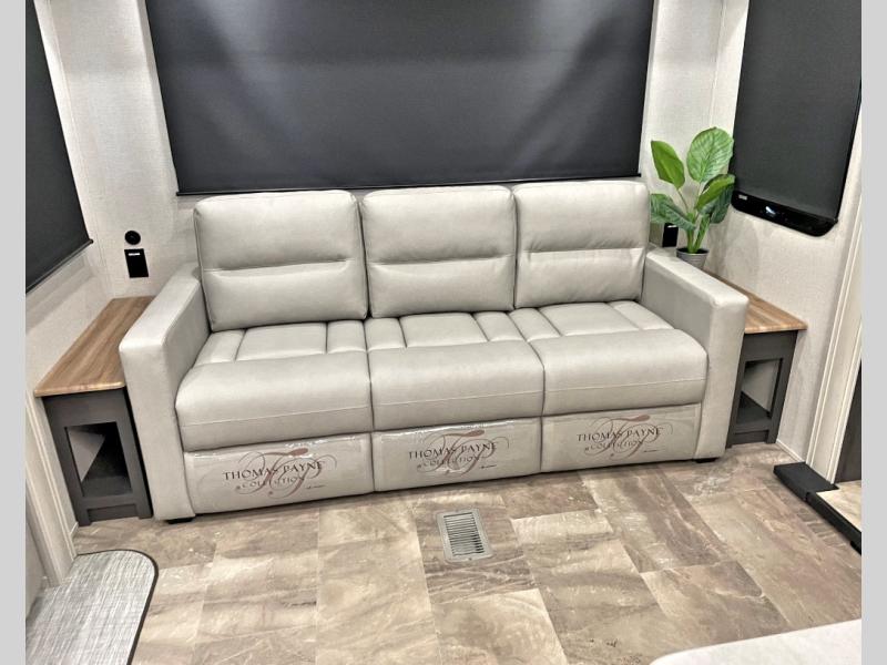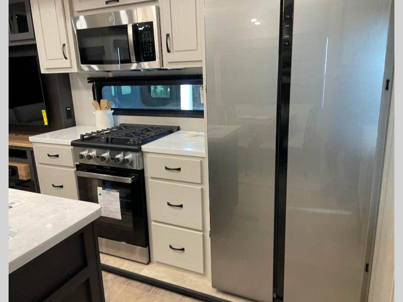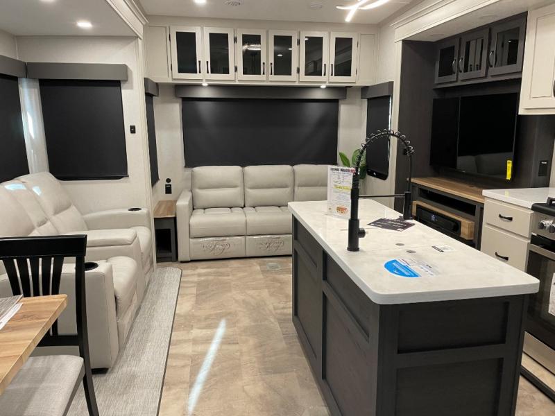 The great outdoors is calling your name in this triple slide out fifth wheel. The kitchen is any chef's dream with its kitchen island, residential 15.6 cu. ft. 12V refrigerator, and large transom window at the cooktop to let a breeze in. The theater seating is directly across from the entertainment center for easy viewing, and you'll find additional seating on the 78" tri-fold hide-a-bed sofa and free-standing table. Cleaning up each day will be a breeze with the shower with a seat and sliding glass doors. The front private bedroom includes a king bed slide out, a large front wardrobe, plus washer and dryer prep to make camping even easier.