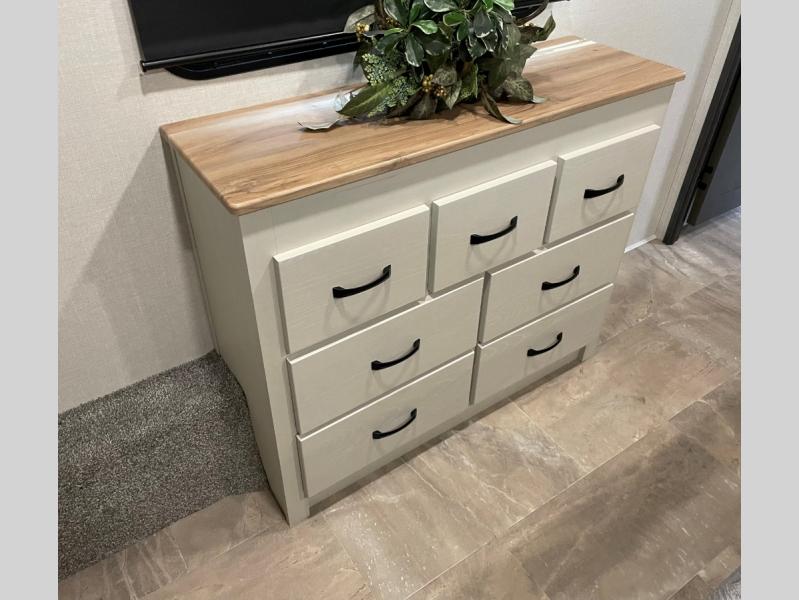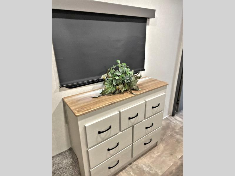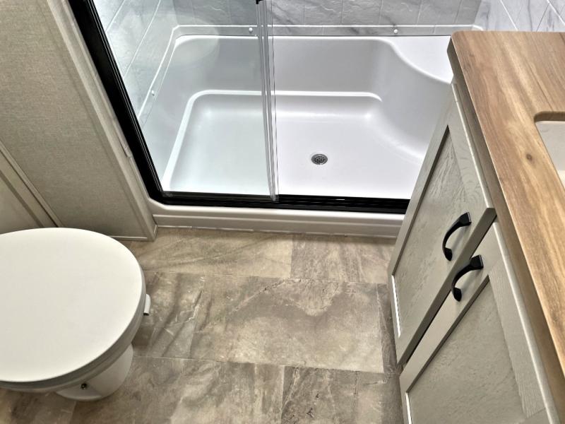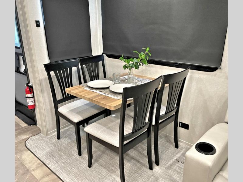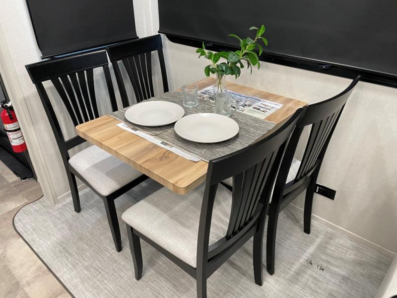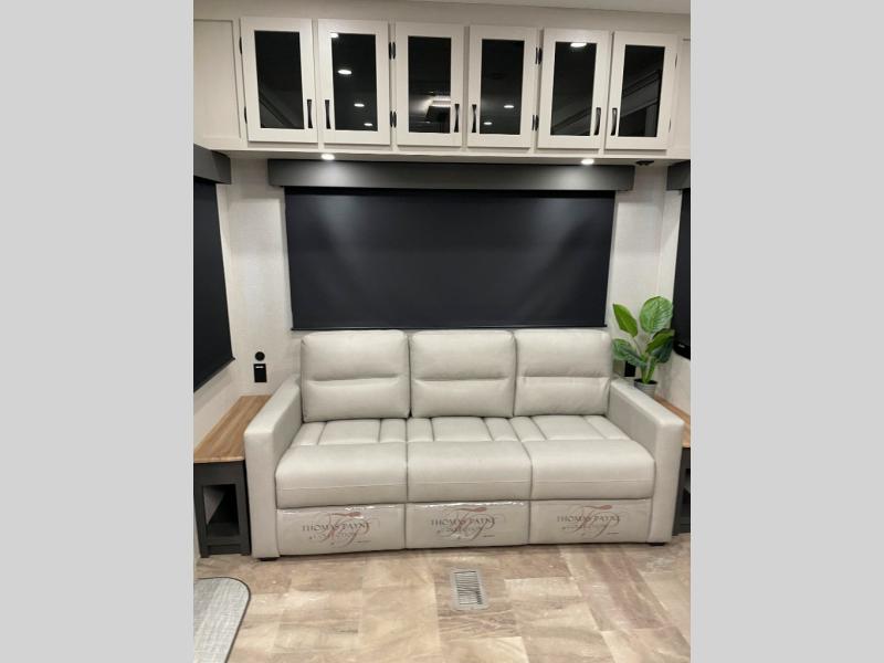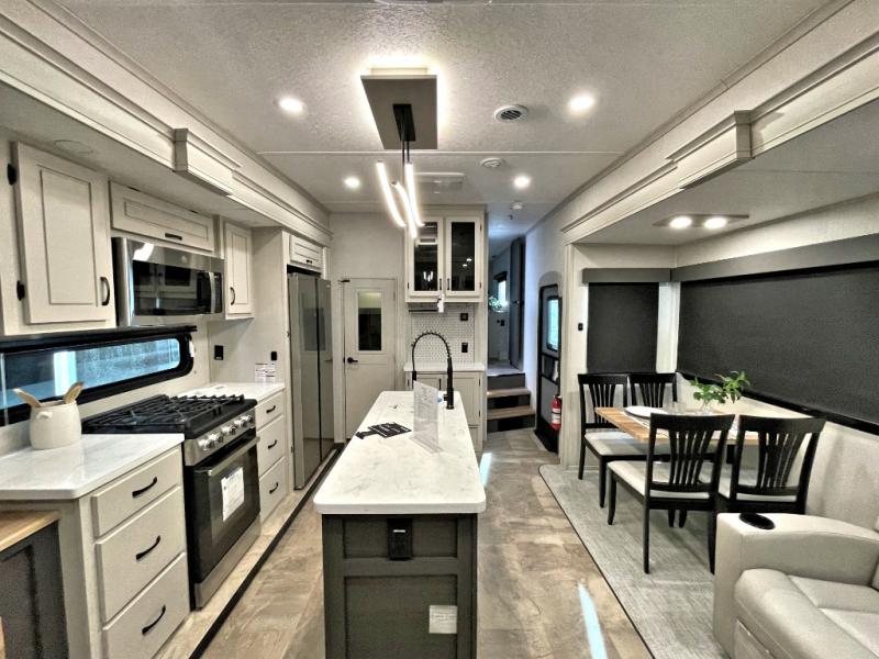 The great outdoors is calling your name in this triple slide out fifth wheel. The kitchen is any chef's dream with its kitchen island, residential 15.6 cu. ft. 12V refrigerator, and large transom window at the cooktop to let a breeze in. The theater seating is directly across from the entertainment center for easy viewing, and you'll find additional seating on the 78" tri-fold hide-a-bed sofa and free-standing table. Cleaning up each day will be a breeze with the shower with a seat and sliding glass doors. The front private bedroom includes a king bed slide out, a large front wardrobe, plus washer and dryer prep to make camping even easier.