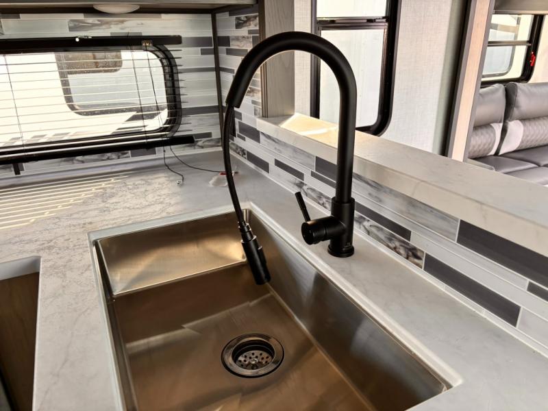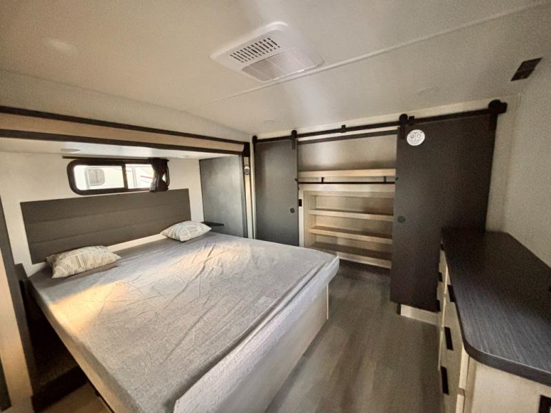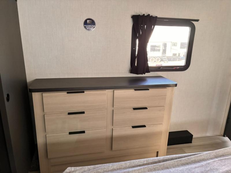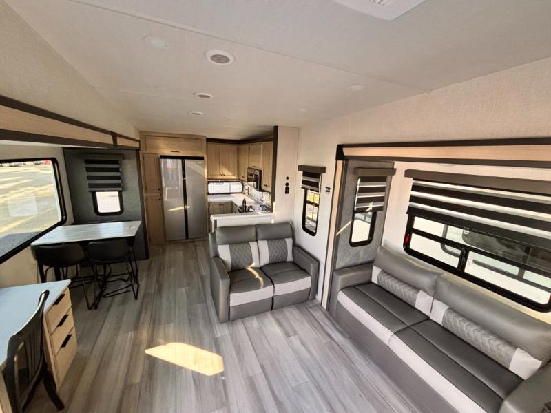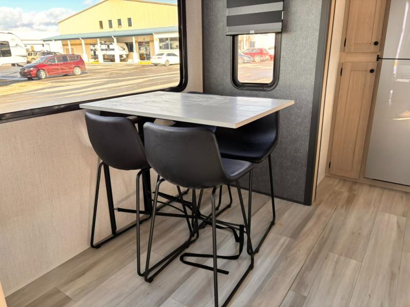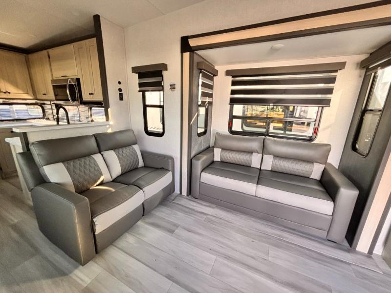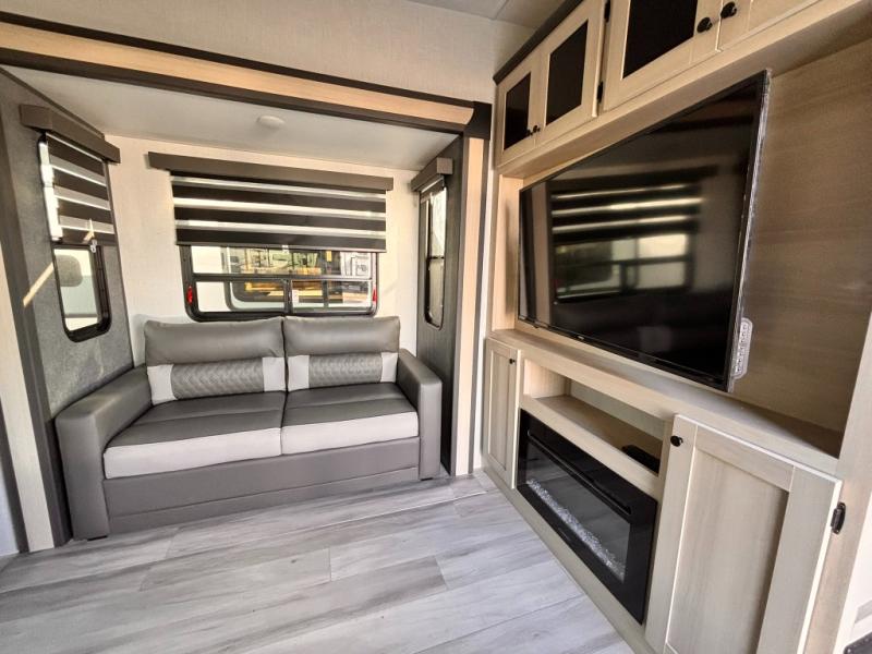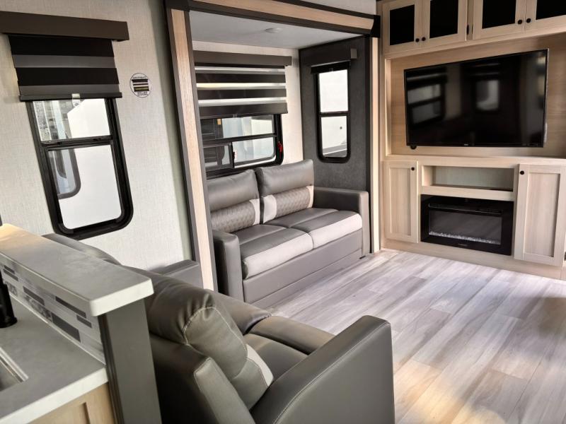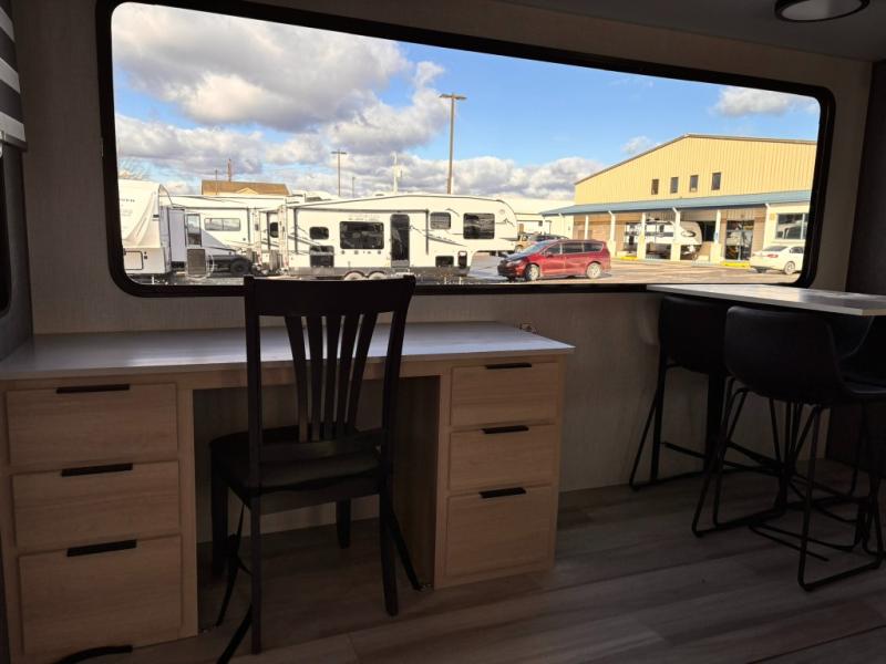 For the couple who love to cook, this fifth wheel is the perfect choice! There is generous counter space in the rear kitchen, along with overhead cabinetry, and a hi-top table and chairs for dining space. Beside the table is a desk with a chair and a campview window so you can still enjoy nature views if you have to work. When it's time to relax, the tri-fold sofa and theater seating in the living room will do the trick, or you can head outdoors to enjoy the two power awnings. A full bath will let you freshen up before bed, and speaking of bedtime, the king bed slide out in the front bedroom is sure to bring comfort. There is also a walk-in wardrobe with washer and dryer prep and a dresser to keep your space tidy!
