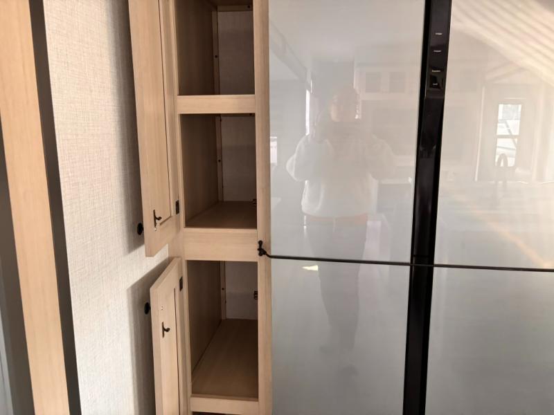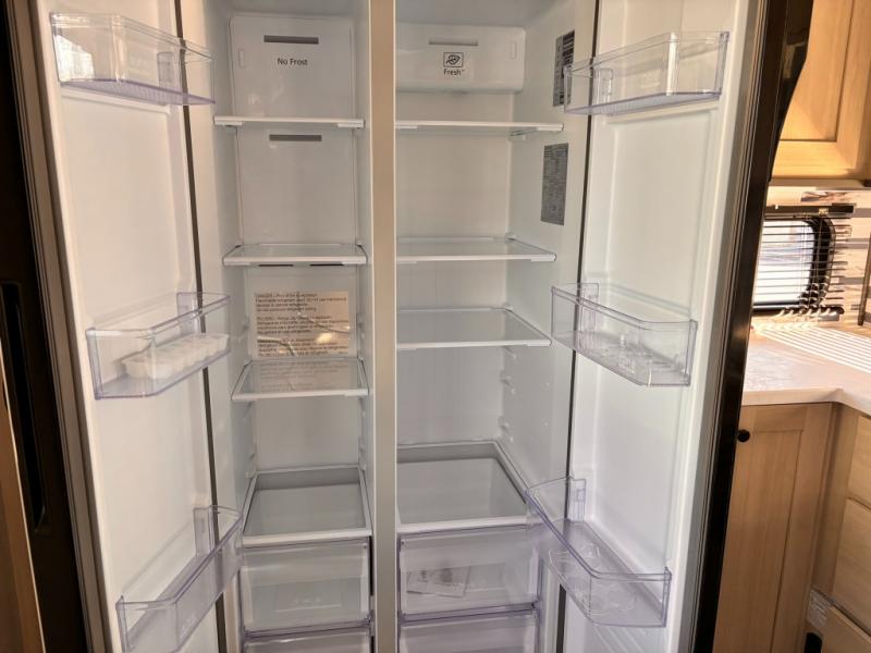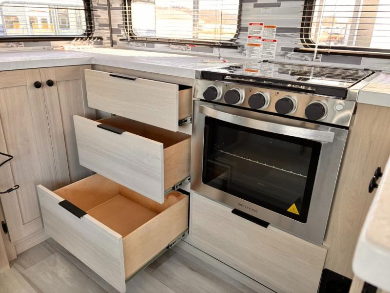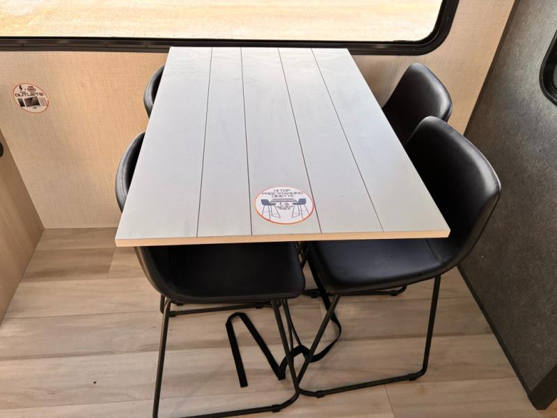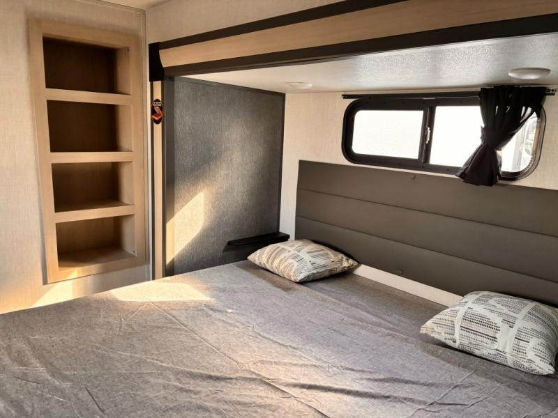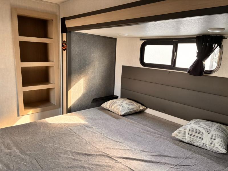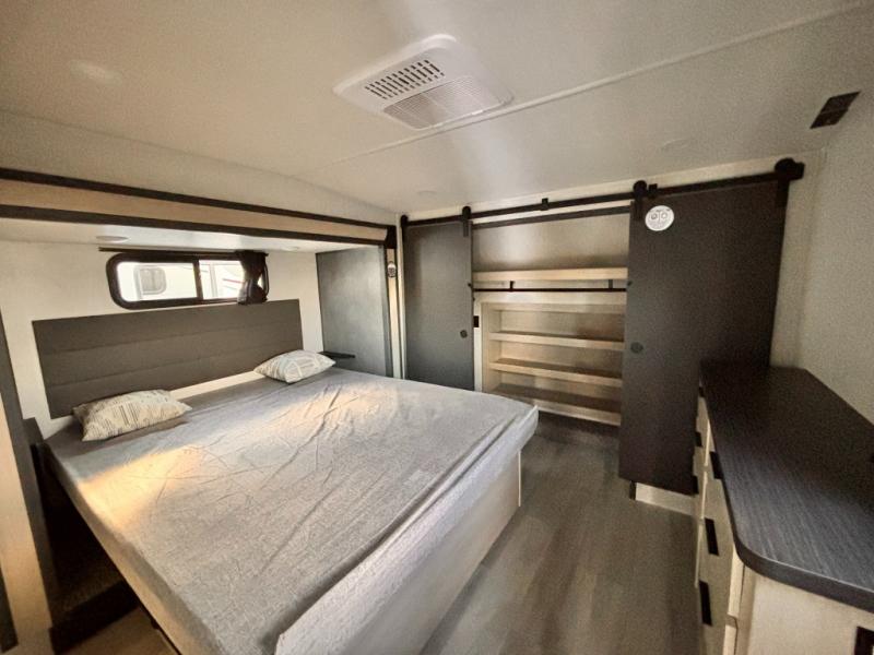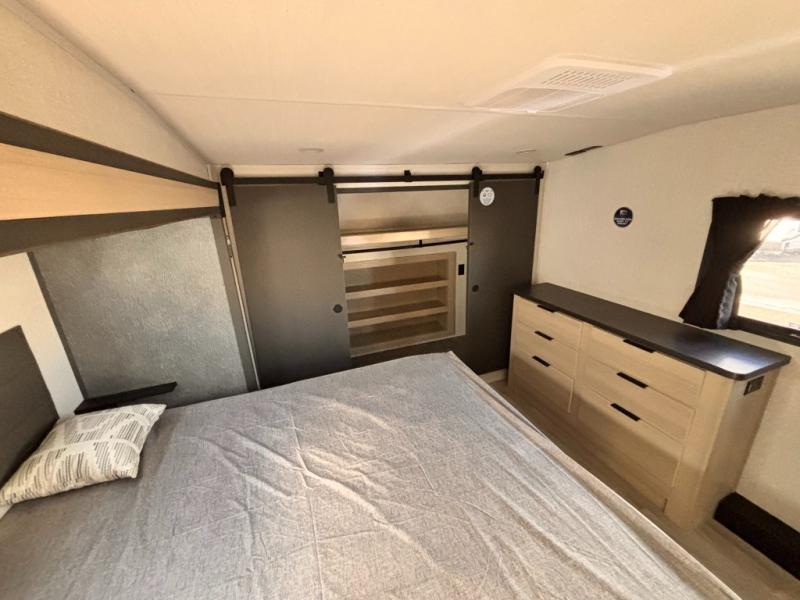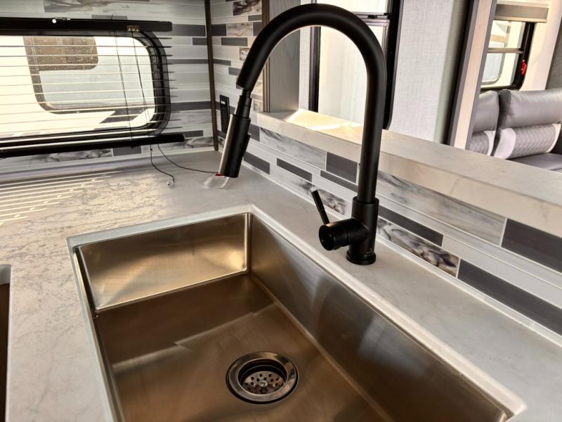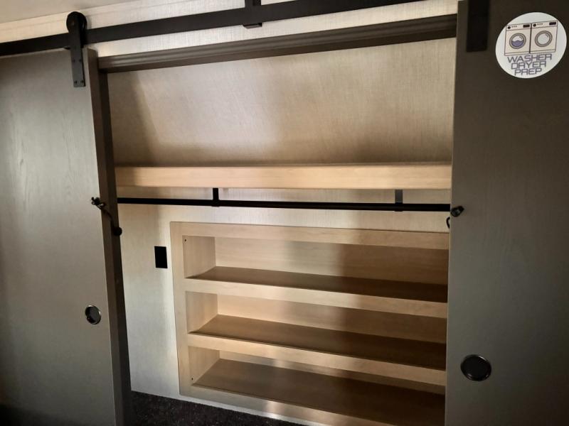 For the couple who love to cook, this fifth wheel is the perfect choice! There is generous counter space in the rear kitchen, along with overhead cabinetry, and a hi-top table and chairs for dining space. Beside the table is a desk with a chair and a campview window so you can still enjoy nature views if you have to work. When it's time to relax, the tri-fold sofa and theater seating in the living room will do the trick, or you can head outdoors to enjoy the two power awnings. A full bath will let you freshen up before bed, and speaking of bedtime, the king bed slide out in the front bedroom is sure to bring comfort. There is also a walk-in wardrobe with washer and dryer prep and a dresser to keep your space tidy!
