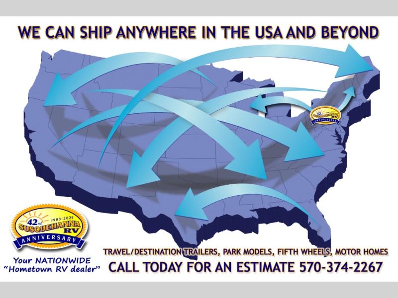 We are a premier dealer for all camping needs. If you are traveling from anywhere in Pennsylvania we have you covered. We service York, Harrisburg, Lancaster, Reading, Lewisburg, Williamsport, Philadelphia, Pittsburgh, State College, Lewistown, Bloomsburg, Allentown, Scranton, Wilkes-Barre, Lebanon, Manheim, Duncannon, Shamokin Dam, Elysburg, Danville, Sunbury, Berwick, Mt. Carmel, Hershey, Pottsville, Frackville, Centralia, Wiles -Barre, Scranton, Long Pond, and more. In New Jersey, Delaware, West Virginia, New York, or the Maryland regions; we are the RV dealer to see. Please browse our huge RV inventory today at WWW.SUSQRV.COM. Susquehanna RV has been an industry leader for 42 years. We have a wide variety of new and pre-owned Travel Trailers, Fifth 5th Wheels, Toy Haulers, Class A class C motorhomes & more. We stock Cherokee, Cherokee Wolf Pup, Wolf Pack, Arctic Wolf Alpha Wolf, Cardinal by Forest River, Coachmen Prism and Cross Trail. Full service & repair shop with RVIA Certified Technicians and Financing is available. We have an excellent reputation in the Recreational Vehicle and Camping industry with our customers and manufacturers. Call us 570-374-2267 2084 Route 522 Selinsgrove, Pa 17870