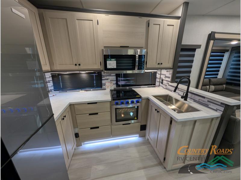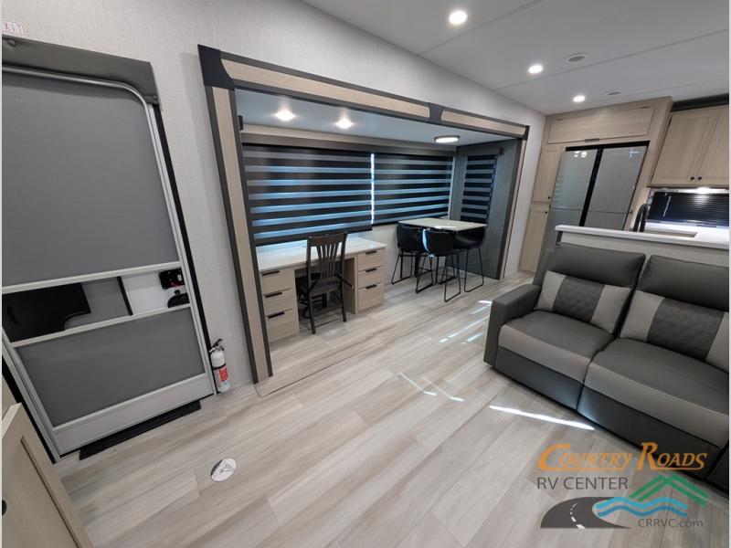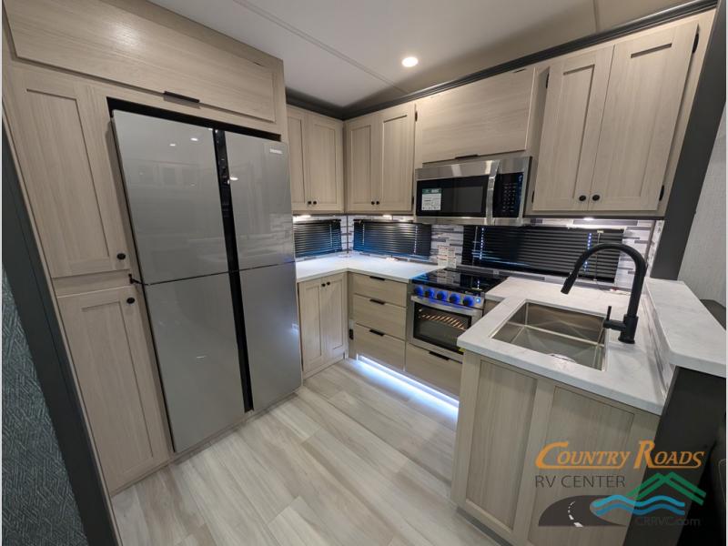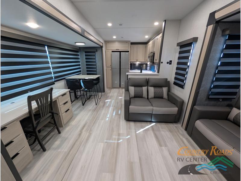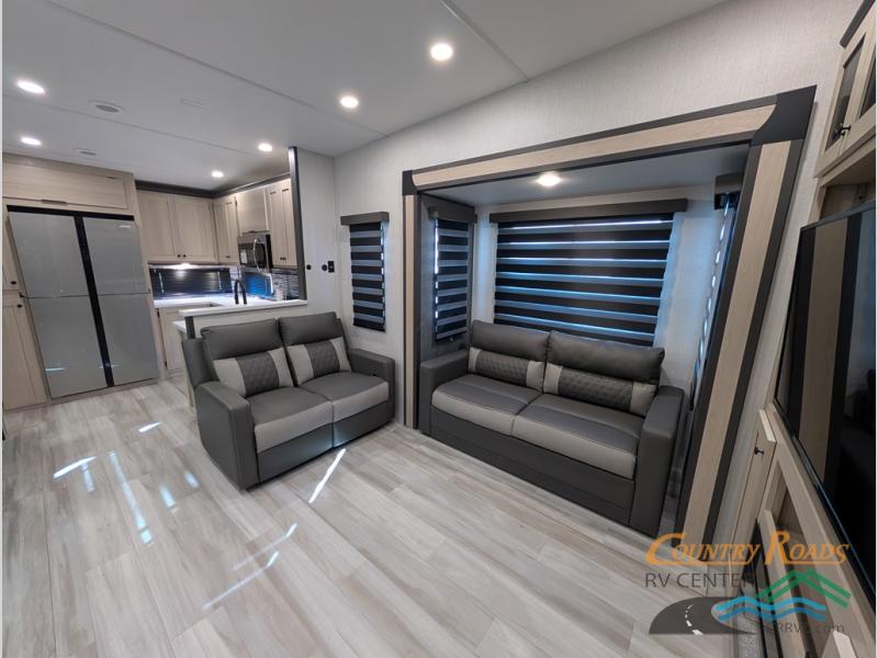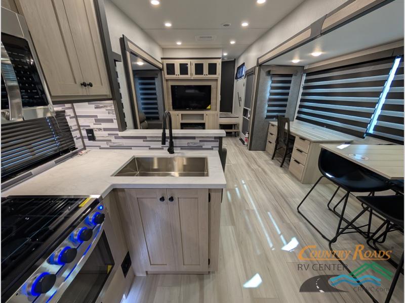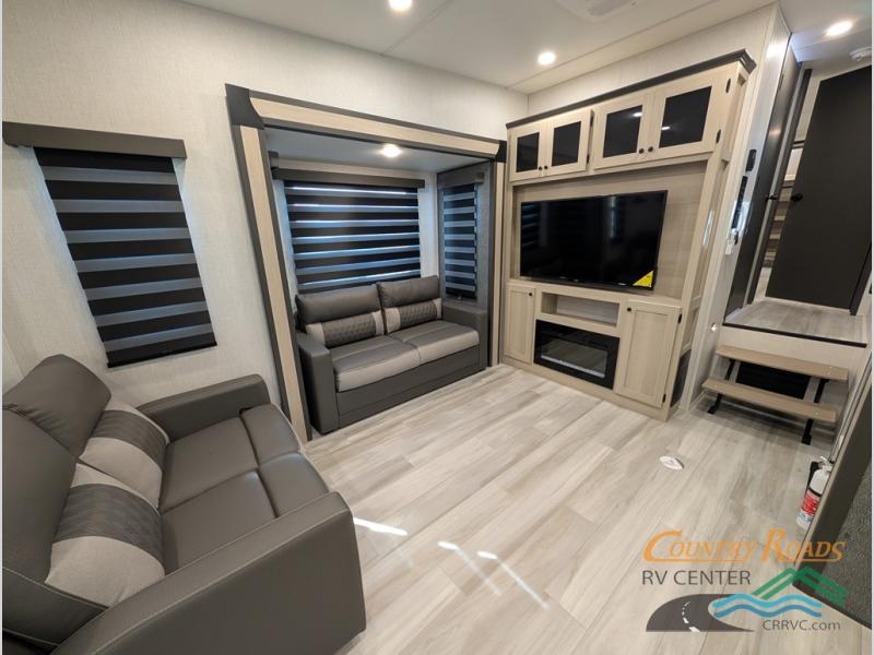 Cook like a chef worthy of a Michelin star in this amazing fifth wheel! Inside, you'll find a spacious rear kitchen, complete with a pantry, a 12V refrigerator ideal for keeping your fruits and vegetables fresh, overhead cabinets, and a sprawling countertop for all your cooking and dining times. The high-top table and chairs provide the perfect place to enjoy meals with family and friends. The living room is a cozy place featuring comfortable theater seating, a tri-fold sofa, a cozy fireplace, an entertainment center, and a convenient desk for staying productive on the go. The full bathroom is also a great place to freshen up, complete with a linen closet and all the amenities you need to take a bath and feel at home. With a spacious shower and plenty of storage, you'll have everything you need to start your day off right. The perfect place to rest and recharge after a long day of adventure is the front bedroom which boasts a comfortable king bed, dresser, walk-in wardrobe with washer and dryer prep, for keeping all your favorite belongings clean and organized on the road. Outside, you'll appreciate the pass-through storage for all your gear and toys, as well as the two awnings (15' and 11') ideal for creating unforgettable memories outside without worrying about the weather.