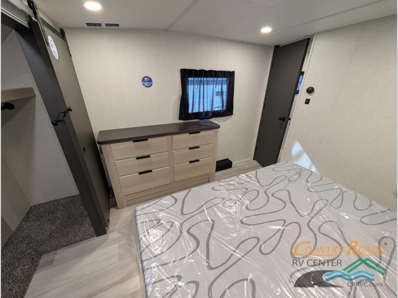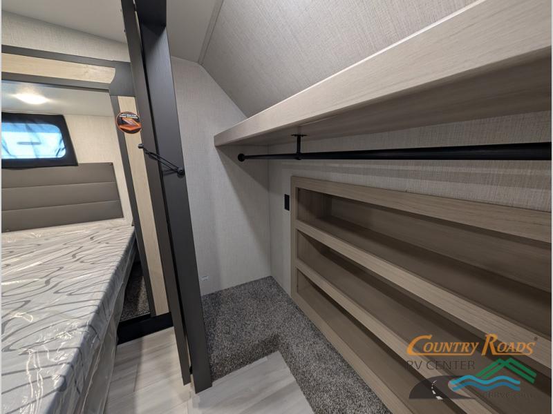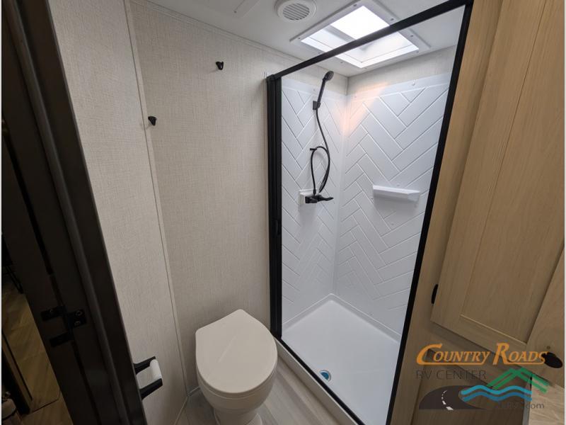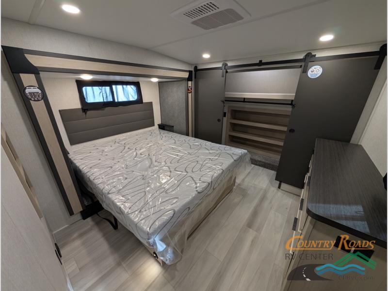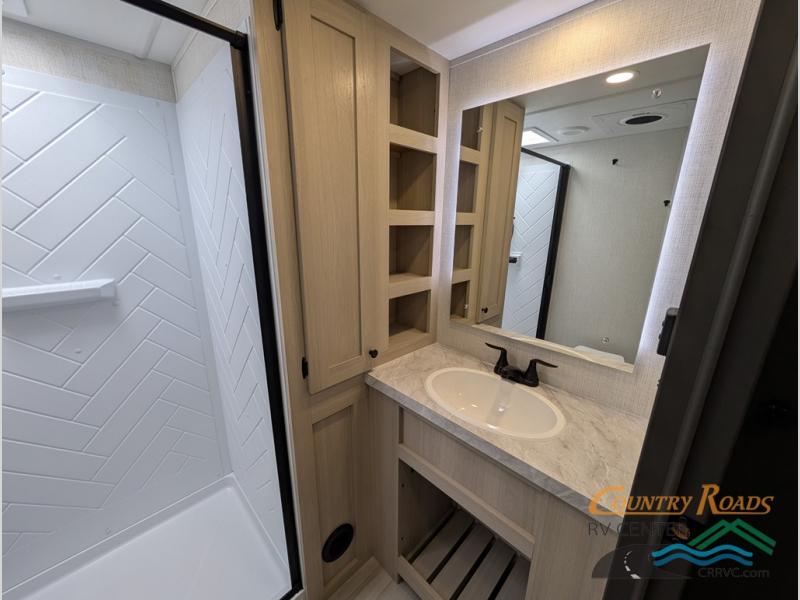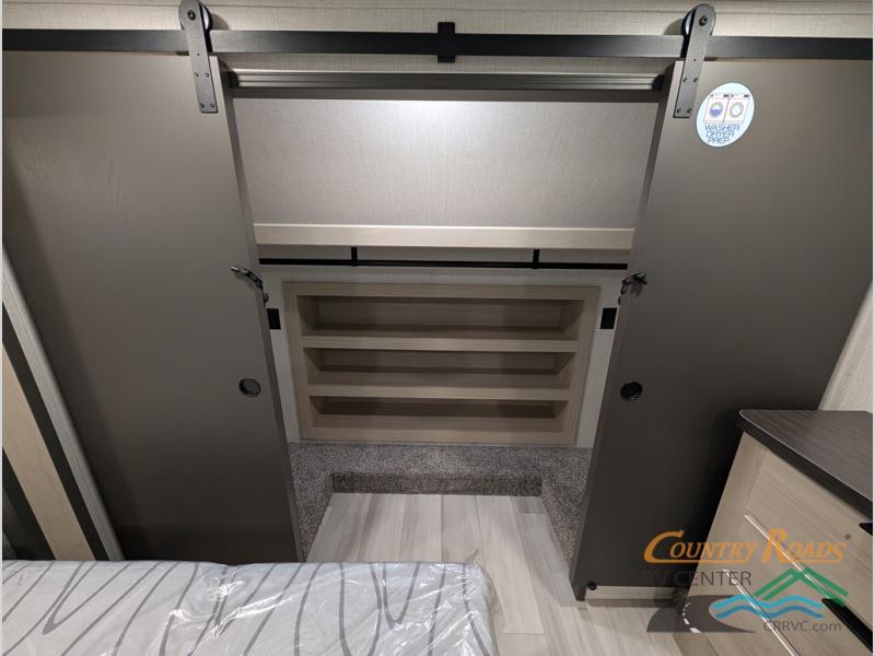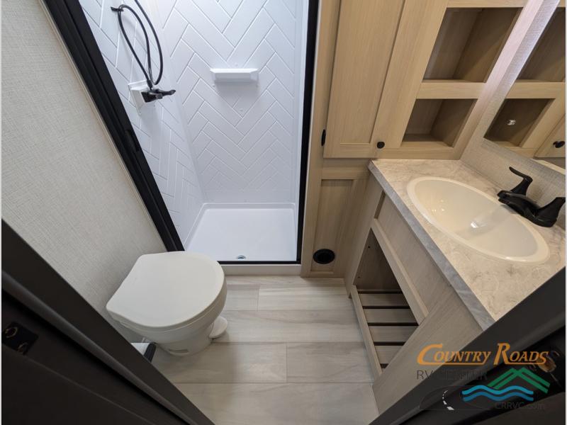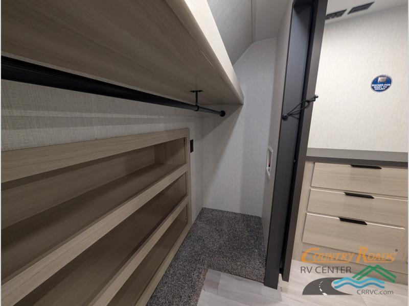Cook like a chef worthy of a Michelin star in this amazing fifth wheel! Inside, you'll find a spacious rear kitchen, complete with a pantry, a 12V refrigerator ideal for keeping your fruits and vegetables fresh, overhead cabinets, and a sprawling countertop for all your cooking and dining times. The high-top table and chairs provide the perfect place to enjoy meals with family and friends. The living room is a cozy place featuring comfortable theater seating, a tri-fold sofa, a cozy fireplace, an entertainment center, and a convenient desk for staying productive on the go. The full bathroom is also a great place to freshen up, complete with a linen closet and all the amenities you need to take a bath and feel at home. With a spacious shower and plenty of storage, you'll have everything you need to start your day off right. The perfect place to rest and recharge after a long day of adventure is the front bedroom which boasts a comfortable king bed, dresser, walk-in wardrobe with washer and dryer prep, for keeping all your favorite belongings clean and organized on the road. Outside, you'll appreciate the pass-through storage for all your gear and toys, as well as the two awnings (15' and 11') ideal for creating unforgettable memories outside without worrying about the weather.