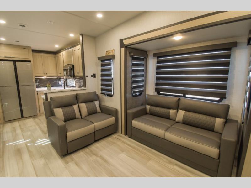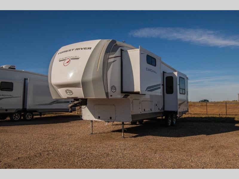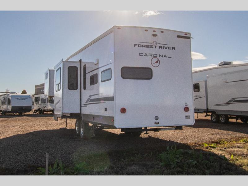 With any Cardinal fifth wheel by Forest River you will enjoy affordable luxury at every turn. These models are constructed with residential fiberglass insulation in the roof and floor, a sectioned ABS plastic underbelly armor, and a vacuum bonded, welded aluminum structure for added strength and durability. You will also find seamless roto-cast holding tanks, an outdoor shower, and 4-point auto leveling for quick and easy setup. Each model includes a best-in-class, high-efficiency 35,000 BTU furnace, along with a 18,000 BTU ducted A/C, with second and third A/C prep, plus an on-demand tankless water heater for added convenience. There are carpet-free living spaces, residential backsplash, motion lighting throughout, and many more comforts!