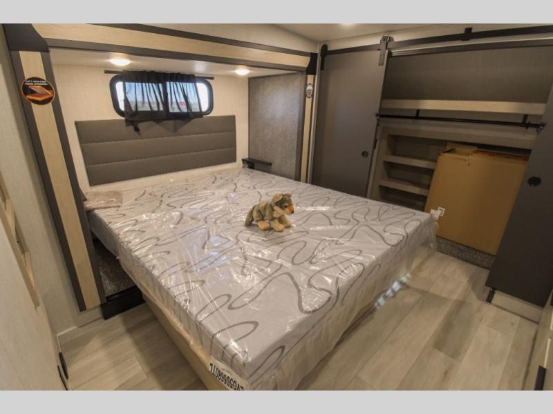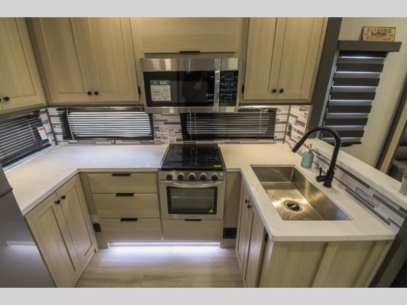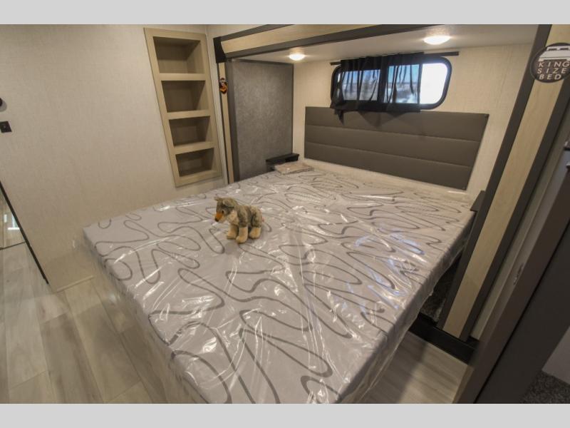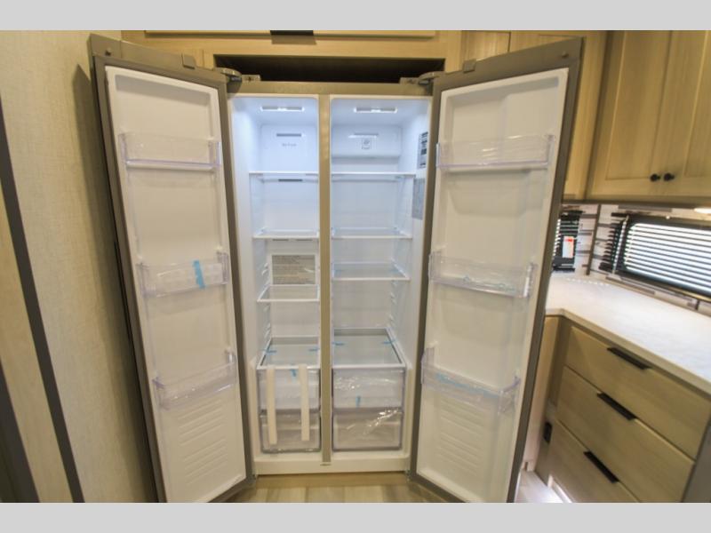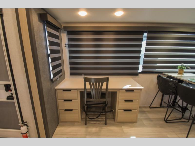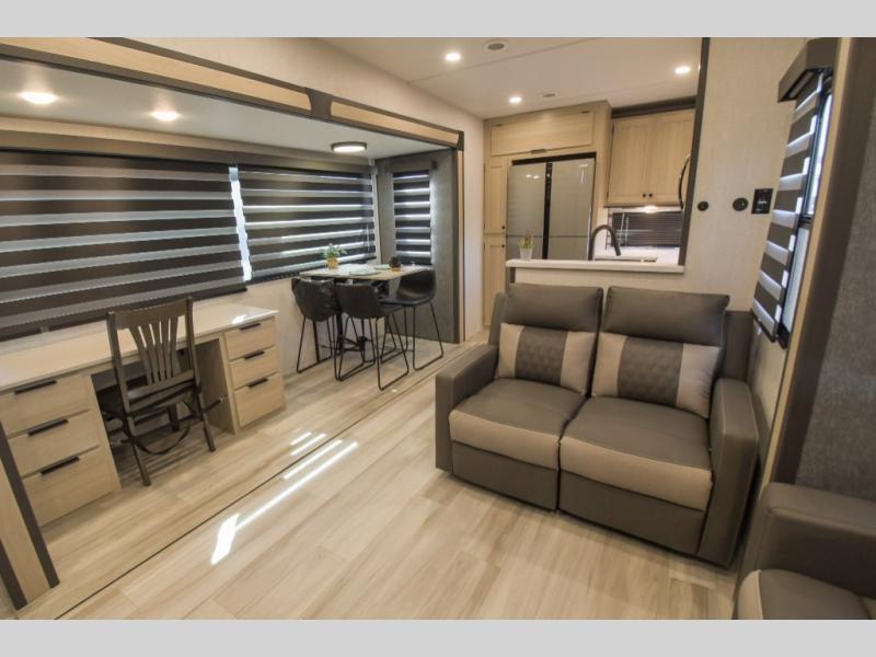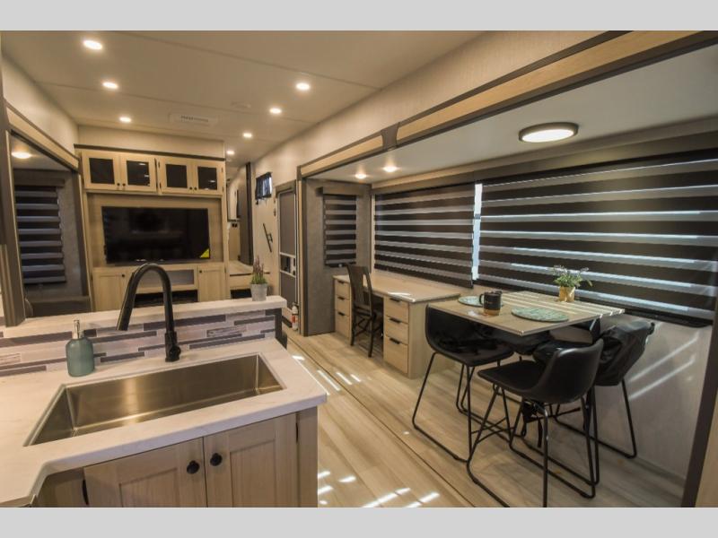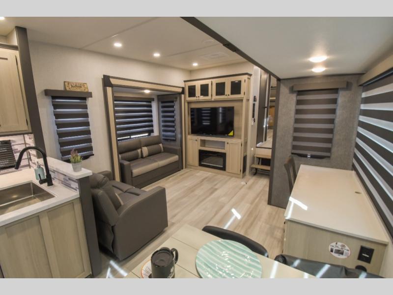 Cook like a chef worthy of a Michelin star in this amazing fifth wheel! Inside, you'll find a spacious rear kitchen, complete with a pantry, a 12V refrigerator ideal for keeping your fruits and vegetables fresh, overhead cabinets, and a sprawling countertop for all your cooking and dining times. The high-top table and chairs provide the perfect place to enjoy meals with family and friends. The living room is a cozy place featuring comfortable theater seating, a tri-fold sofa, a cozy fireplace, an entertainment center, and a convenient desk for staying productive on the go. The full bathroom is also a great place to freshen up, complete with a linen closet and all the amenities you need to take a bath and feel at home. With a spacious shower and plenty of storage, you'll have everything you need to start your day off right. The perfect place to rest and recharge after a long day of adventure is the front bedroom which boasts a comfortable king bed, dresser, walk-in wardrobe with washer and dryer prep, for keeping all your favorite belongings clean and organized on the road. Outside, you'll appreciate the pass-through storage for all your gear and toys, as well as the two awnings (15' and 11') ideal for creating unforgettable memories outside without worrying about the weather.