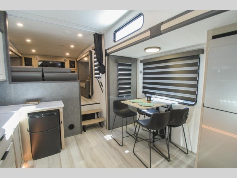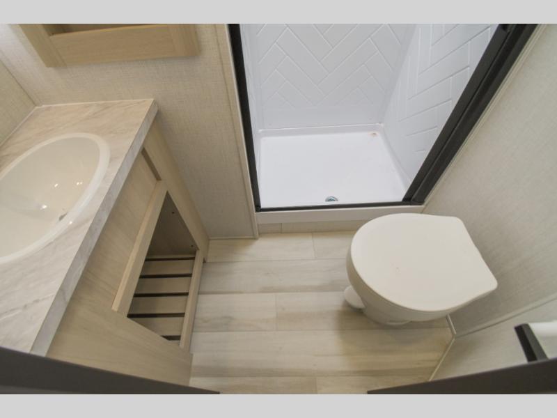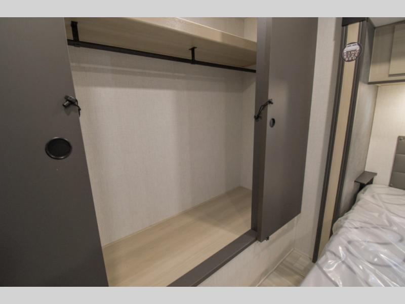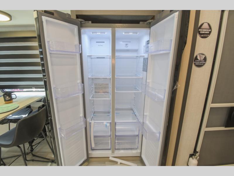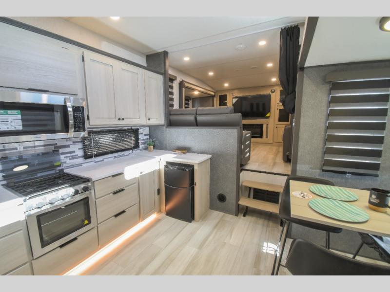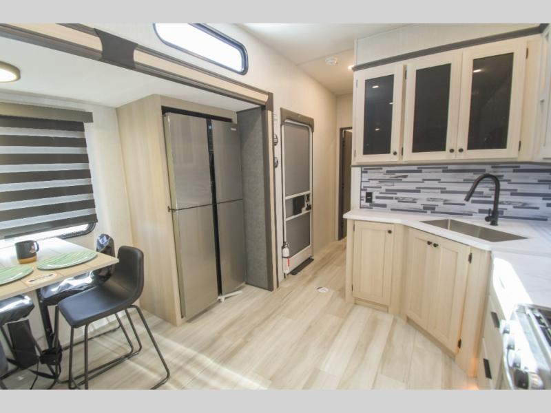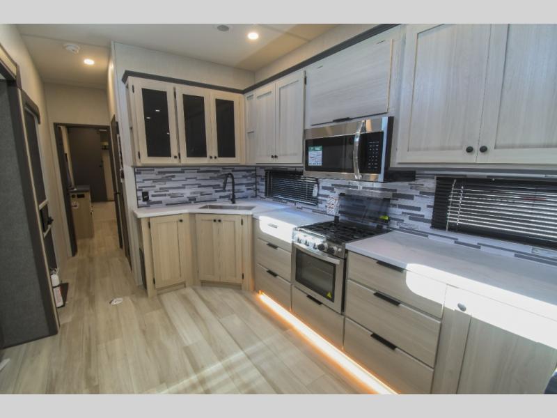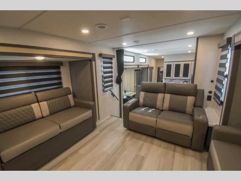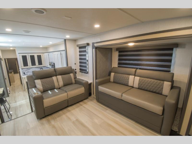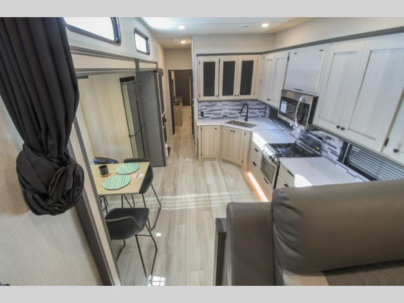 This fifth wheel is packed with features to make each trip enjoyable! The middle kitchen might be your favorite room with wrap-around counter space, a pantry, and a 16 cu. ft. 12V refrigerator for food storage. You can dine at the hi-top table and chairs here, or sit in the front living area on the dual sofas and theater seating! This area can become your guests bedroom at night since there are dual opposing slides and wardrobe storage for their things. You will also find a full-length wardrobe in the rear private bedroom, along with a king bed slide out, plus washer and dryer prep! And of course there is a full bath so everyone can stay clean each day!