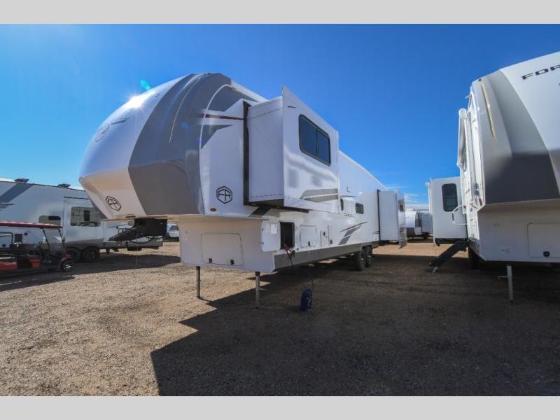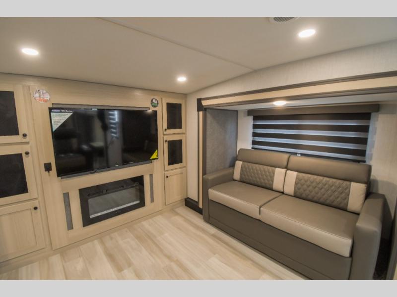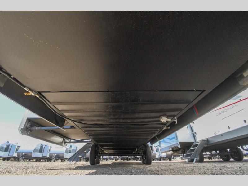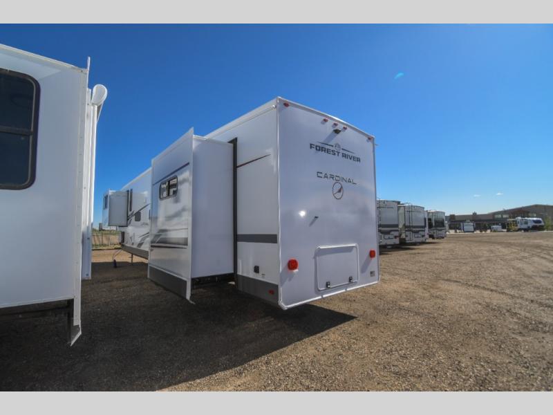 With any Cardinal fifth wheel by Forest River you will enjoy affordable luxury at every turn. These models are constructed with residential fiberglass insulation in the roof and floor, a sectioned ABS plastic underbelly armor, and a vacuum bonded, welded aluminum structure for added strength and durability. You will also find seamless roto-cast holding tanks, an outdoor shower, and 4-point auto leveling for quick and easy setup. Each model includes a best-in-class, high-efficiency 35,000 BTU furnace, along with a 18,000 BTU ducted A/C, with second and third A/C prep, plus an on-demand tankless water heater for added convenience. There are carpet-free living spaces, residential backsplash, motion lighting throughout, and many more comforts!