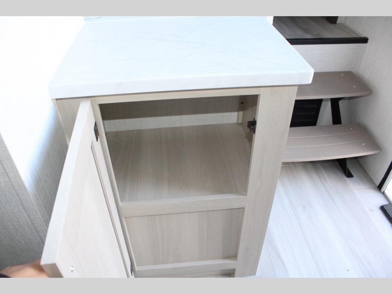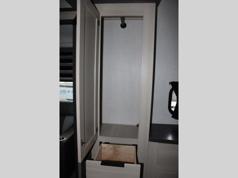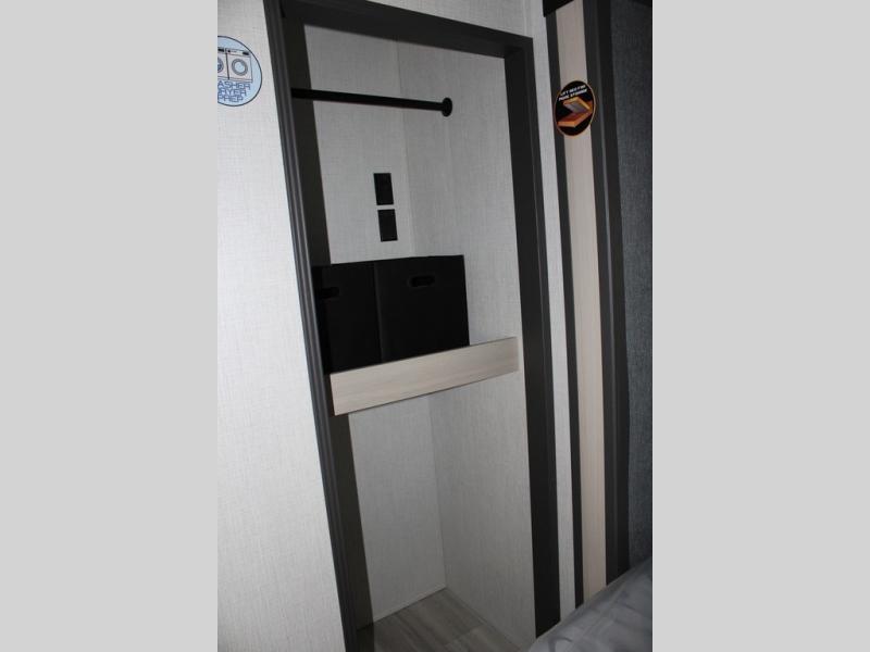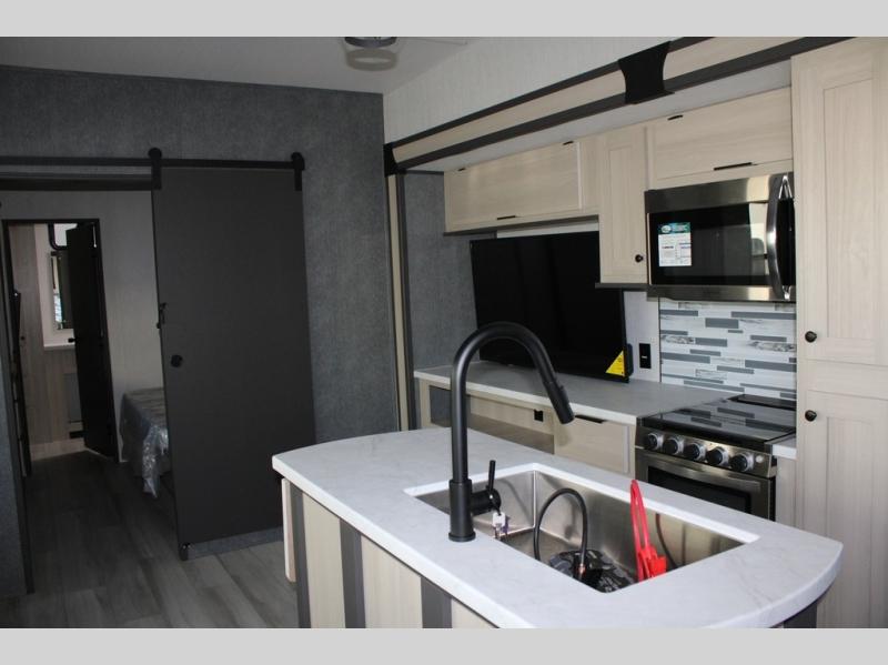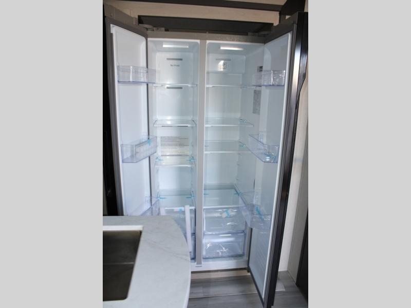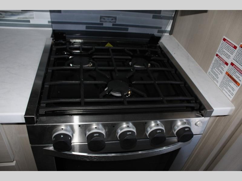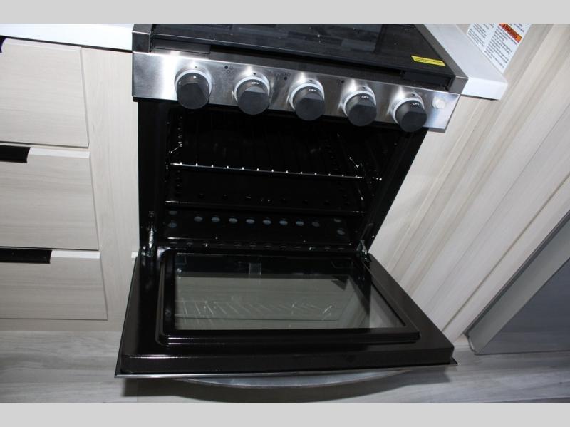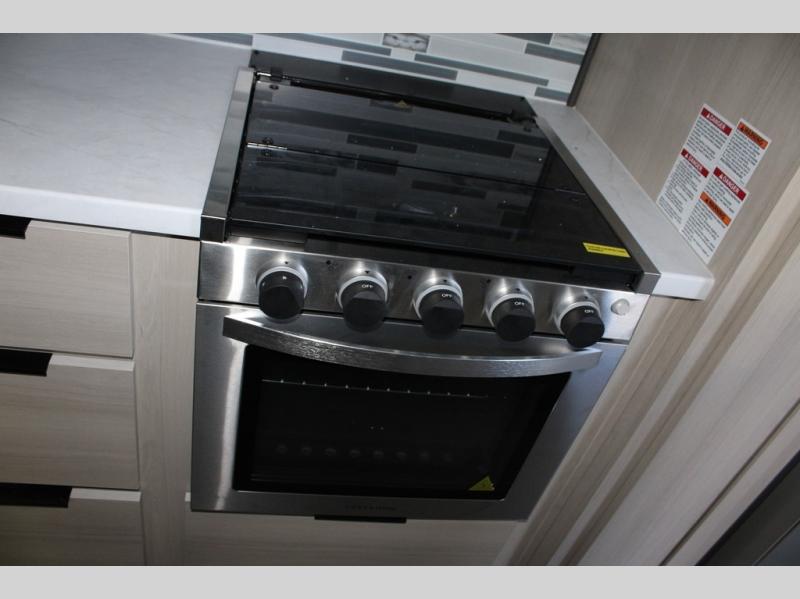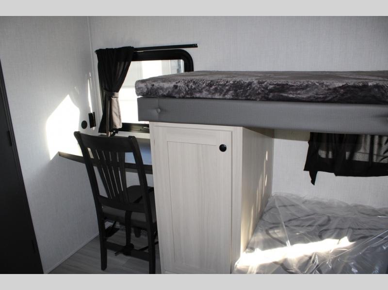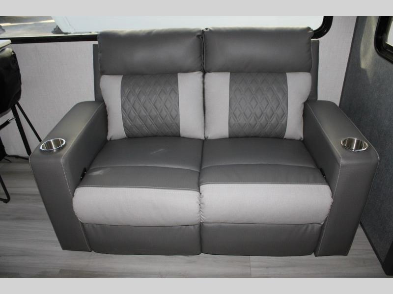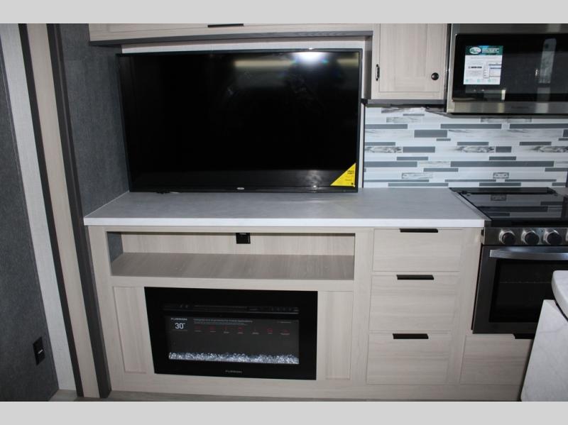 If you're ready for fun, look for further than this dual entry Cardinal fifth wheel! It will be so easy to travel with friends and family since there is a master bedroom with a king bed and a full rear bath, plus a front bunkhouse suite with bunk beds, a queen bed, and a second full bath! The chef of your crew can whip up breakfast in the morning on the 21" 2-in-1 oven range or in the over-the-range microwave. There is also a 16 cu. ft. 12V refrigerator and walk-in pantry for food storage! The theater seating and table with chairs sit across from the entertainment center and fireplace for easy viewing in the evening, or you may just find yourselves outdoors visiting with campground neighbors!