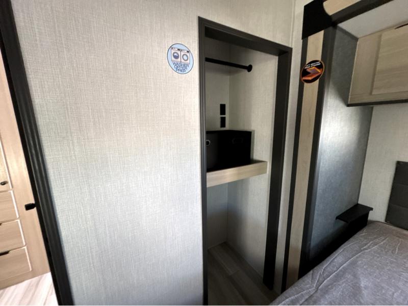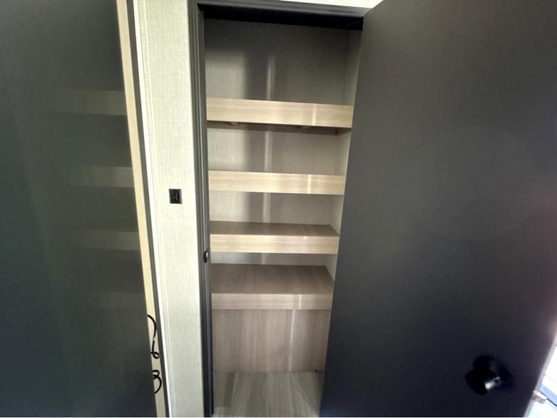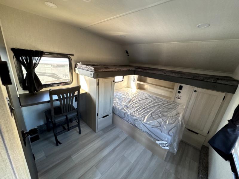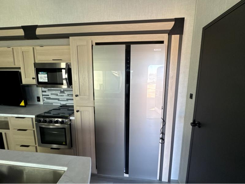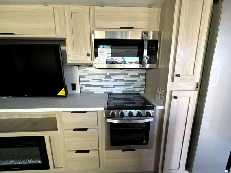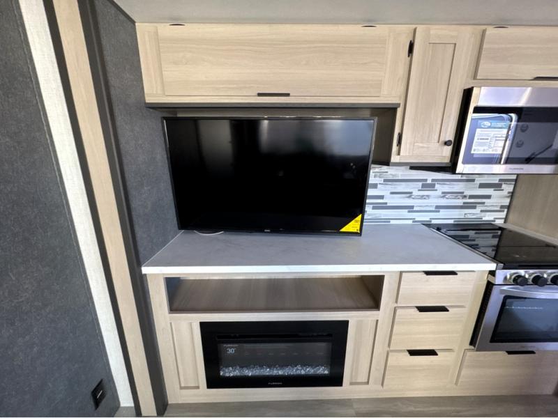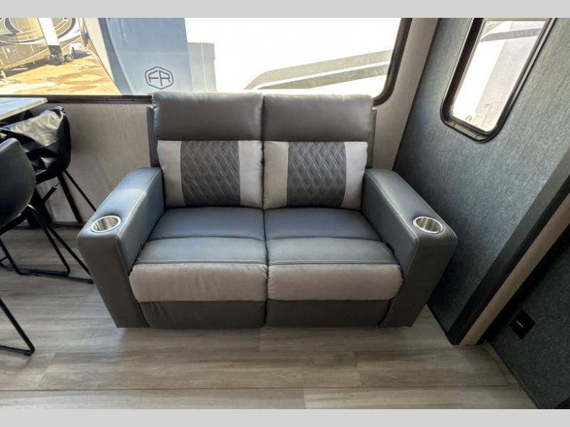 If you're ready for fun, look for further than this dual entry Cardinal fifth wheel! It will be so easy to travel with friends and family since there is a master bedroom with a king bed and a full rear bath, plus a front bunkhouse suite with bunk beds, a queen bed, and a second full bath! The chef of your crew can whip up breakfast in the morning on the 21" 2-in-1 oven range or in the over-the-range microwave. There is also a 16 cu. ft. 12V refrigerator and walk-in pantry for food storage! The theater seating and table with chairs sit across from the entertainment center and fireplace for easy viewing in the evening, or you may just find yourselves outdoors visiting with campground neighbors!