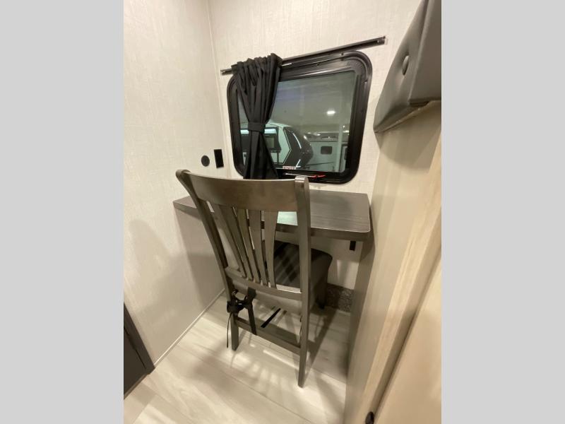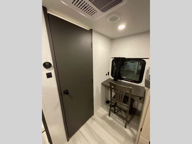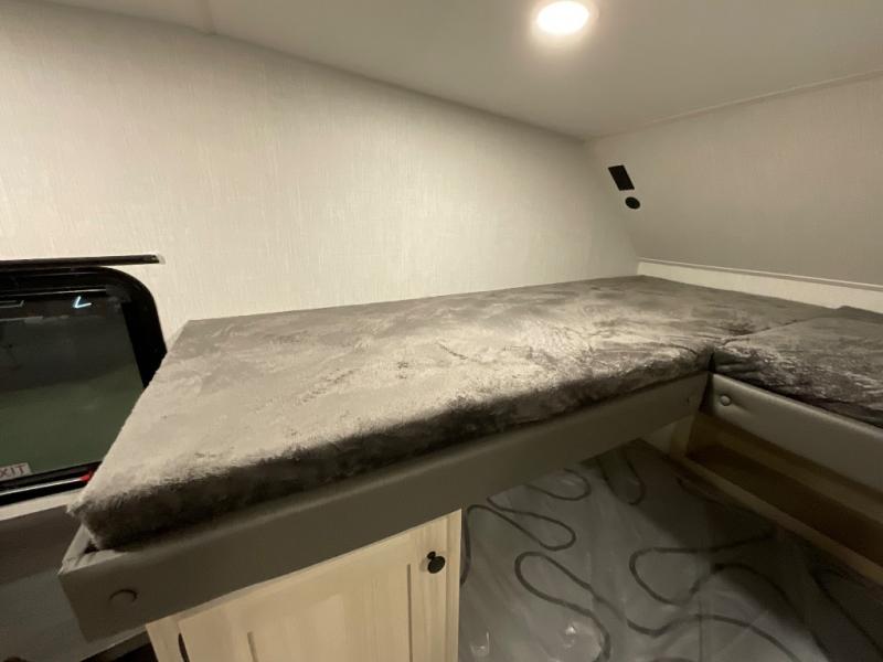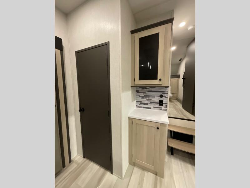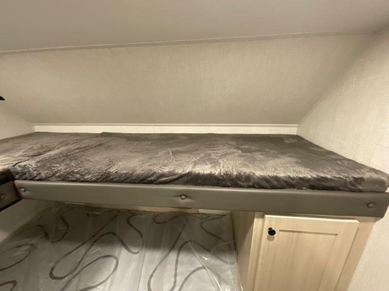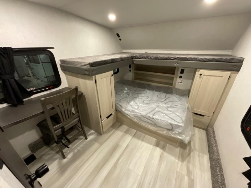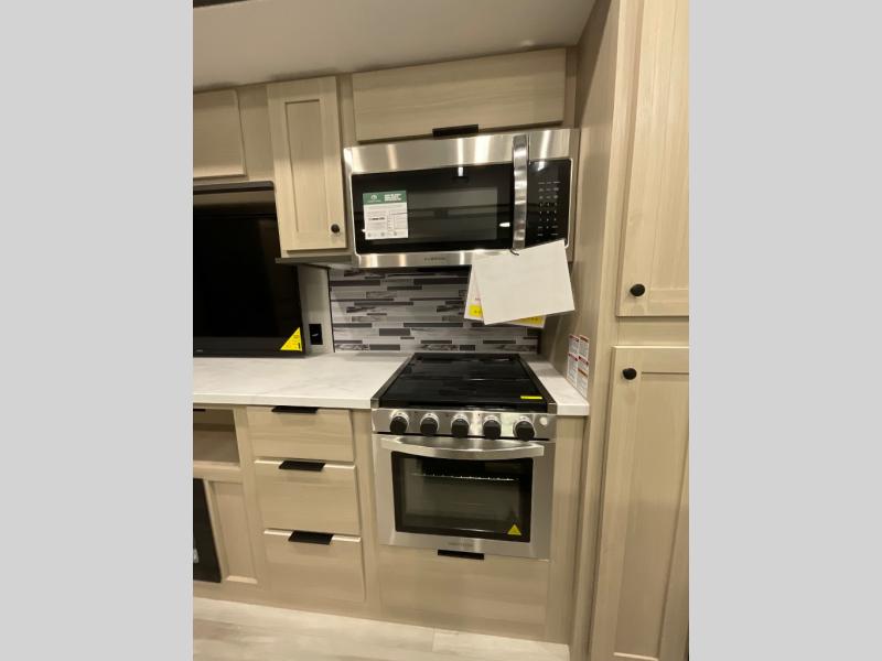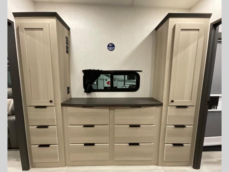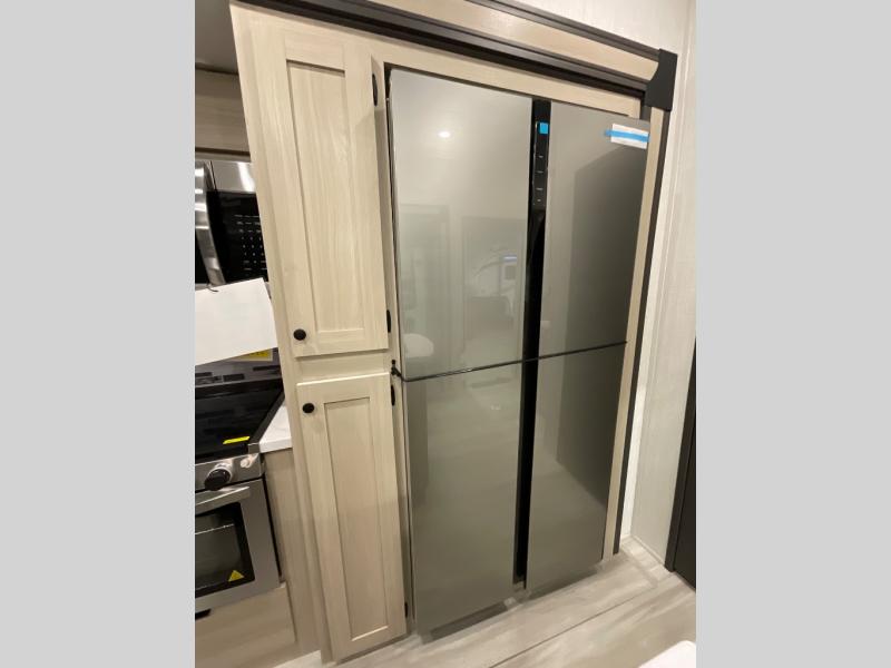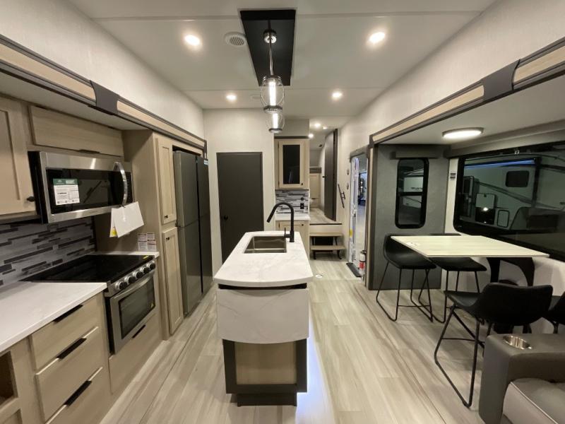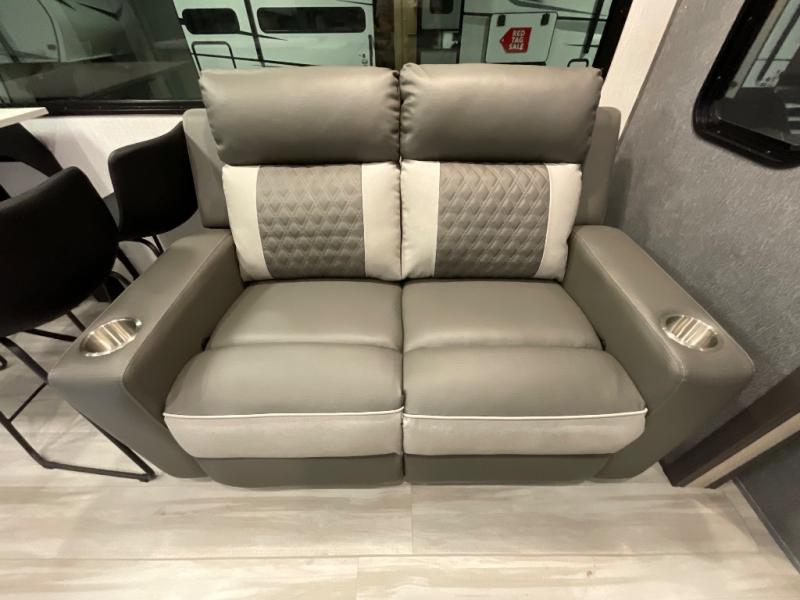 If you're ready for fun, look for further than this dual entry Cardinal fifth wheel! It will be so easy to travel with friends and family since there is a master bedroom with a king bed and a full rear bath, plus a front bunkhouse suite with bunk beds, a queen bed, and a second full bath! The chef of your crew can whip up breakfast in the morning on the 21" 2-in-1 oven range or in the over-the-range microwave. There is also a 16 cu. ft. 12V refrigerator and walk-in pantry for food storage! The theater seating and table with chairs sit across from the entertainment center and fireplace for easy viewing in the evening, or you may just find yourselves outdoors visiting with campground neighbors!