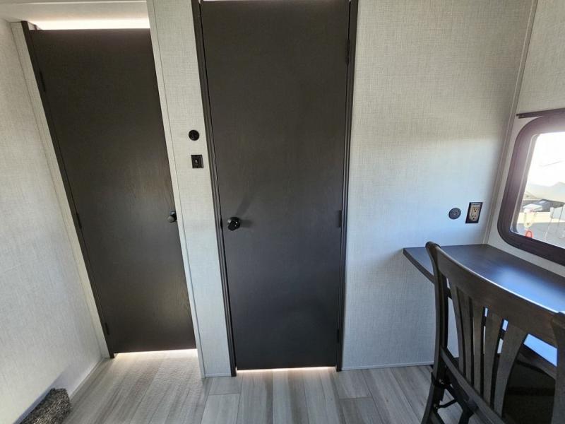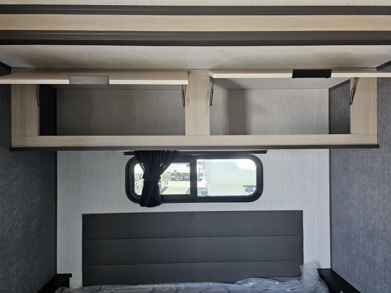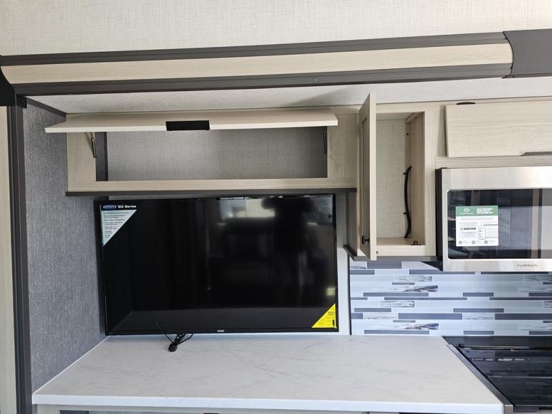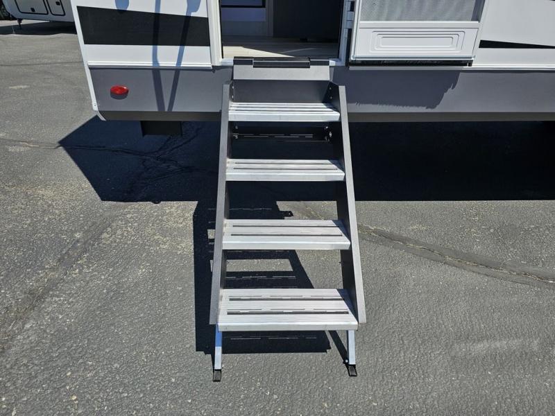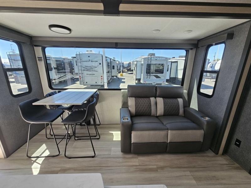 If you're ready for fun, look for further than this dual entry Cardinal fifth wheel! It will be so easy to travel with friends and family since there is a master bedroom with a king bed and a full rear bath, plus a front bunkhouse suite with bunk beds, a queen bed, and a second full bath! The chef of your crew can whip up breakfast in the morning on the 21" 2-in-1 oven range or in the over-the-range microwave. There is also a 16 cu. ft. 12V refrigerator and walk-in pantry for food storage! The theater seating and table with chairs sit across from the entertainment center and fireplace for easy viewing in the evening, or you may just find yourselves outdoors visiting with campground neighbors!