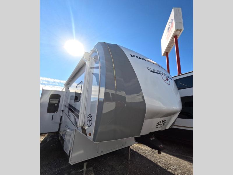 With any Cardinal fifth wheel by Forest River you will enjoy affordable luxury at every turn. These models are constructed with residential fiberglass insulation in the roof and floor, a sectioned ABS plastic underbelly armor, and a vacuum bonded, welded aluminum structure for added strength and durability. You will also find seamless roto-cast holding tanks, an outdoor shower, and 4-point auto leveling for quick and easy setup. Each model includes a best-in-class, high-efficiency 35,000 BTU furnace, along with a 18,000 BTU ducted A/C, with second and third A/C prep, plus an on-demand tankless water heater for added convenience. There are carpet-free living spaces, residential backsplash, motion lighting throughout, and many more comforts!