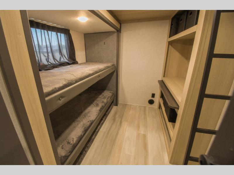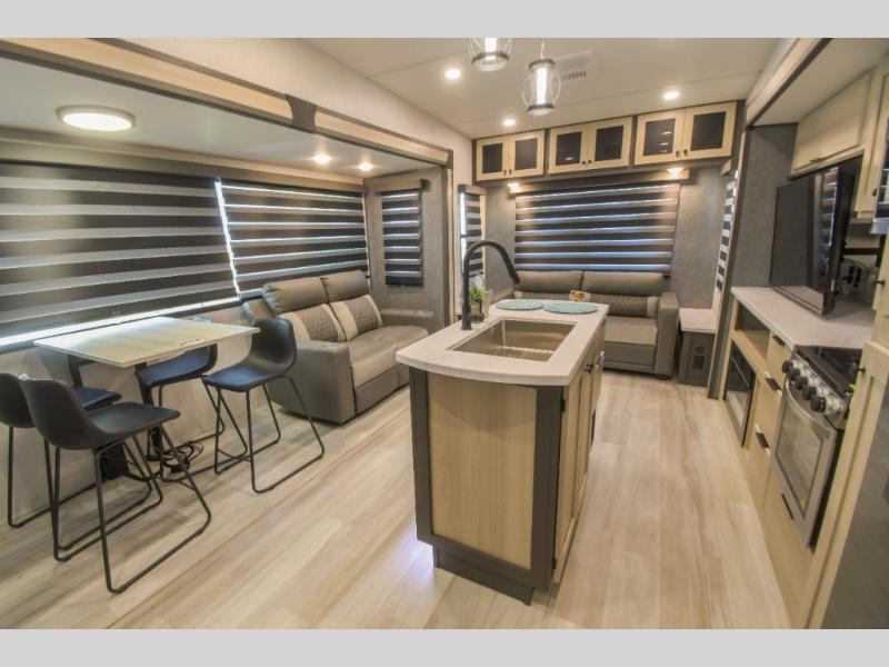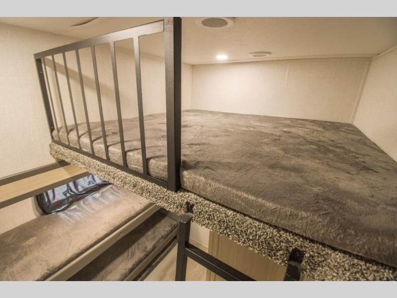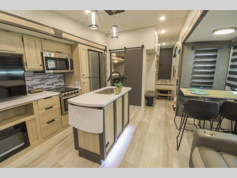 Wow! You won't believe the features found in this luxury fifth wheel that can sleep up to nine each night! Your guests or the kids will absolutely love the middle bunkroom with triple bunks and a loft above for even more sleeping or storage space. There is also a pull-out desk here, which will allow you to utilize this space as an office as well! You'll have your own space in the front private bedroom on the king bed slide out, and there is a walk-in wardrobe to keep your clothes tidy. There is even washer and dryer prep for the option to keep those clothes clean! The chef of your group will have everything they need to prepare meals, including a 21" 2-in-1 oven range, an over-the-range microwave, a 16 cu. ft. 12V refrigerator, plus a kitchen island for more counter space. In the evenings, your crew can get cozy on the rear sofa and theater seats across from the entertainment center and fireplace, or you might just play a game at the hi-top table and chairs!