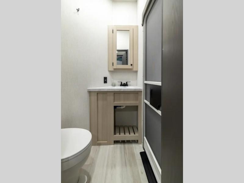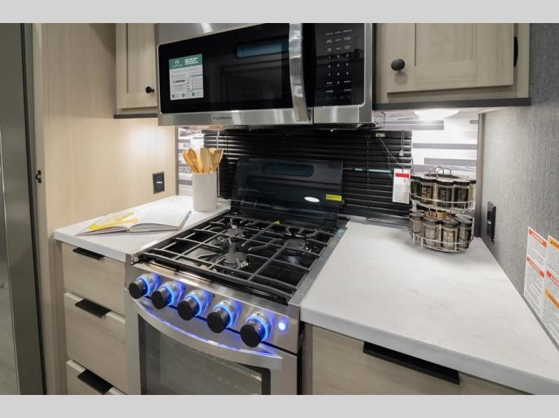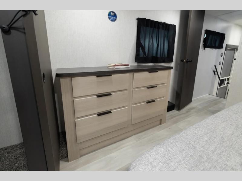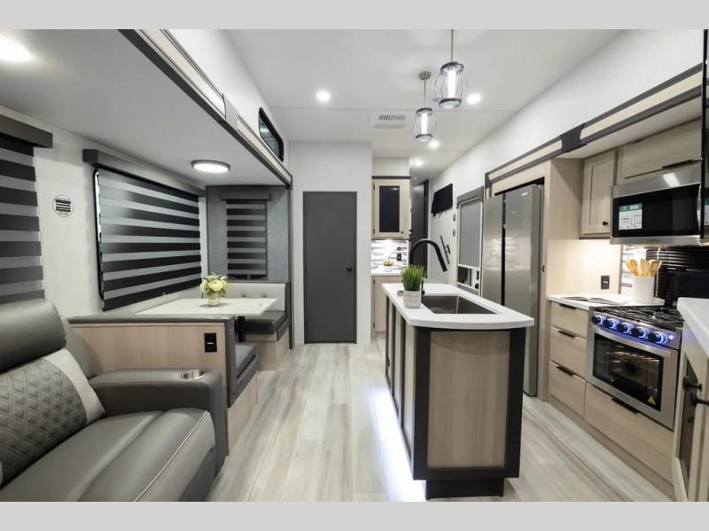 With any Cardinal fifth wheel by Forest River you will enjoy affordable luxury at every turn. These models are constructed with residential fiberglass insulation in the roof and floor, a sectioned ABS plastic underbelly armor, and a vacuum bonded, welded aluminum structure for added strength and durability. You will also find seamless roto-cast holding tanks, an outdoor shower, and 4-point auto leveling for quick and easy setup. Each model includes a best-in-class, high-efficiency 35,000 BTU furnace, along with a 13,500 BTU ducted A/C, with second and third A/C prep, plus an on-demand tankless water heater for added convenience. There are carpet-free living spaces, residential backsplash, motion lighting throughout, and many more comforts!