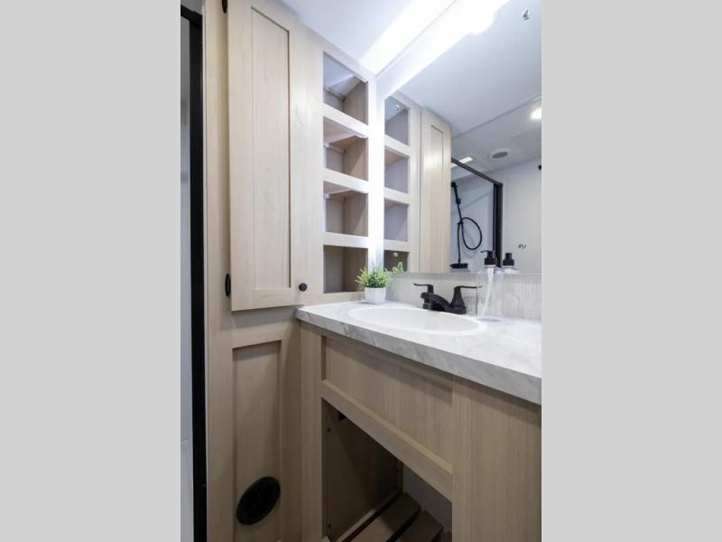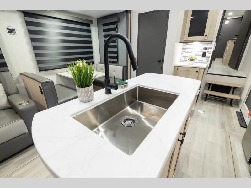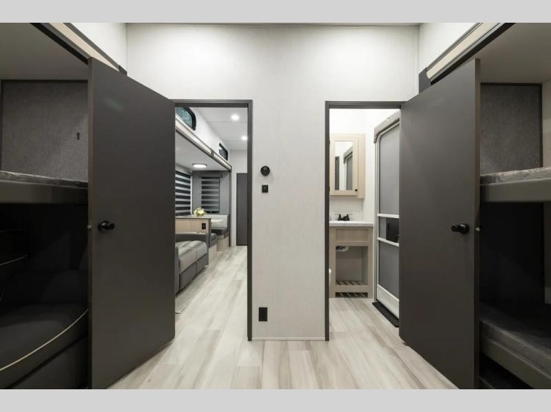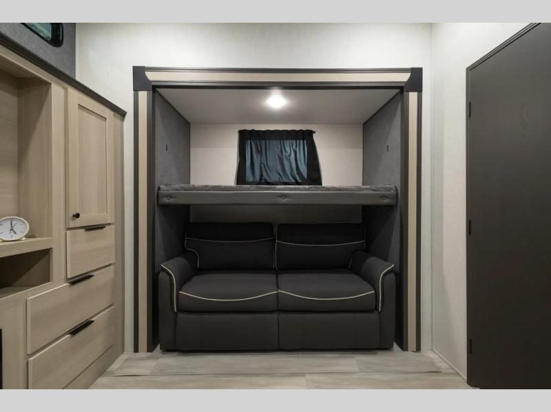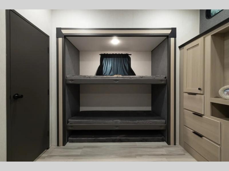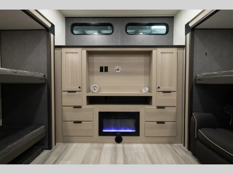 This fifth wheel's name describes it perfectly; it's the best! Your guests will love the rear private bunkhouse with dual opposing slides, bunk beds, plus a hide-a-bed sofa and an entertainment center with dual wardrobes. There is even a half bath with its own exterior entry door! You will have the front private bedroom all to yourselves with a king bed slide out and a walk-in wardrobe with washer and dryer prep. And the full bath is close by for easy nighttime use. The combined middle kitchen and living room will be a space everyone can meet in since there is a hi-top table and chairs and theater seating, an entertainment center with a fireplace, plus a kitchen island where snacks can be set out.