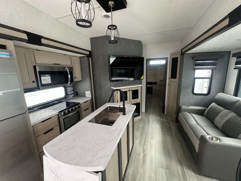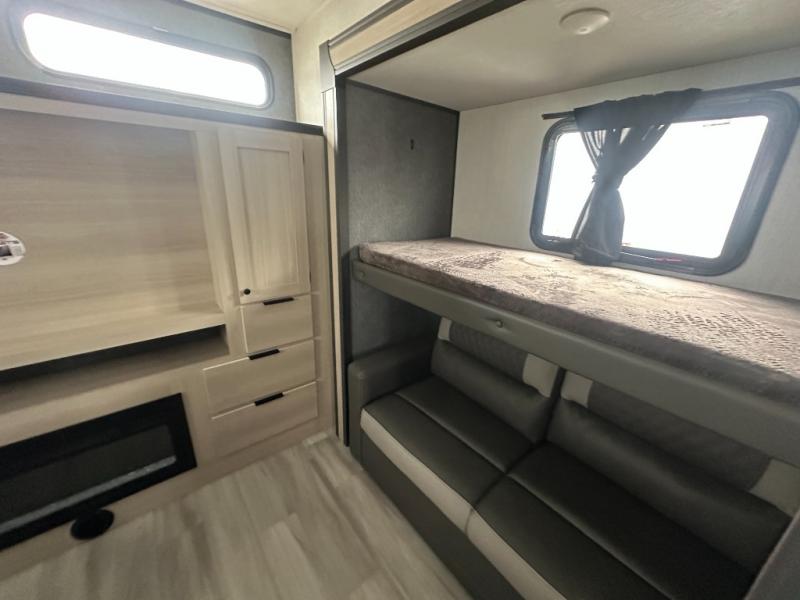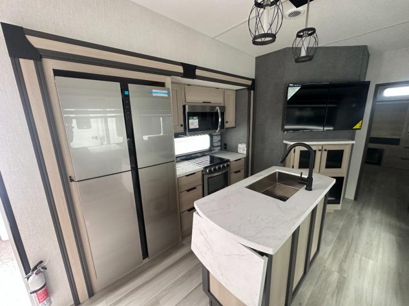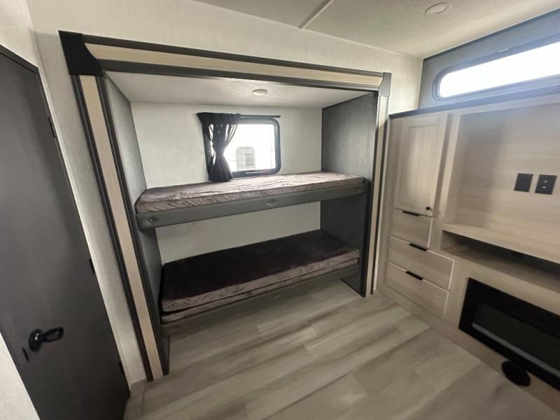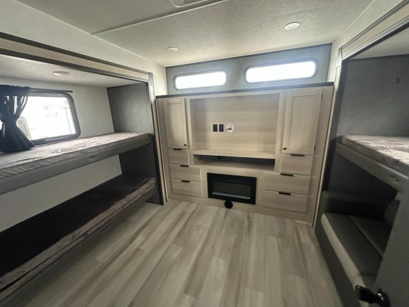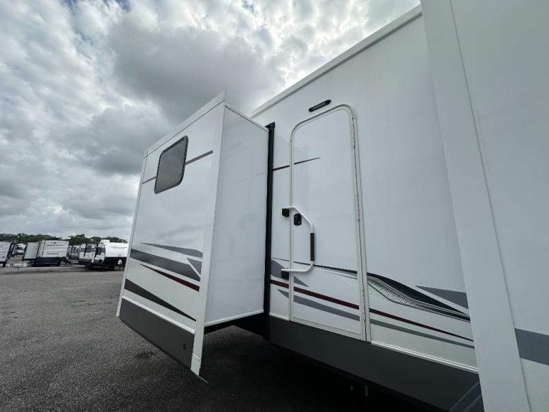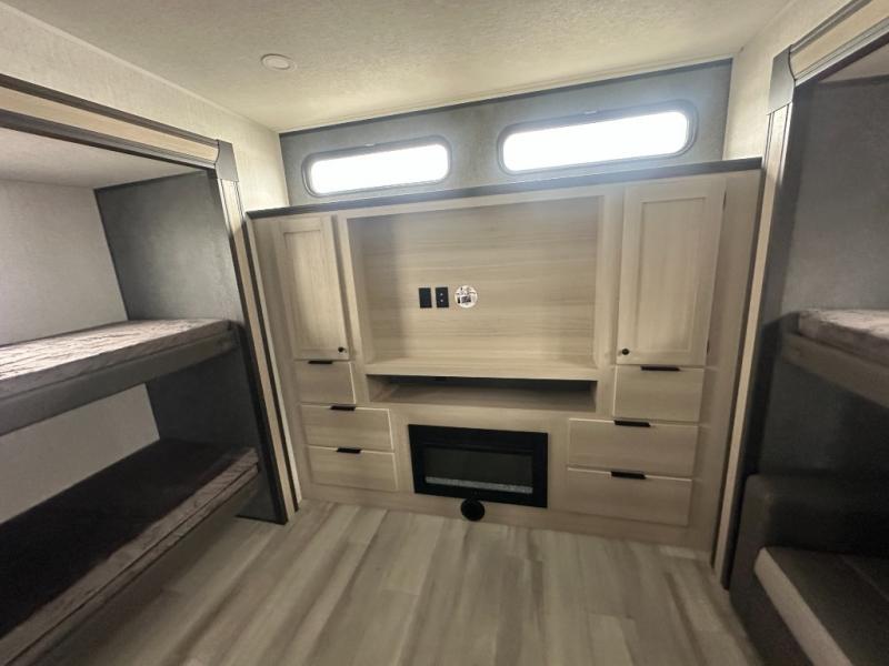 This fifth wheel's name describes it perfectly; it's the best! Your guests will love the rear private bunkhouse with dual opposing slides, bunk beds, plus a hide-a-bed sofa and an entertainment center with dual wardrobes. There is even a half bath with its own exterior entry door! You will have the front private bedroom all to yourselves with a king bed slide out and a walk-in wardrobe with washer and dryer prep. And the full bath is close by for easy nighttime use. The combined middle kitchen and living room will be a space everyone can meet in since there is a hi-top table and chairs and theater seating, an entertainment center with a fireplace, plus a kitchen island where snacks can be set out.