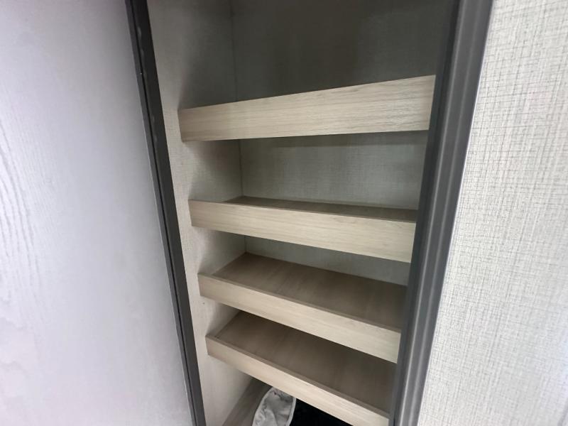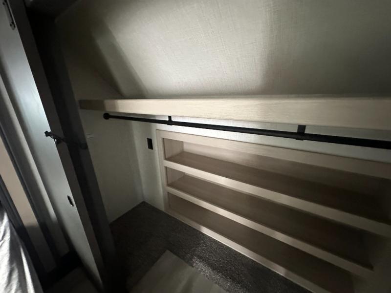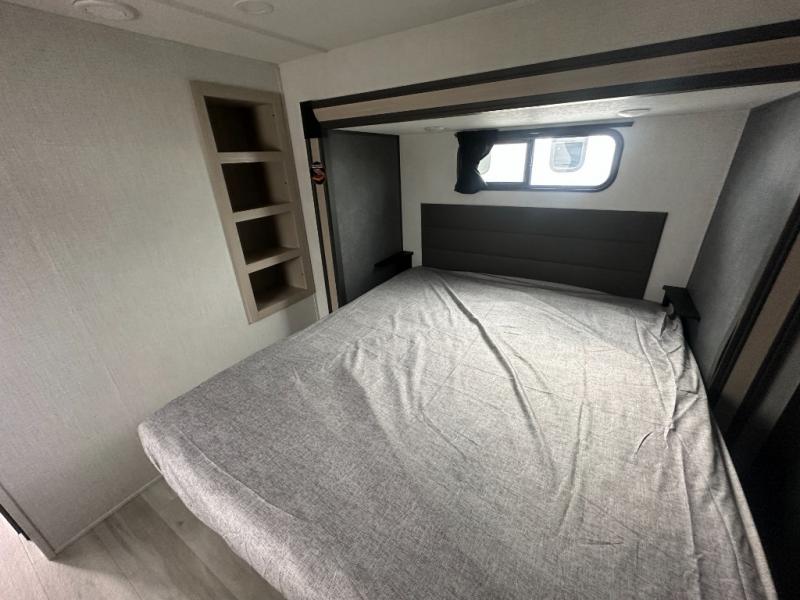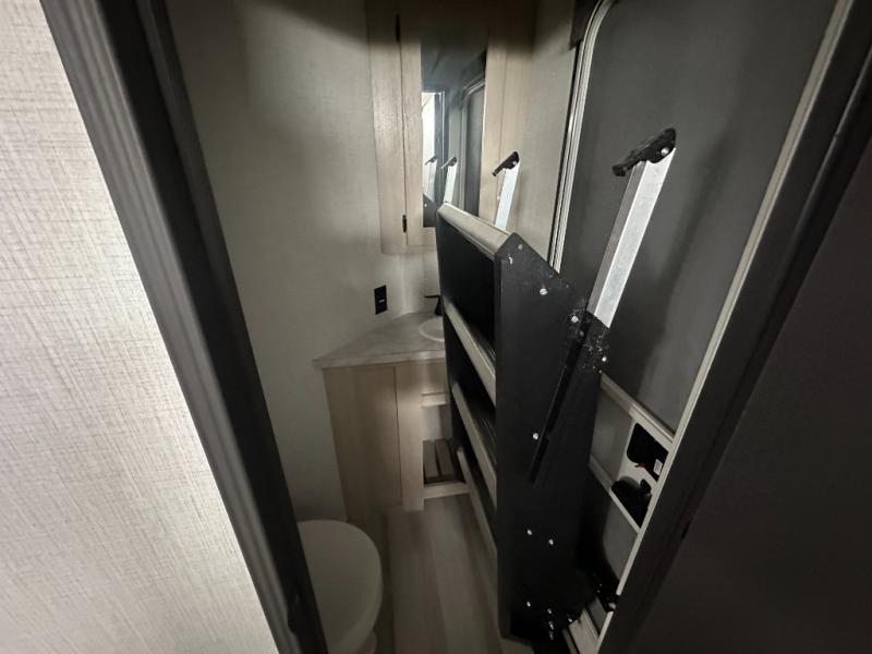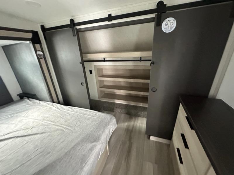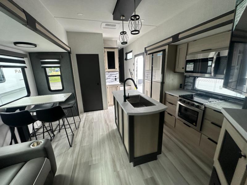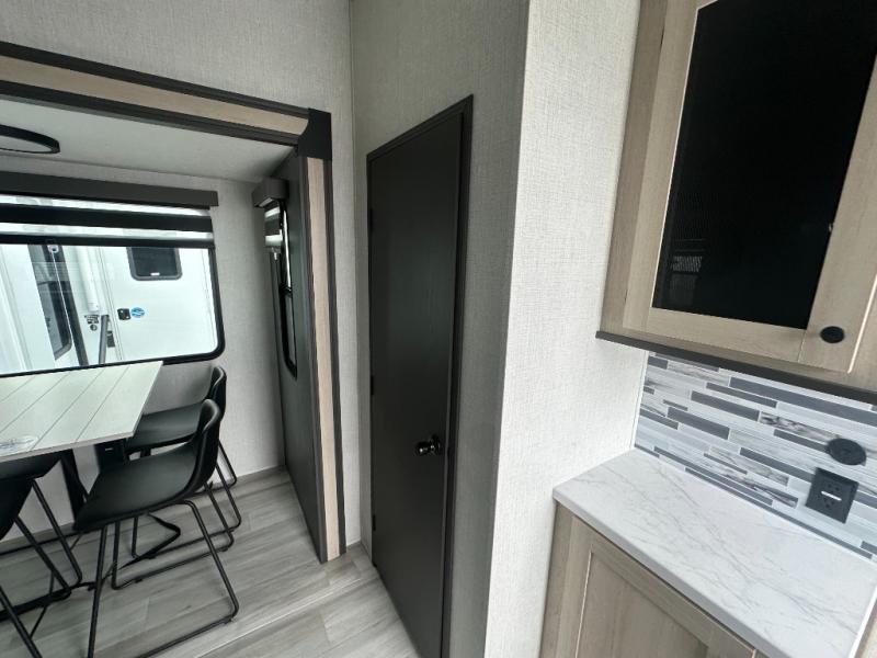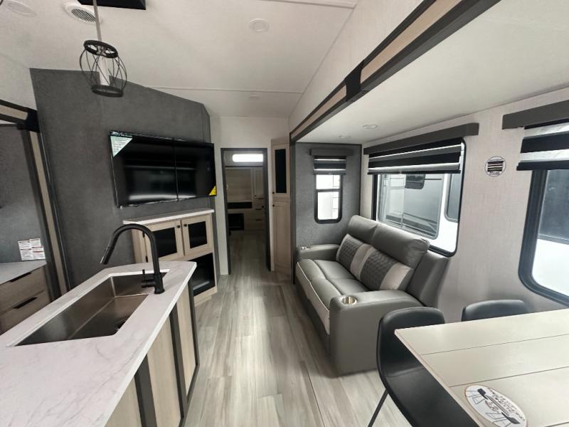 This fifth wheel's name describes it perfectly; it's the best! Your guests will love the rear private bunkhouse with dual opposing slides, bunk beds, plus a hide-a-bed sofa and an entertainment center with dual wardrobes. There is even a half bath with its own exterior entry door! You will have the front private bedroom all to yourselves with a king bed slide out and a walk-in wardrobe with washer and dryer prep. And the full bath is close by for easy nighttime use. The combined middle kitchen and living room will be a space everyone can meet in since there is a hi-top table and chairs and theater seating, an entertainment center with a fireplace, plus a kitchen island where snacks can be set out.