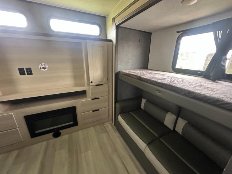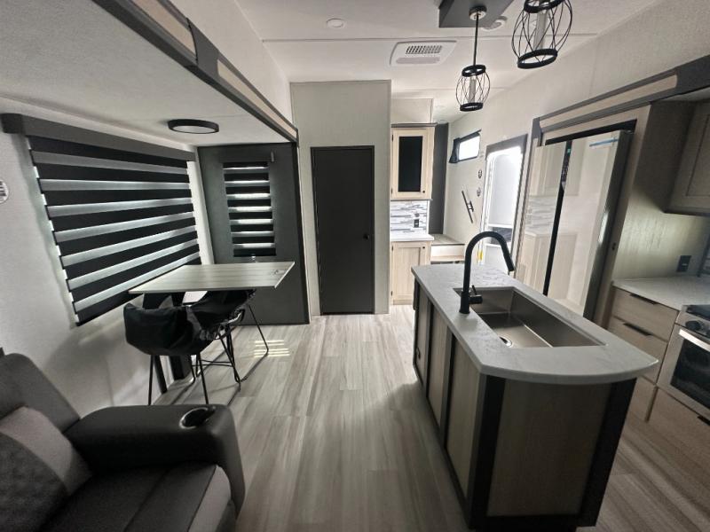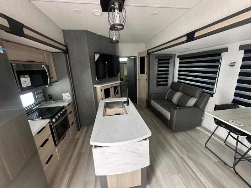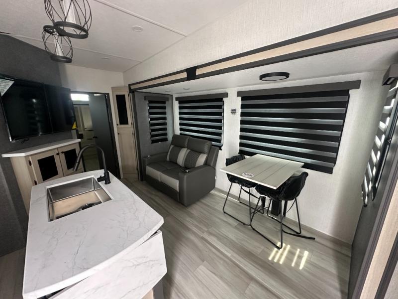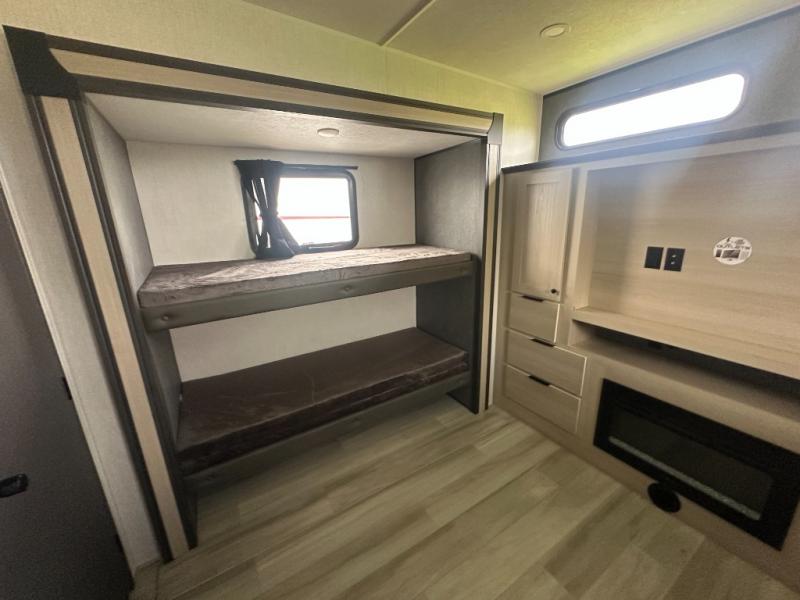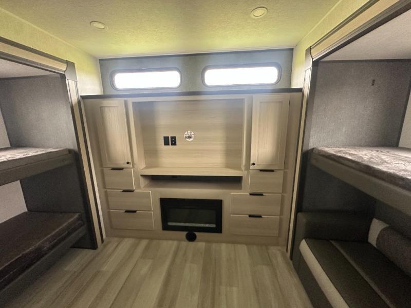 This fifth wheel's name describes it perfectly; it's the best! Your guests will love the rear private bunkhouse with dual opposing slides, bunk beds, plus a hide-a-bed sofa and an entertainment center with dual wardrobes. There is even a half bath with its own exterior entry door! You will have the front private bedroom all to yourselves with a king bed slide out and a walk-in wardrobe with washer and dryer prep. And the full bath is close by for easy nighttime use. The combined middle kitchen and living room will be a space everyone can meet in since there is a hi-top table and chairs and theater seating, an entertainment center with a fireplace, plus a kitchen island where snacks can be set out.