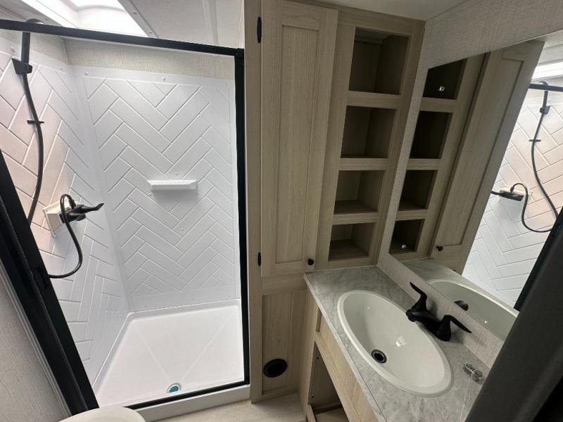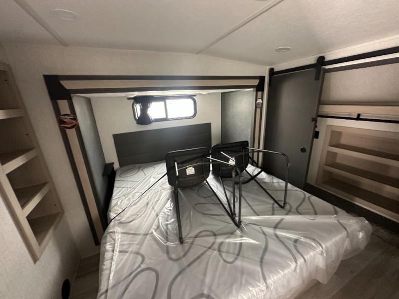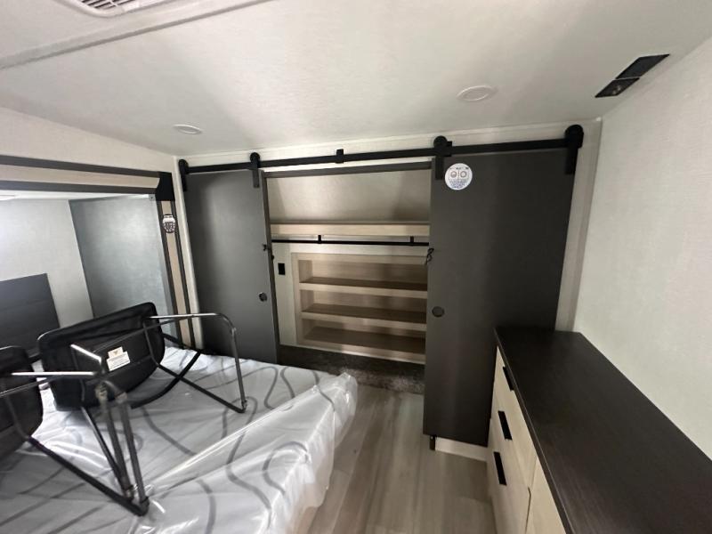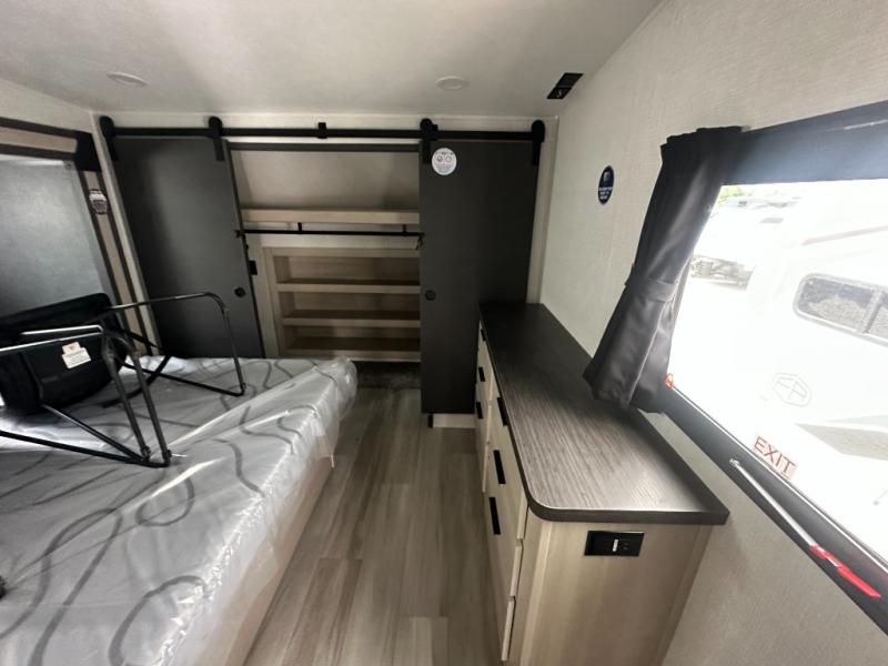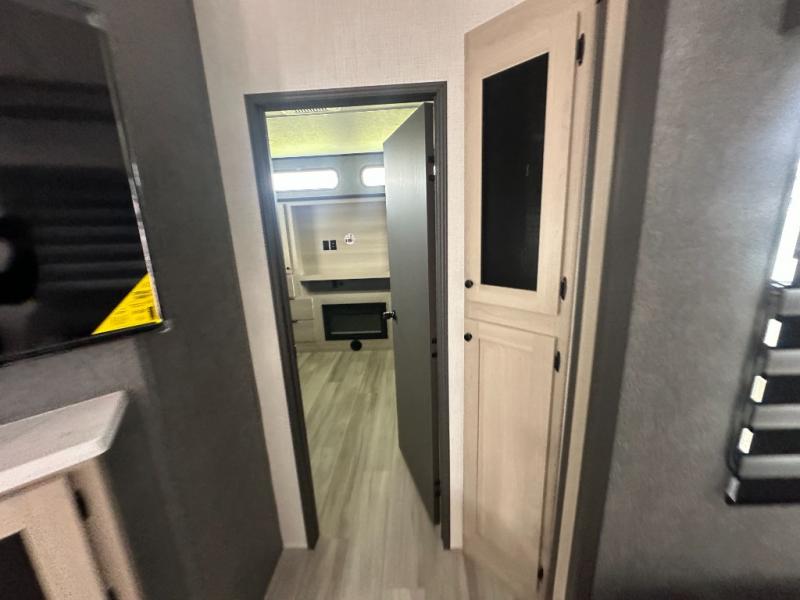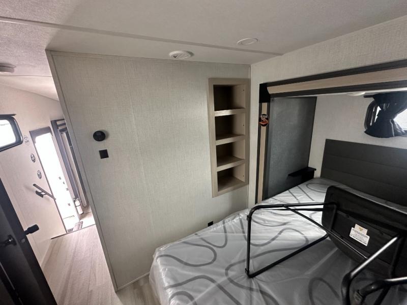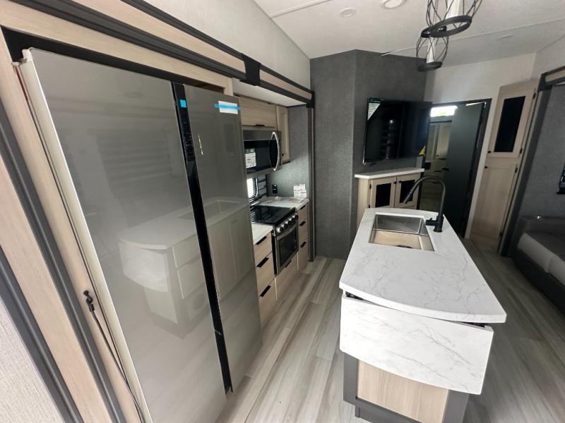 This fifth wheel's name describes it perfectly; it's the best! Your guests will love the rear private bunkhouse with dual opposing slides, bunk beds, plus a hide-a-bed sofa and an entertainment center with dual wardrobes. There is even a half bath with its own exterior entry door! You will have the front private bedroom all to yourselves with a king bed slide out and a walk-in wardrobe with washer and dryer prep. And the full bath is close by for easy nighttime use. The combined middle kitchen and living room will be a space everyone can meet in since there is a hi-top table and chairs and theater seating, an entertainment center with a fireplace, plus a kitchen island where snacks can be set out.