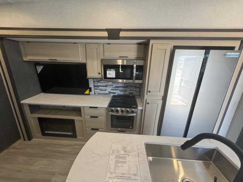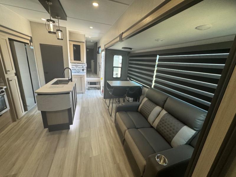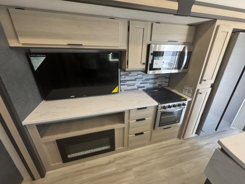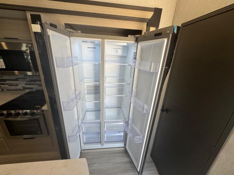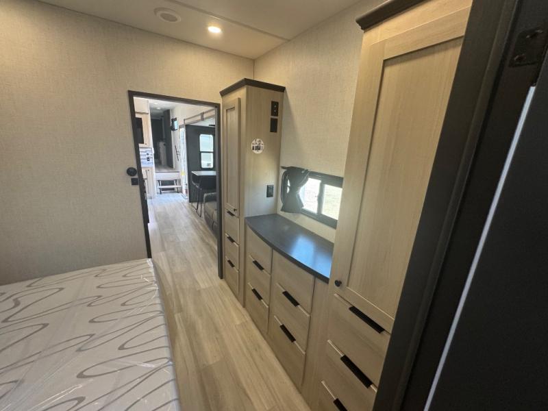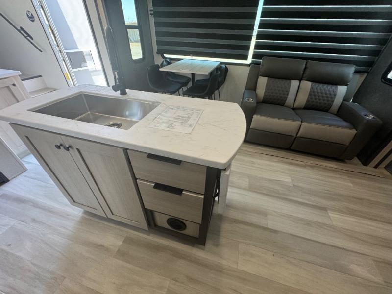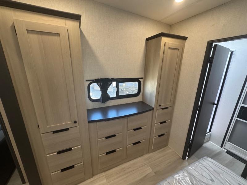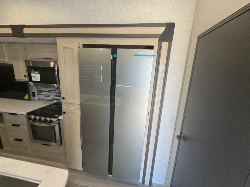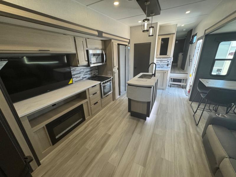 With two full baths, two bedrooms, and two entry doors, this fifth wheel is packed with comfort! The front bedroom includes a queen bed slide out, dresser, and front walk-in wardrobe with washer and dryer prep. And there is a full bath close by for easy access. You'll find another queen bed slide in the rear master bedroom, along with dual wardrobes and a dresser, plus a full rear bath with its own exterior entry door. In the morning, everyone can meet in the middle kitchen and living room while the chef prepares breakfast with the 21" 2-in-1 oven. There is a hi-top table and chairs for dining, theater seating for relaxing, and a flip-up counter at the island for even more counter space. You can set up your Keurig machine at the coffee bar, and the two pantries plus 16 cu. ft. 12V refrigerator will allow you to keep food stocked!