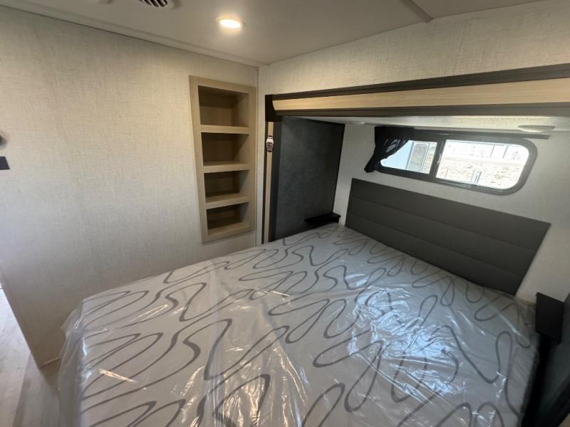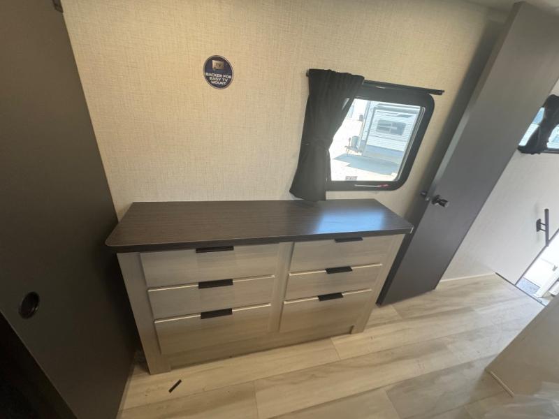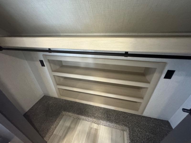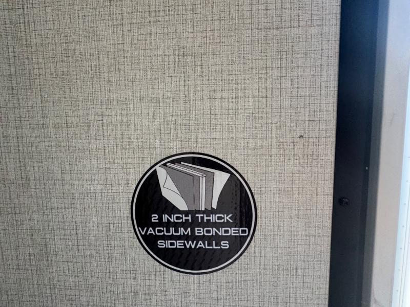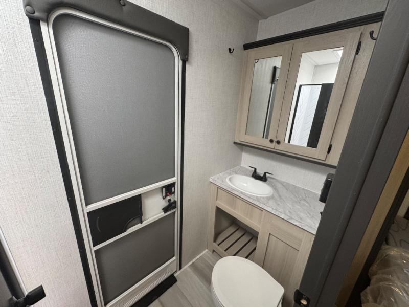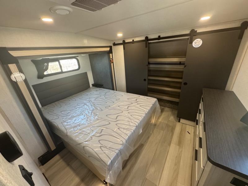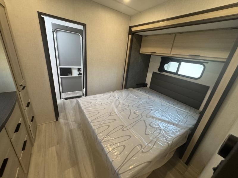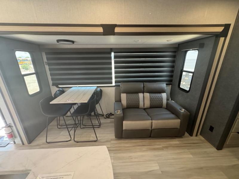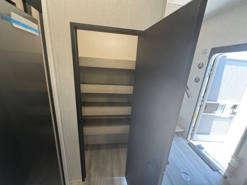 With two full baths, two bedrooms, and two entry doors, this fifth wheel is packed with comfort! The front bedroom includes a queen bed slide out, dresser, and front walk-in wardrobe with washer and dryer prep. And there is a full bath close by for easy access. You'll find another queen bed slide in the rear master bedroom, along with dual wardrobes and a dresser, plus a full rear bath with its own exterior entry door. In the morning, everyone can meet in the middle kitchen and living room while the chef prepares breakfast with the 21" 2-in-1 oven. There is a hi-top table and chairs for dining, theater seating for relaxing, and a flip-up counter at the island for even more counter space. You can set up your Keurig machine at the coffee bar, and the two pantries plus 16 cu. ft. 12V refrigerator will allow you to keep food stocked!