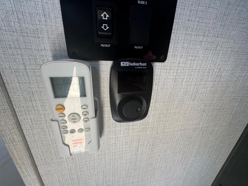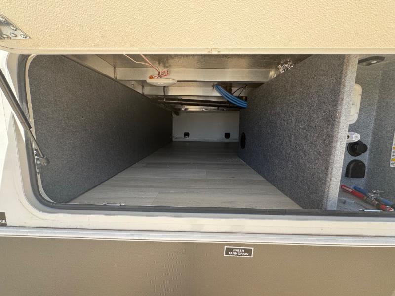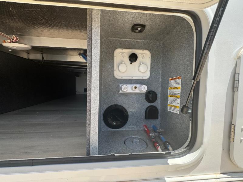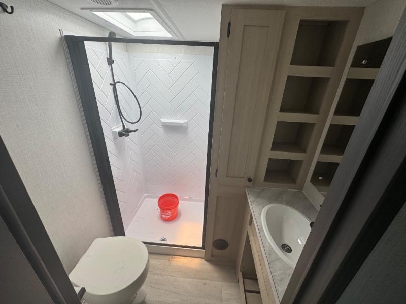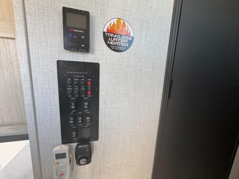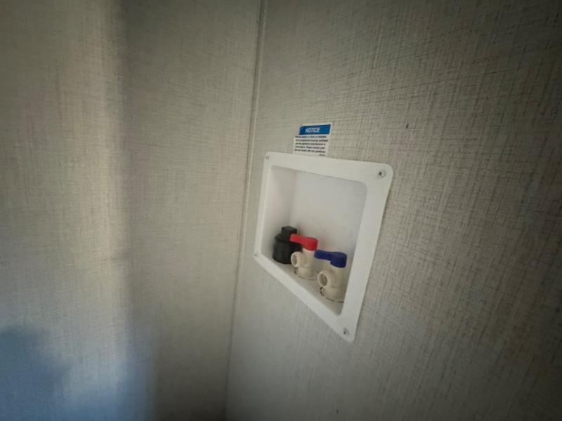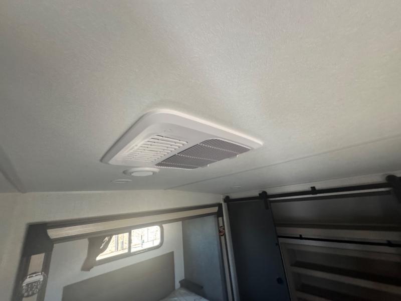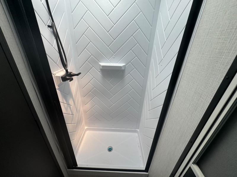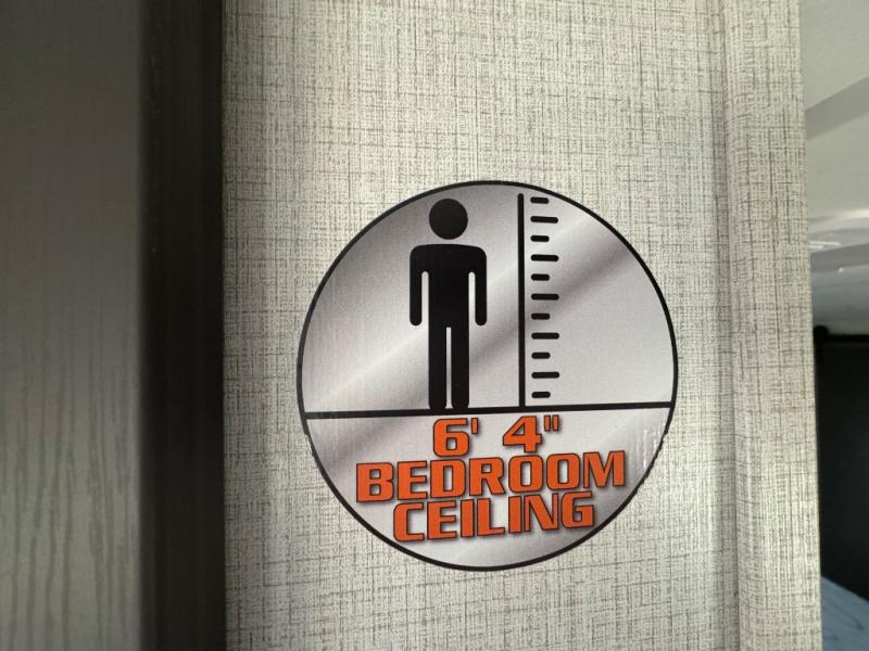 With two full baths, two bedrooms, and two entry doors, this fifth wheel is packed with comfort! The front bedroom includes a queen bed slide out, dresser, and front walk-in wardrobe with washer and dryer prep. And there is a full bath close by for easy access. You'll find another queen bed slide in the rear master bedroom, along with dual wardrobes and a dresser, plus a full rear bath with its own exterior entry door. In the morning, everyone can meet in the middle kitchen and living room while the chef prepares breakfast with the 21" 2-in-1 oven. There is a hi-top table and chairs for dining, theater seating for relaxing, and a flip-up counter at the island for even more counter space. You can set up your Keurig machine at the coffee bar, and the two pantries plus 16 cu. ft. 12V refrigerator will allow you to keep food stocked!