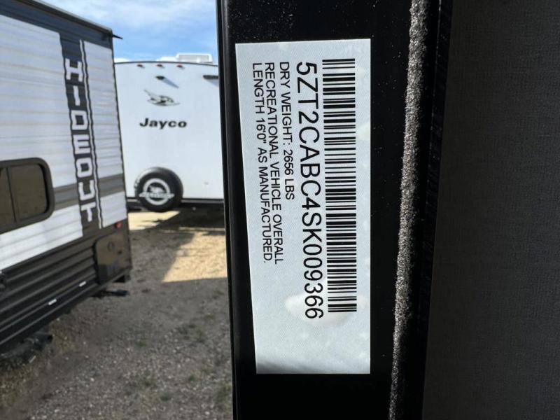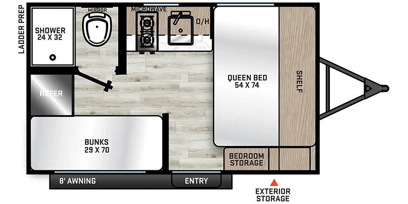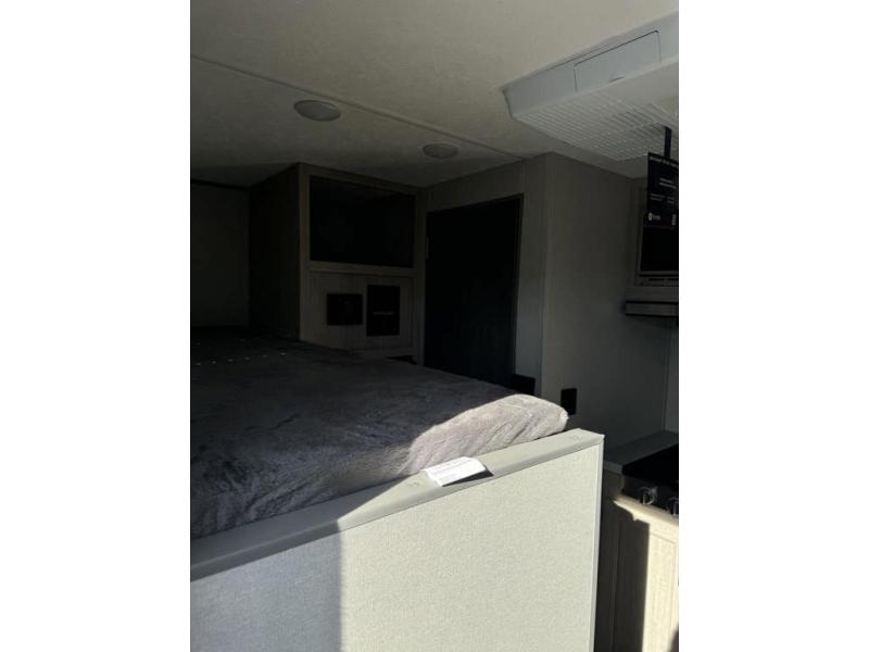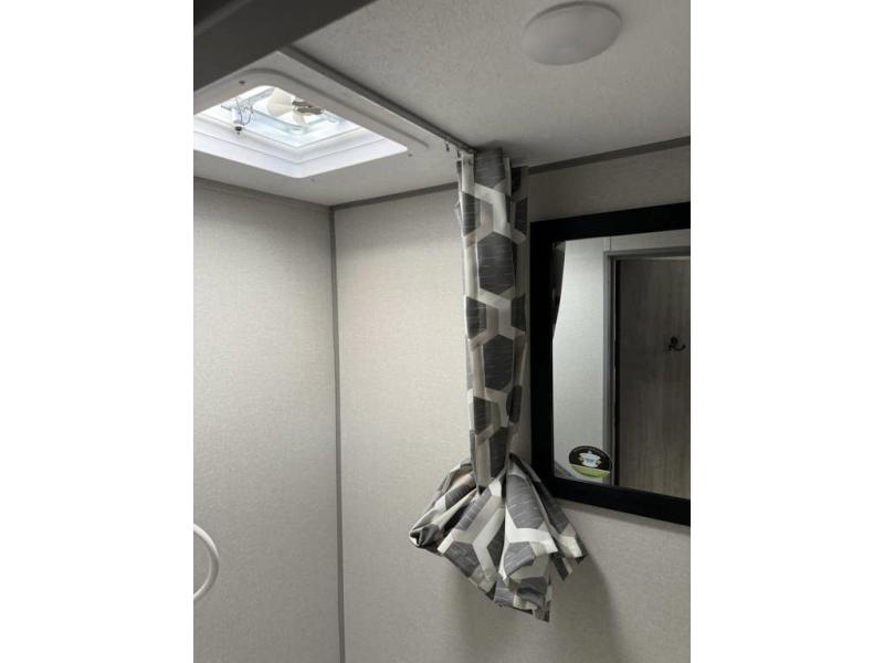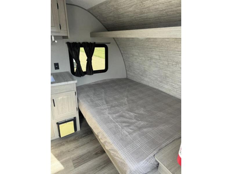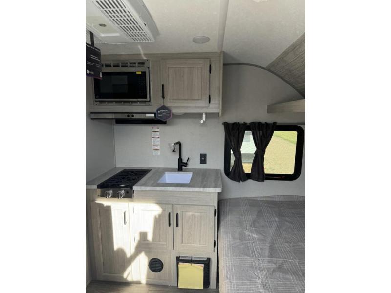 Lightweight camping is easier than you think with this travel trailer in tow! The front 54" x 74" queen bed will provide a great night's rest each night, while the little ones or your guests take the bunk beds. There is a handy shelf above the front bed for your belongings plus additional bedroom storage. A private bath includes a 24" x 32" shower and a toilet with a mirror behind it so you can freshen up each day. You'll also find a two burner cooktop and microwave oven to make meals each day plus a 3.3 cu. ft. 12V refrigerator for food storage!
